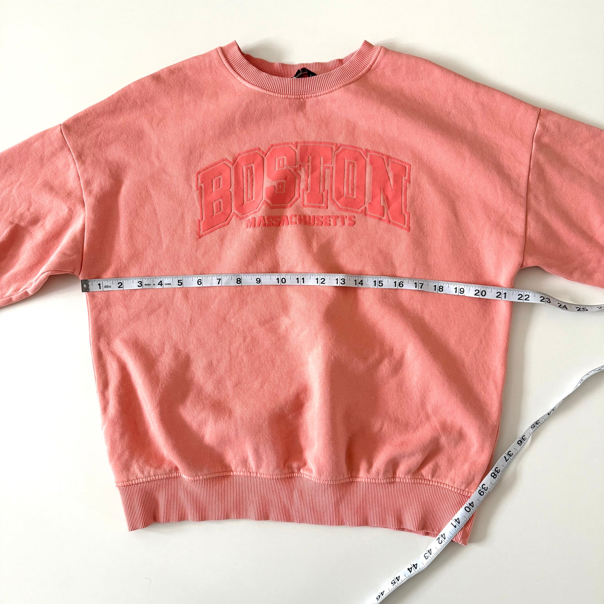 Secondhand pink sweatshirt with Boston Massachusetts, in collegiate font on the front.