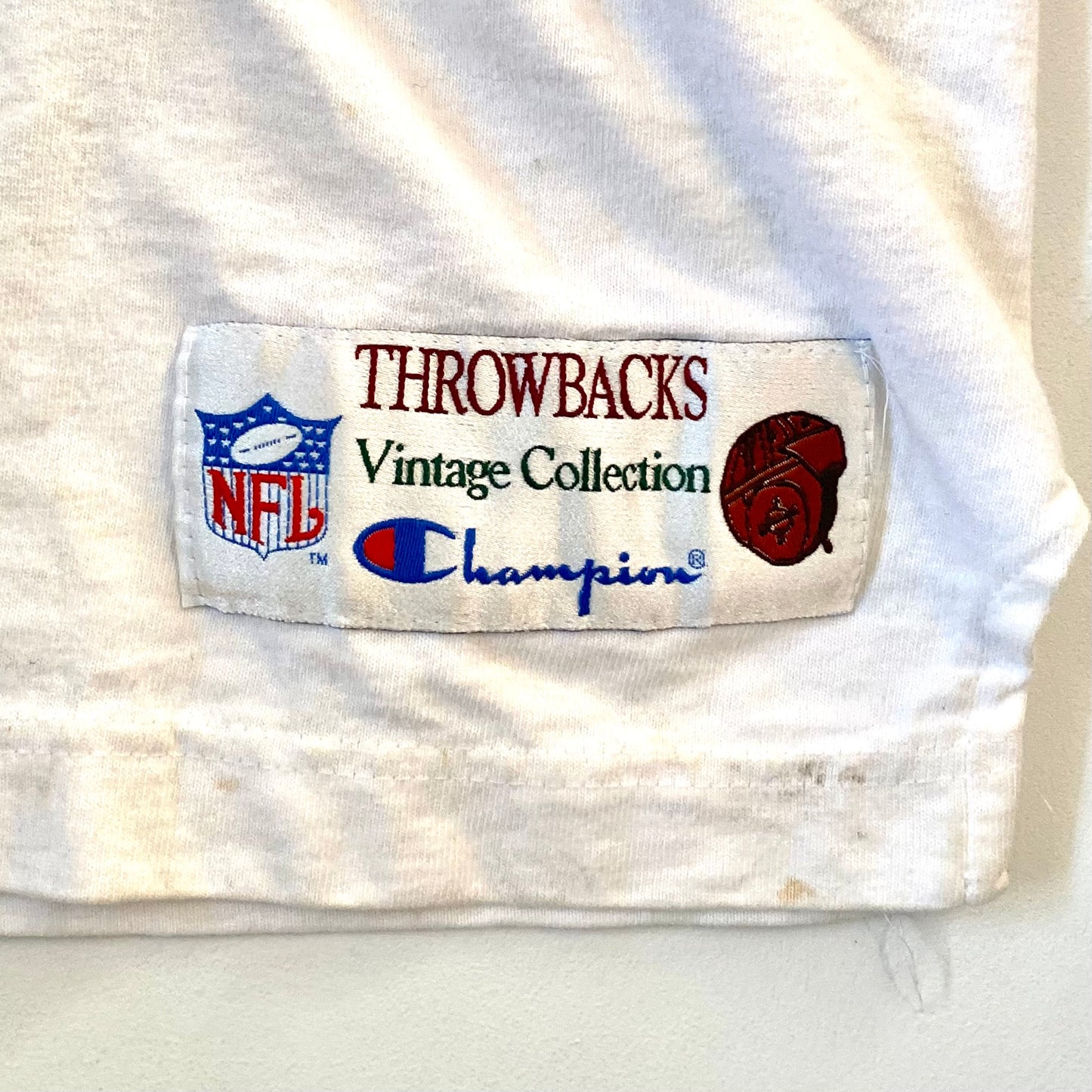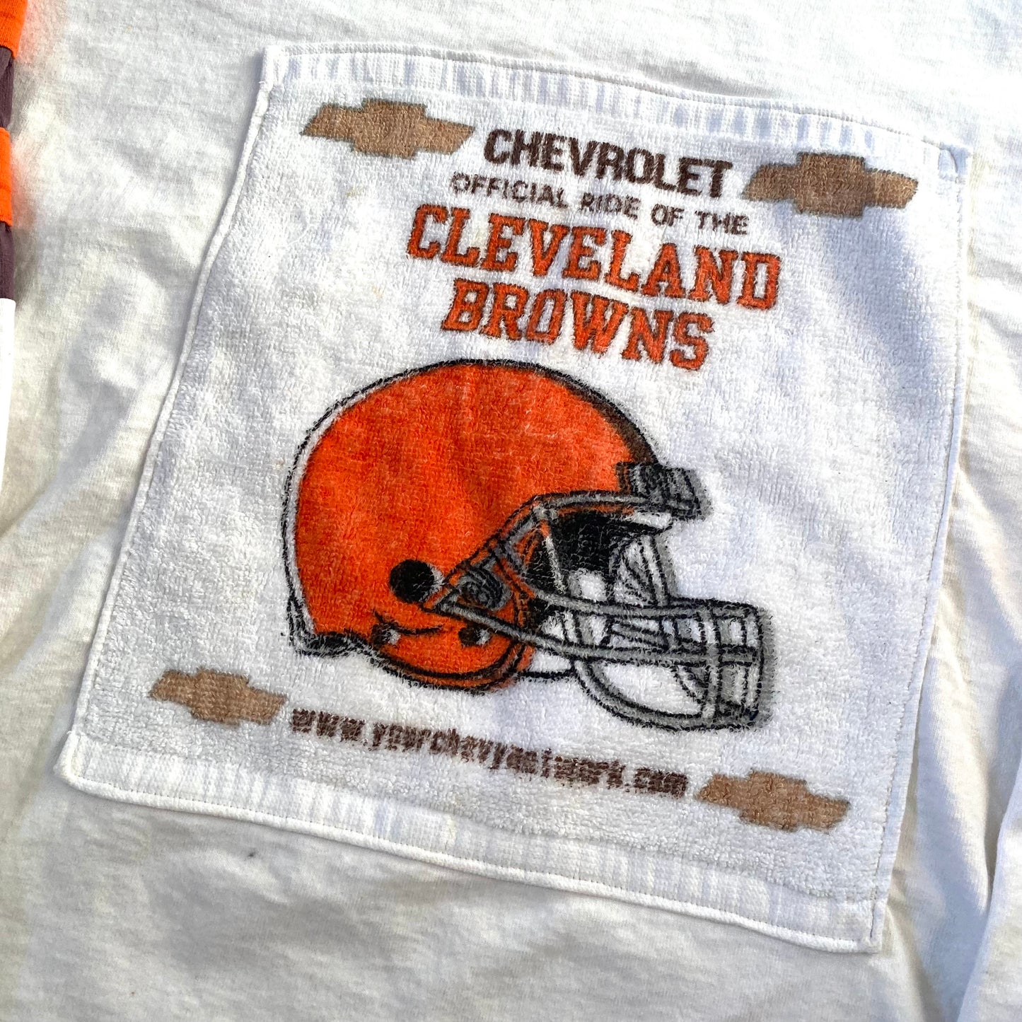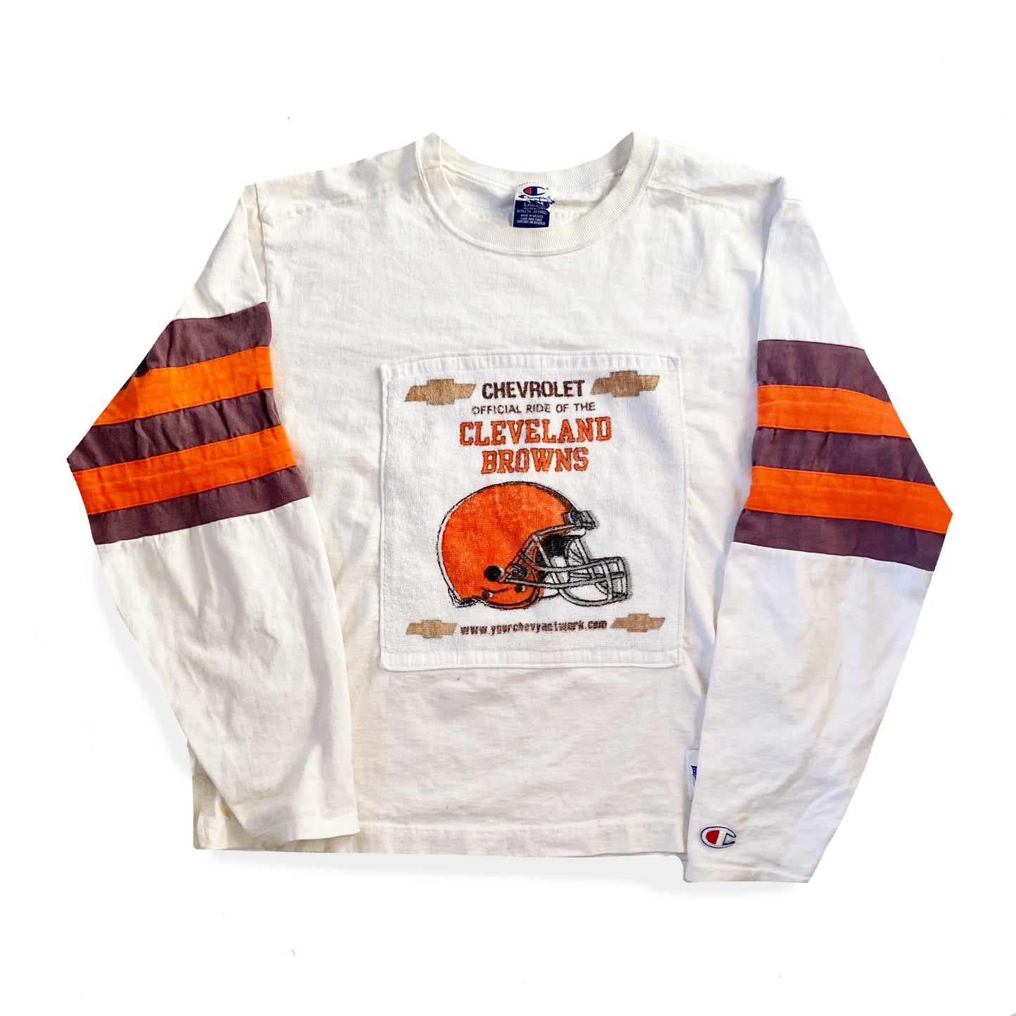 This long sleeve champions shirt has been altered by a previous owner. There is a Cleveland Browns rally hand towel sewn onto the front. As this is likely a one of a kind shirt, that has been reworked it is hard to know if it is vintage or secondhand. The shirt does hand some discolouration on it.