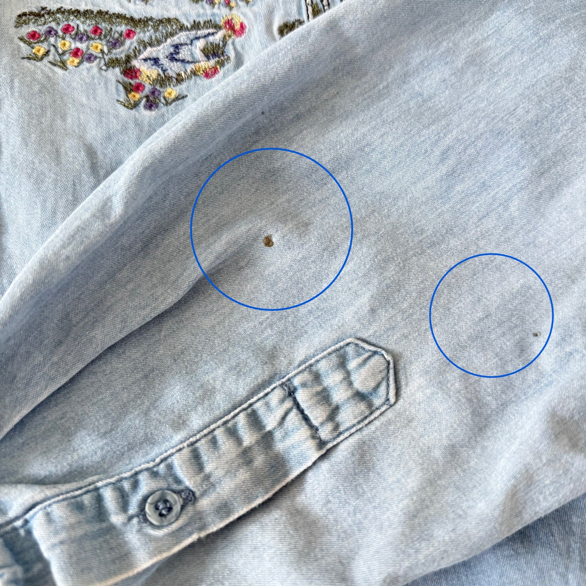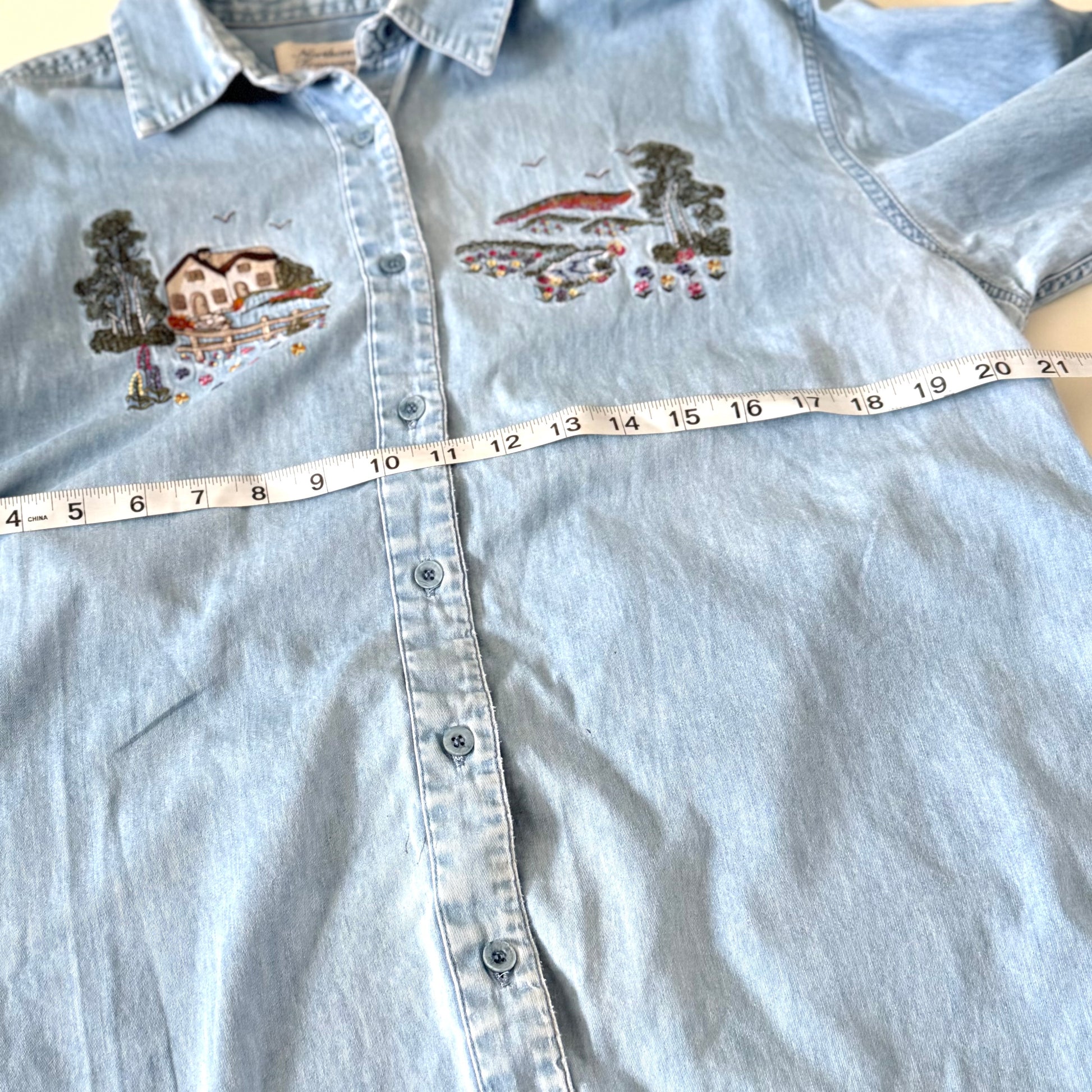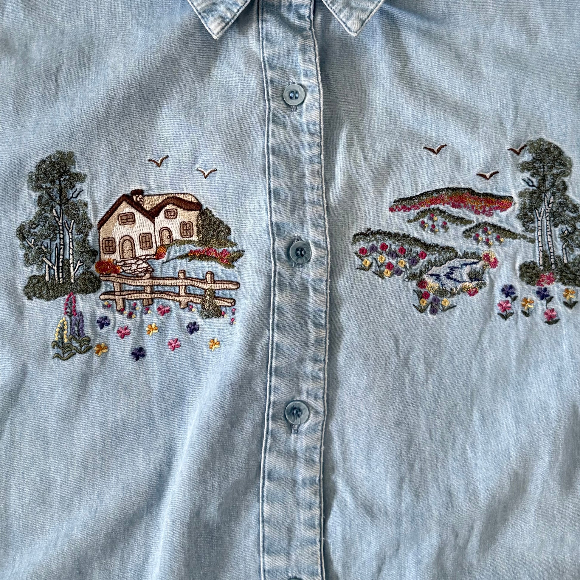 Vintage Northern Treasures, by Northern Reflections denim button down shirt with a spring / summer embroidered scene.