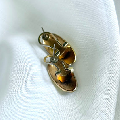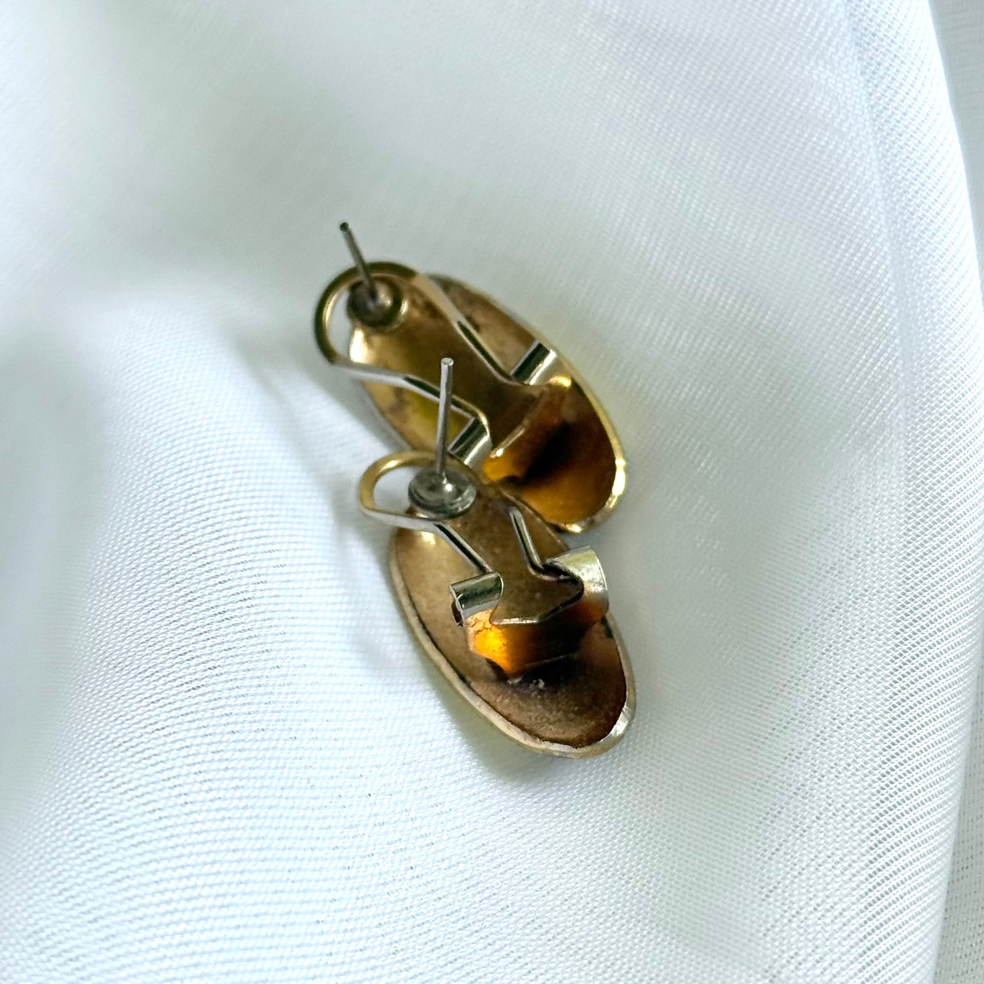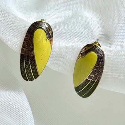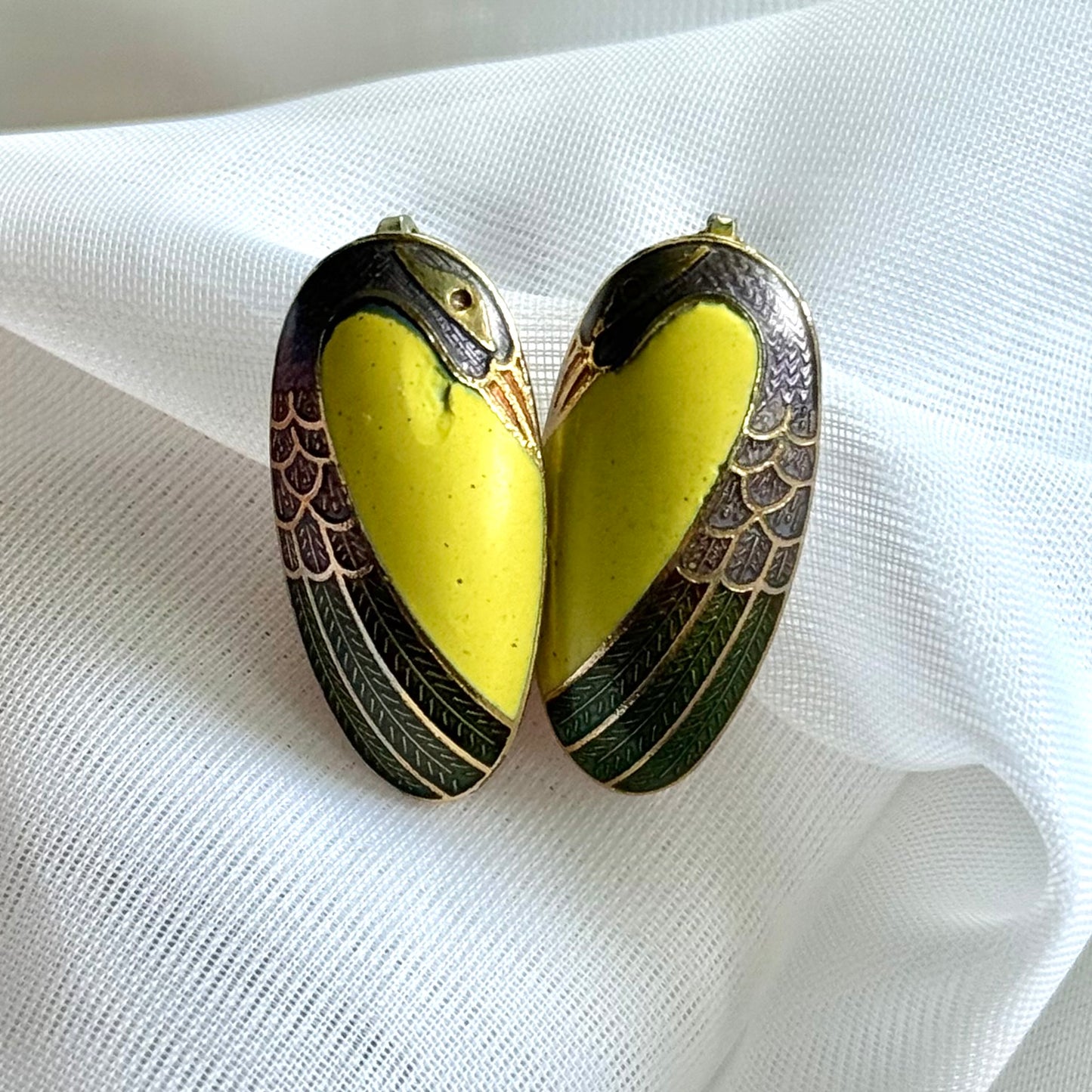 Vintage style earrings with peacock birds and a yellow background. There is an indent or small chip on the yellow section of one earring.