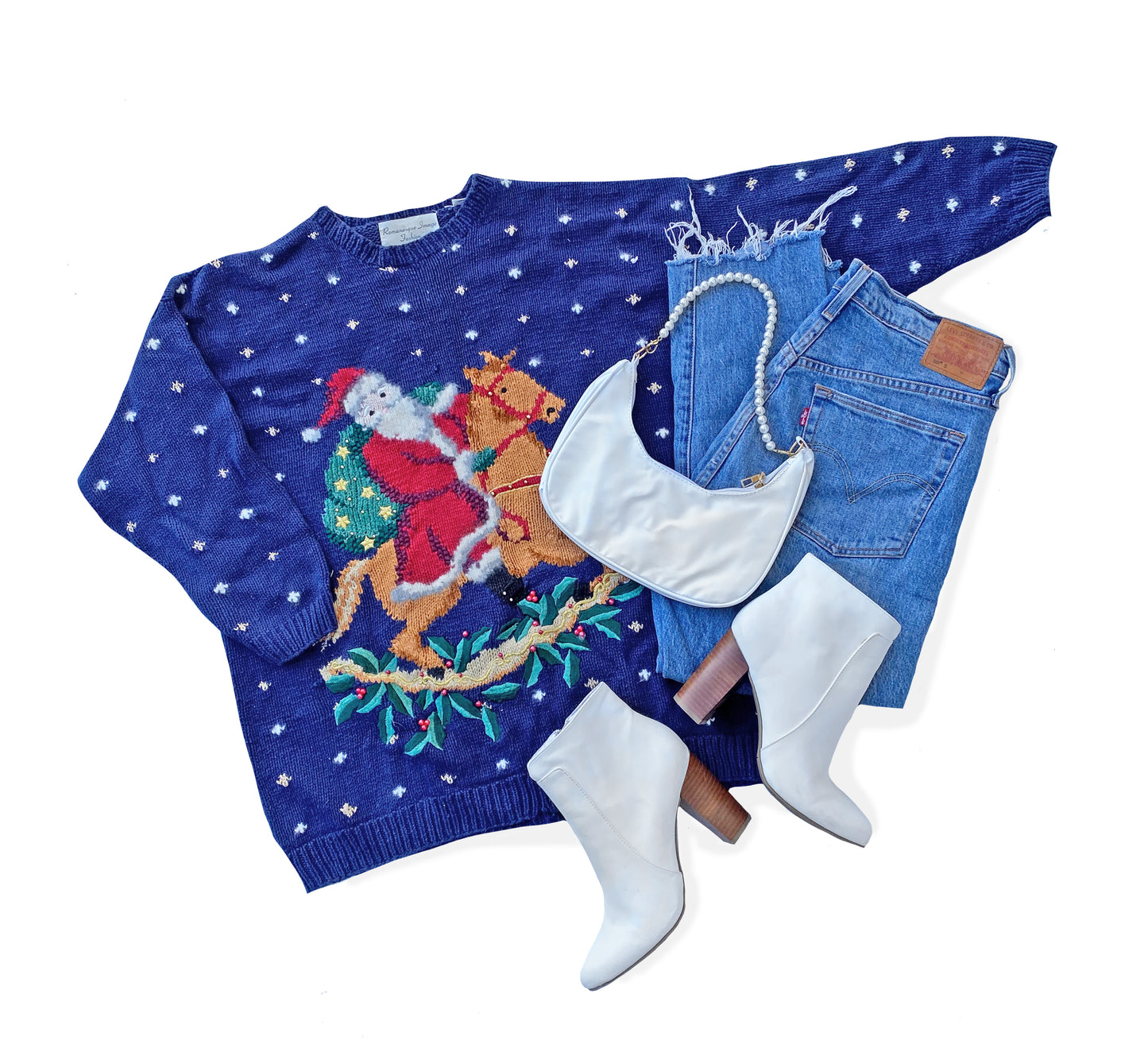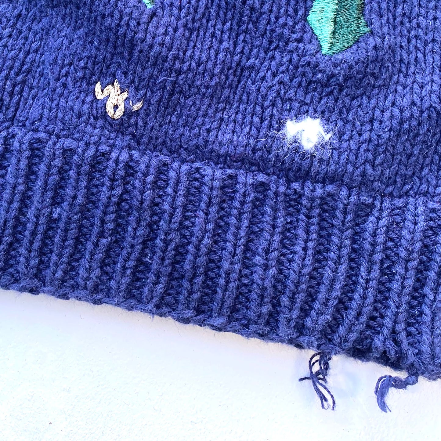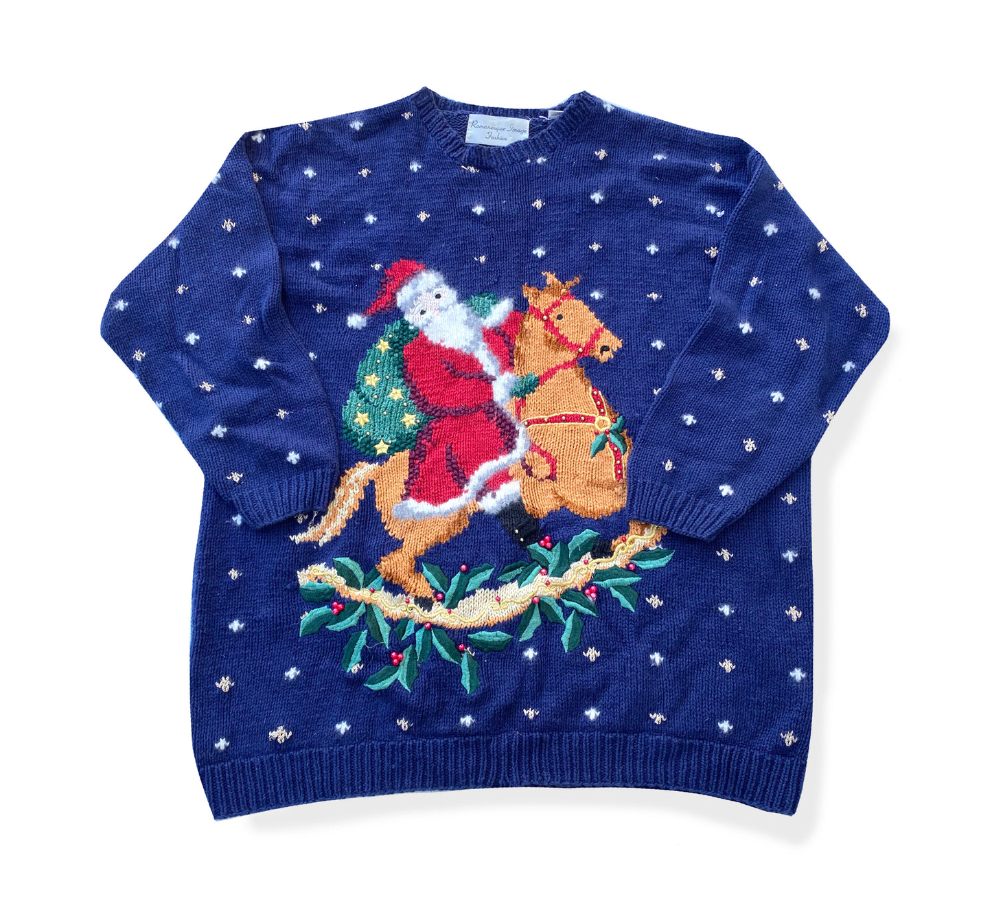 Vintage knitted sweater, with Santa on the front with beautiful beadwork. There is a small part of the bottom stitching that is fraying.