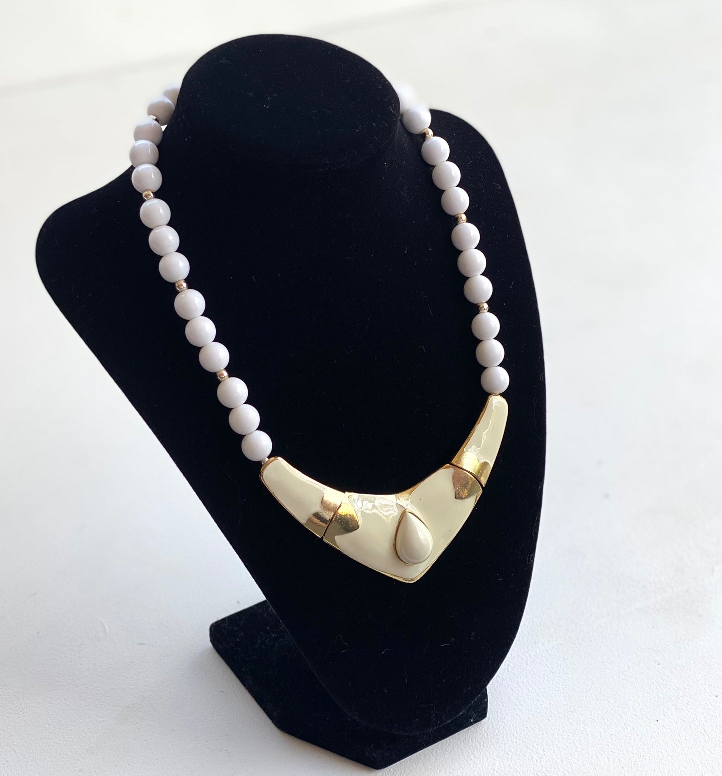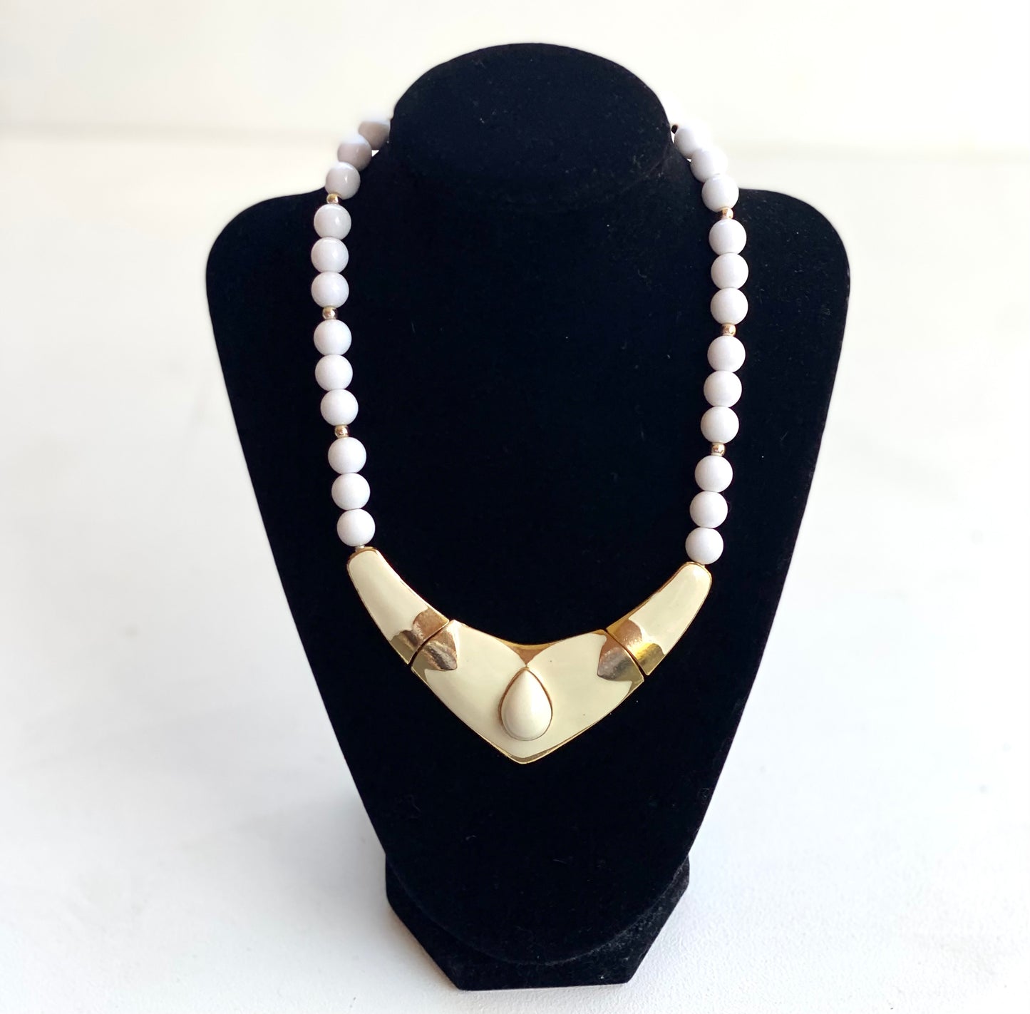 This vintage statement necklace has white and gold coloured beads with a metal feature piece that is cream and gold coloured. Style is from the 1980's.
