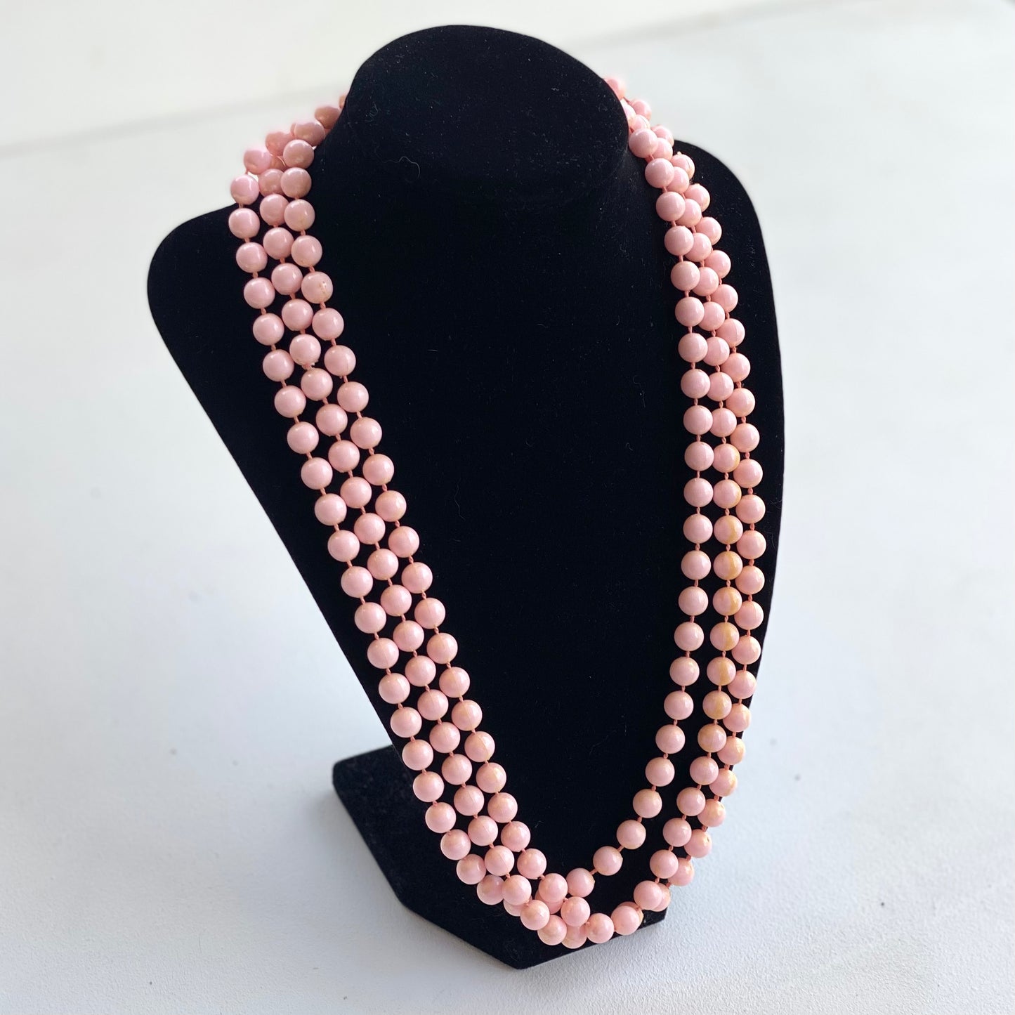 Pink coloured beaded necklace. Discolouration on some of the beads from the finish coming off due to age. The necklace in a vintage style from the mid century.