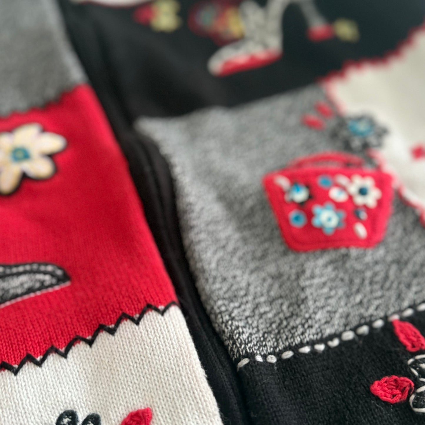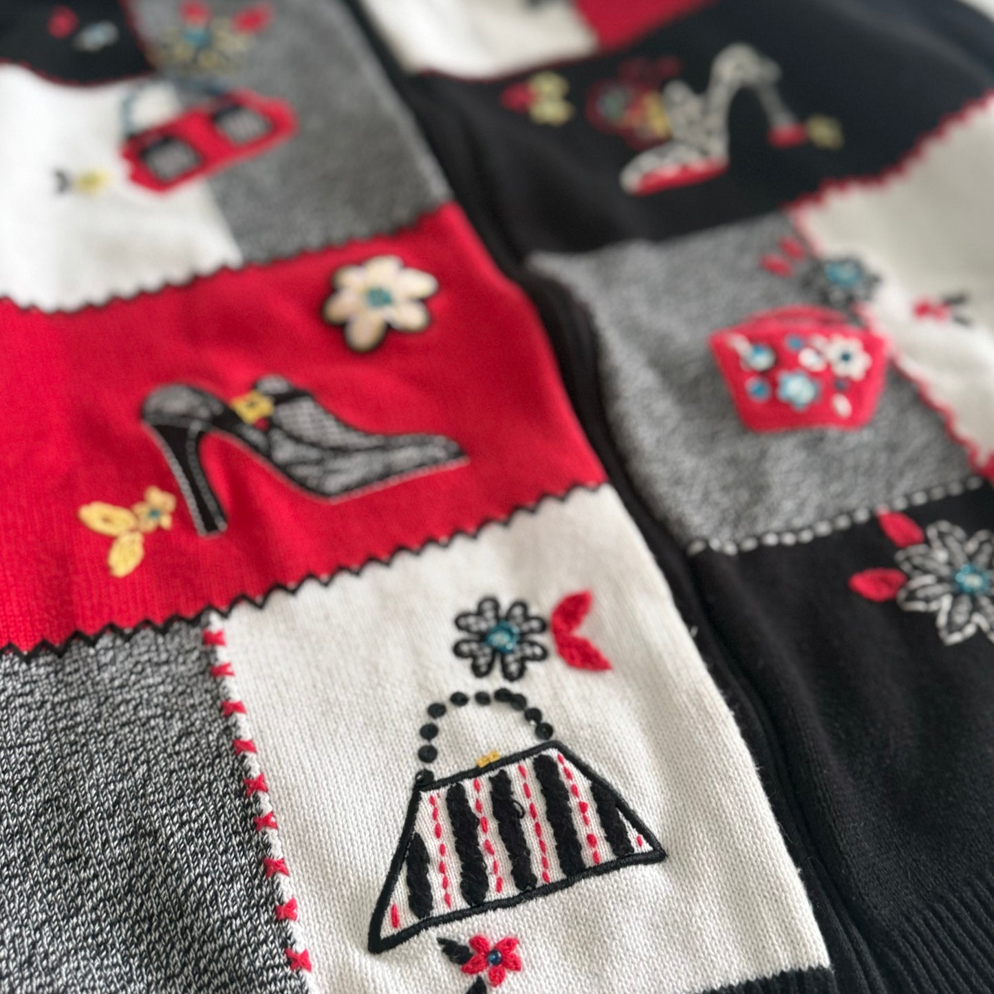 Secondhand patchwork zippered knit cardigan. This sweater has embroidered shoes and handbags with sequences and beads.