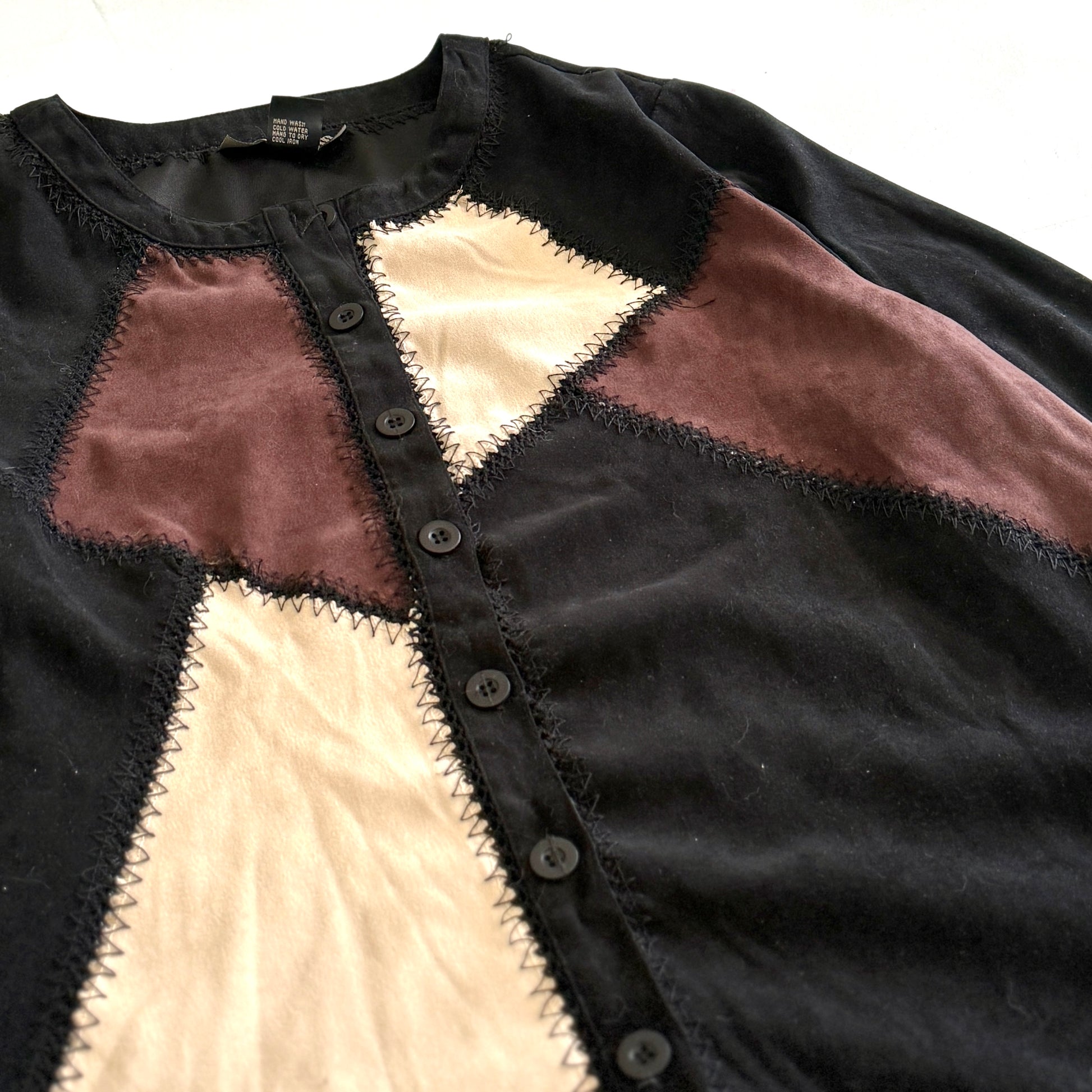Secondhand button up shirt, with a 1970's inspired faux suede patchwork style.