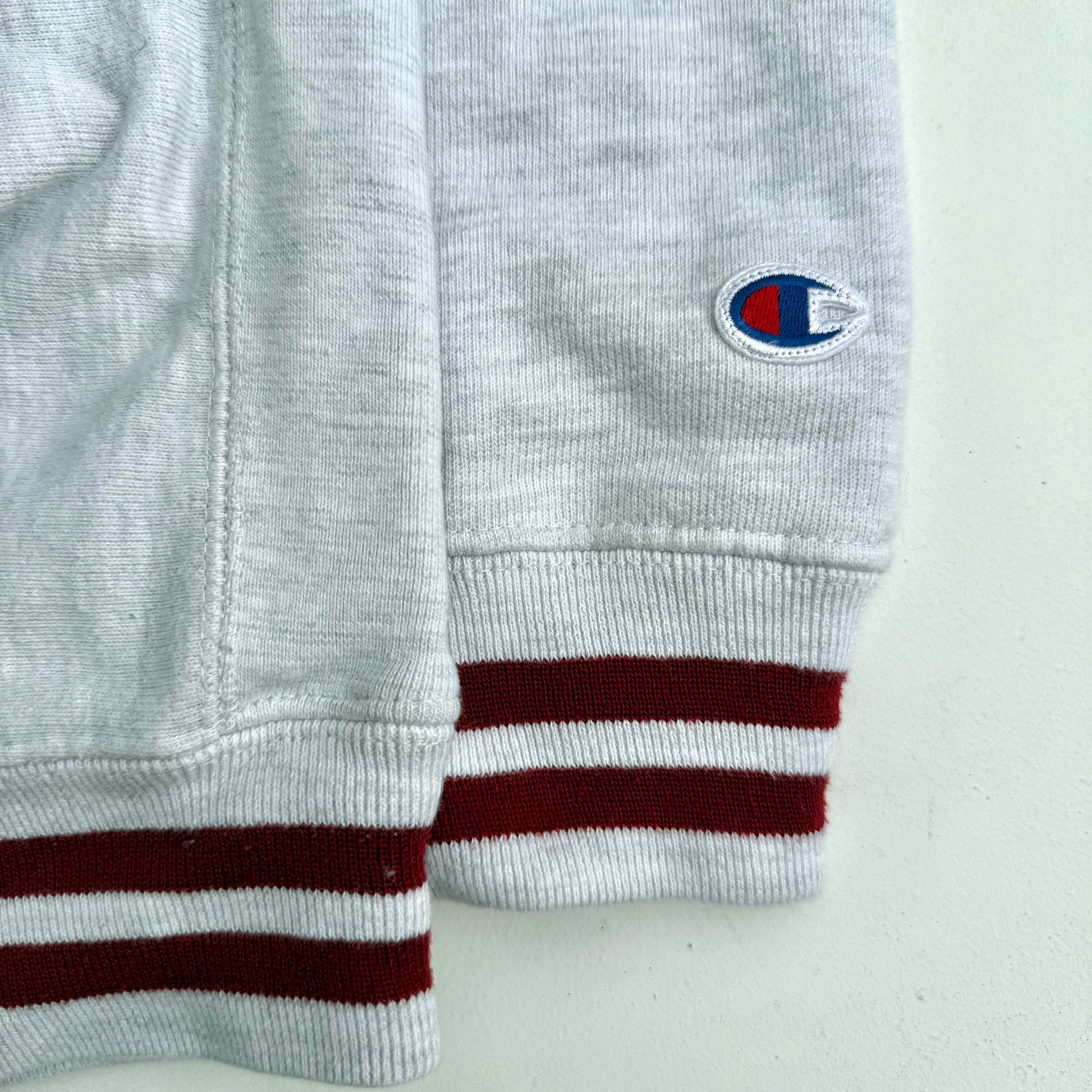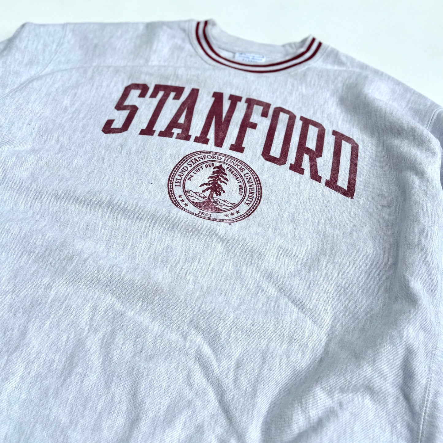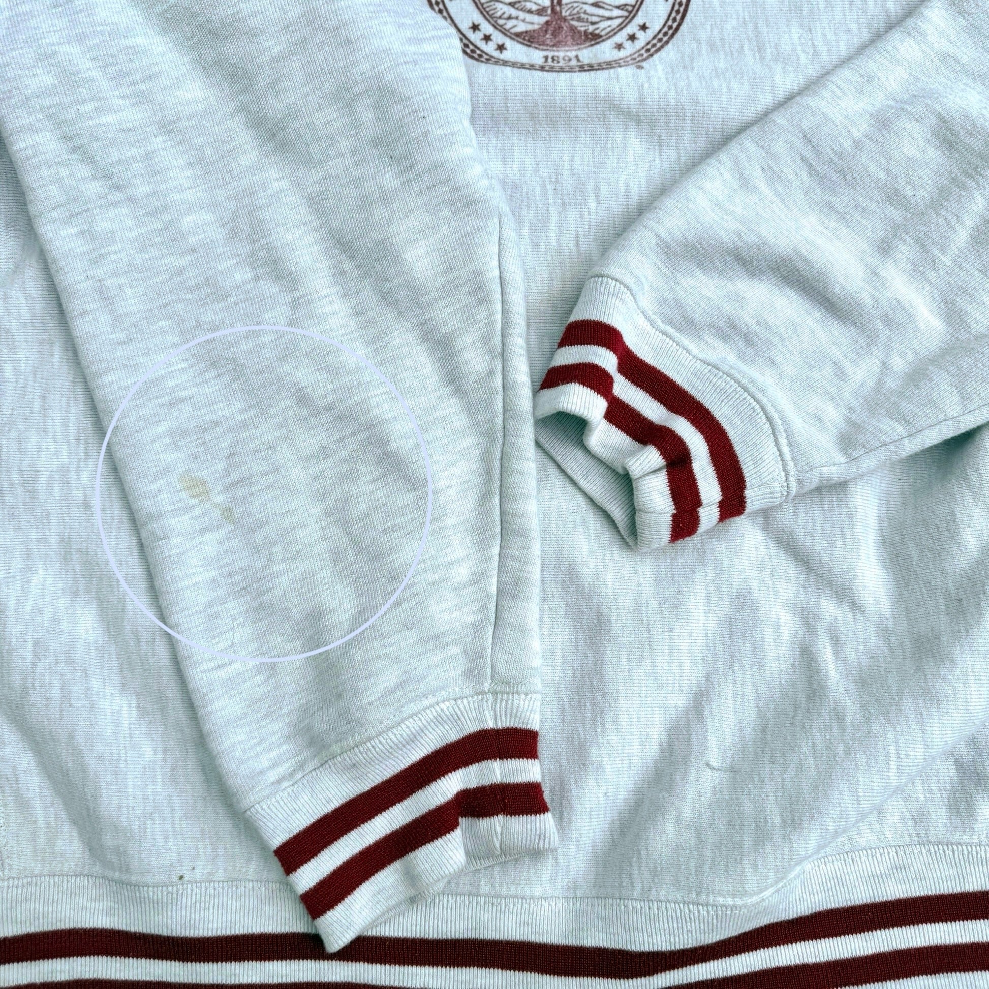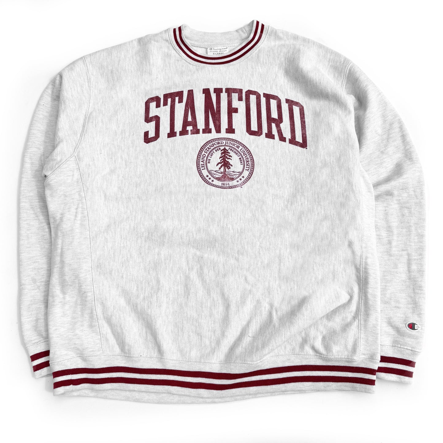 Secondhand sweatshirt with Stanford on the front in red, on a grey sweatshirt. There is a small stain on one sleeve.