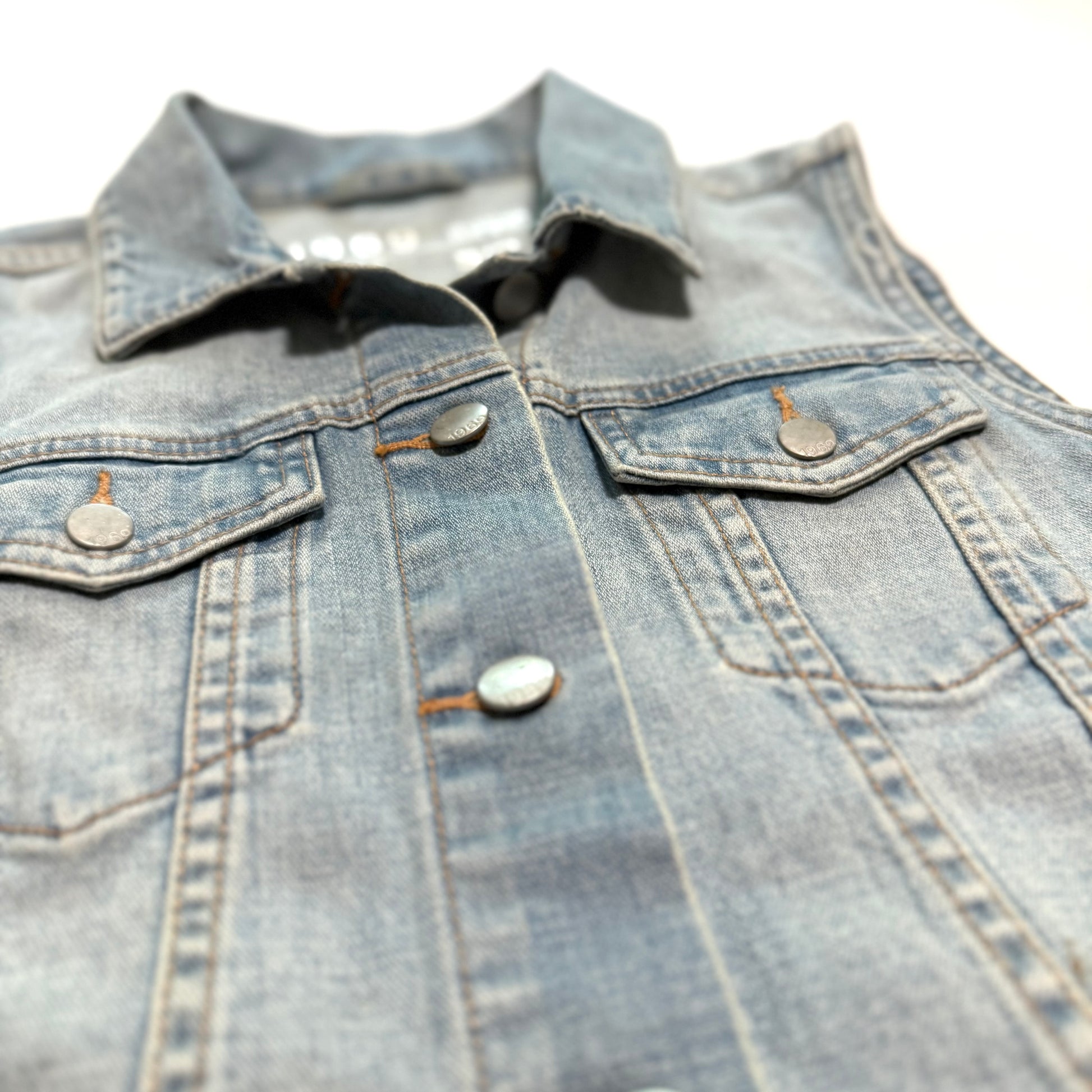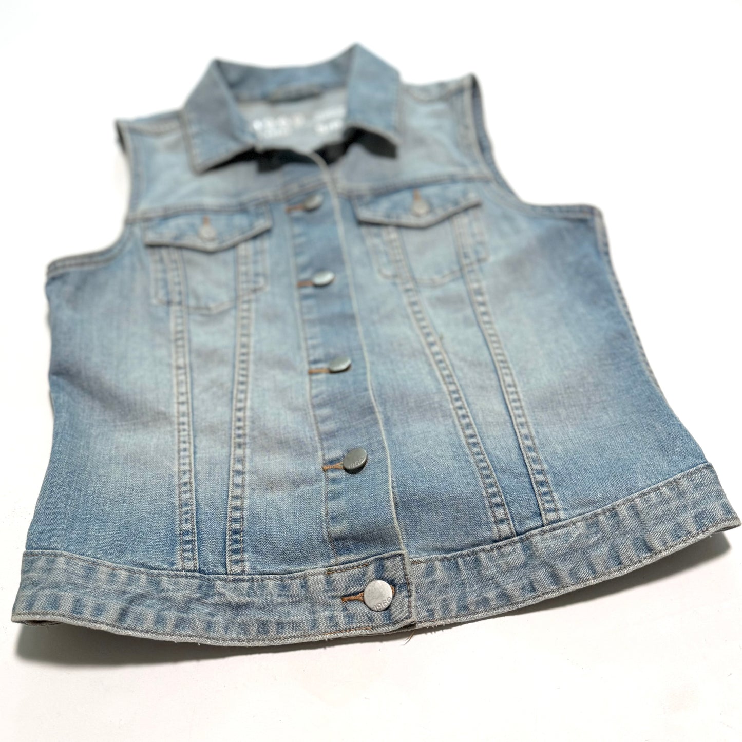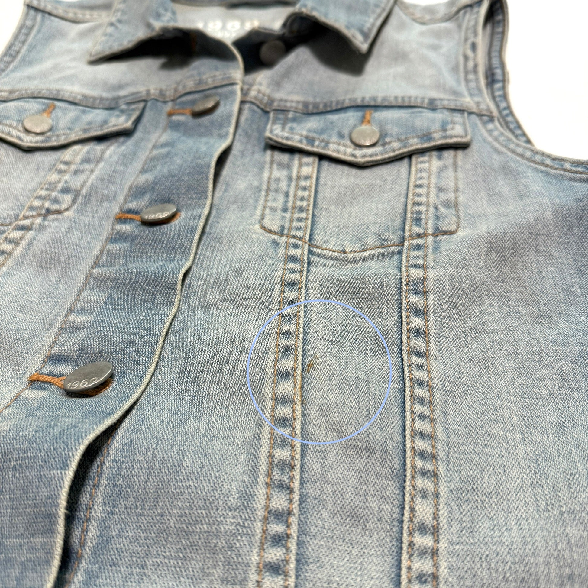 Secondhand denim vest. There is a small mark on the front.