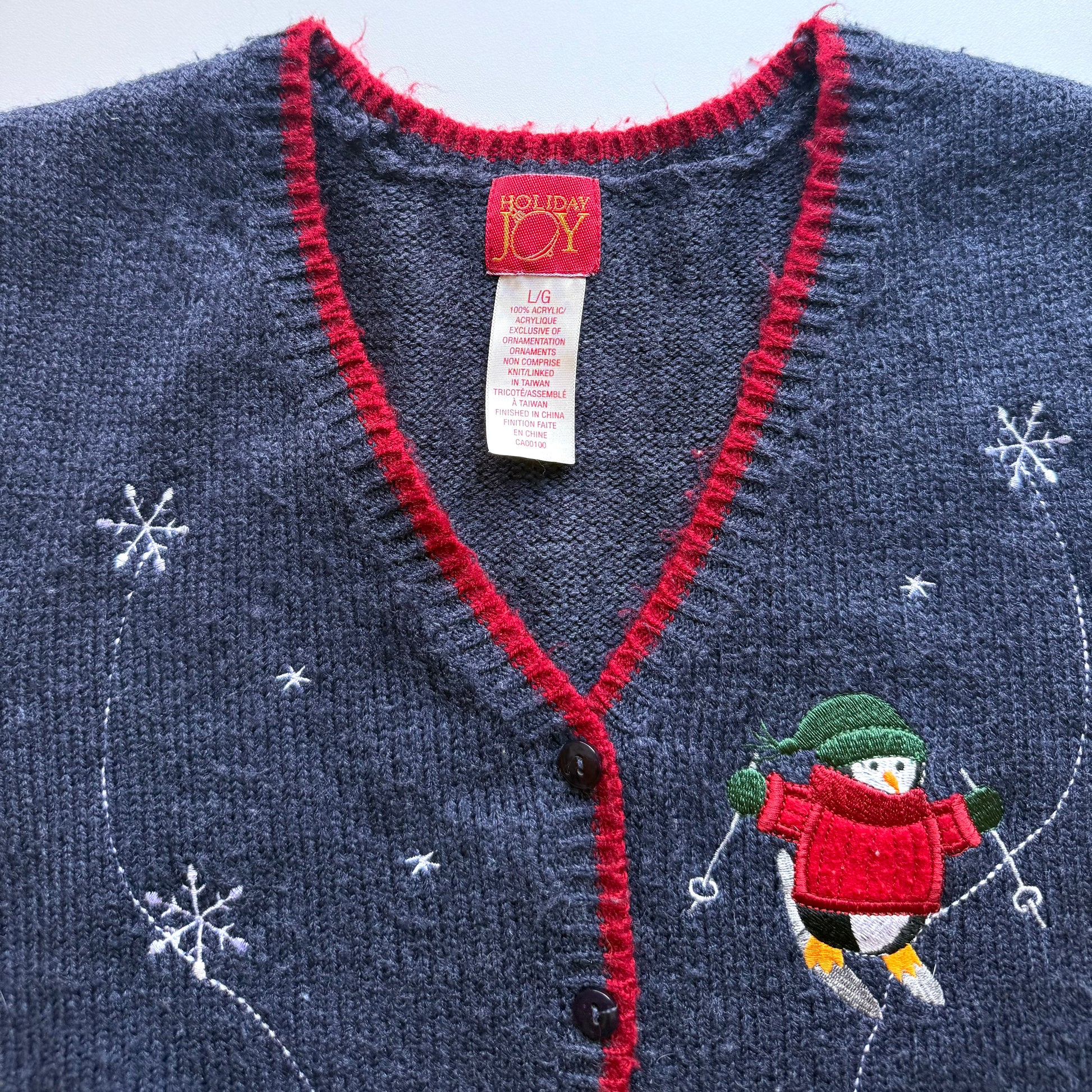 Secondhand blue vest with red trim features penguins skiing. Based on the measurements, this could be worn a size up.