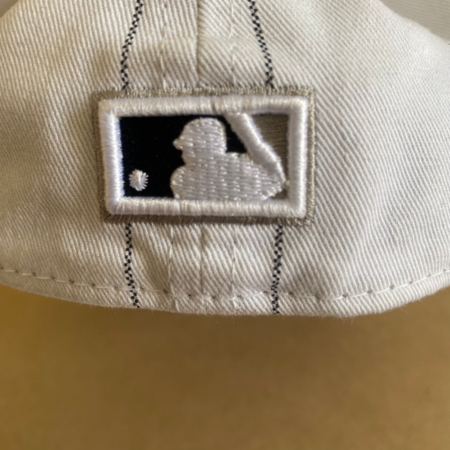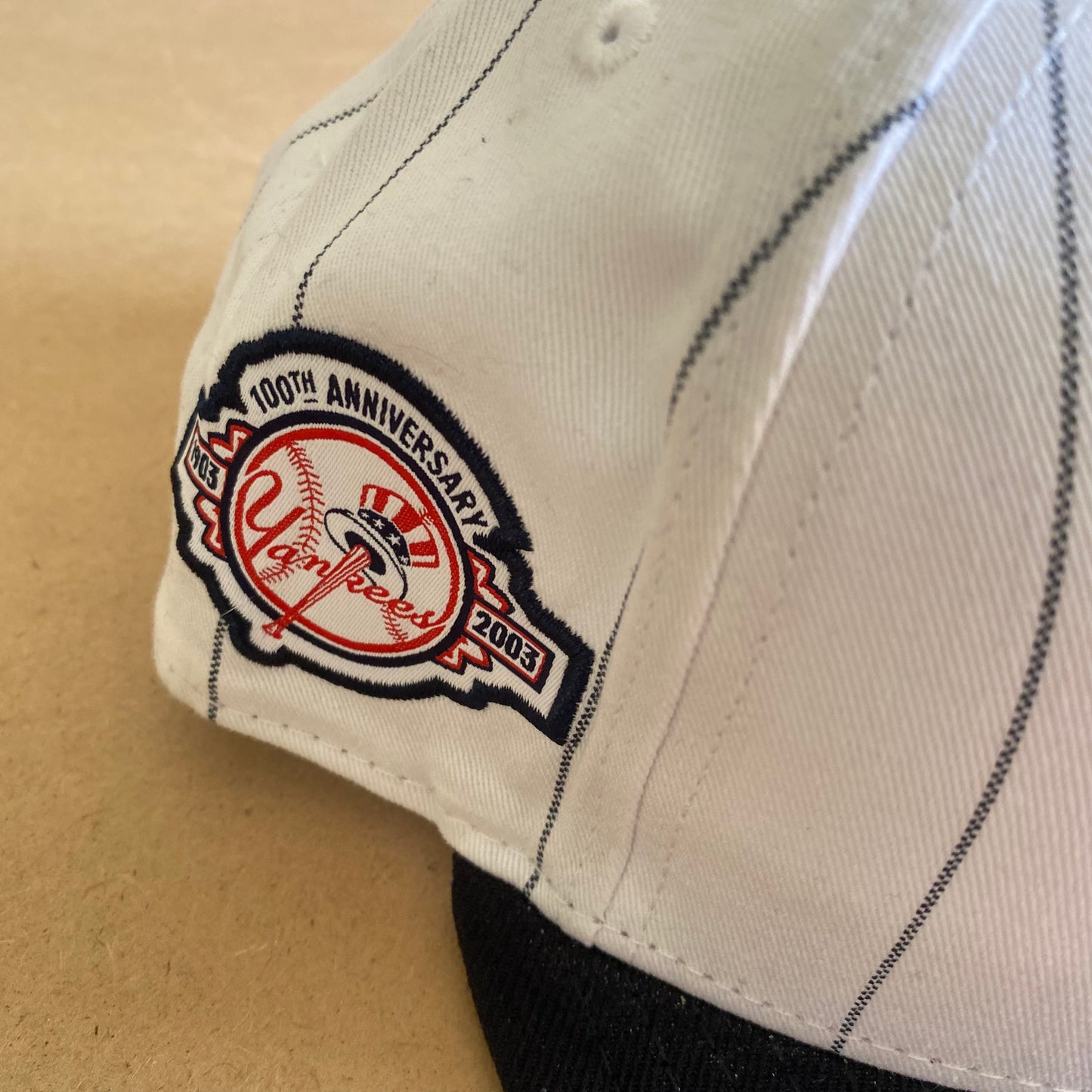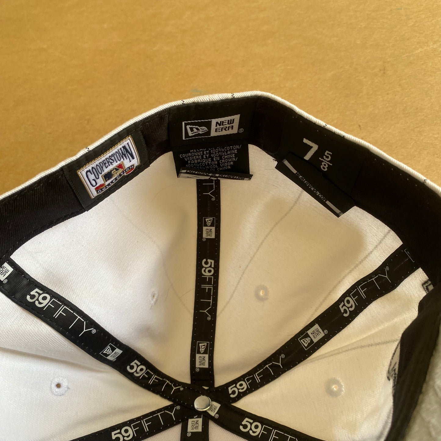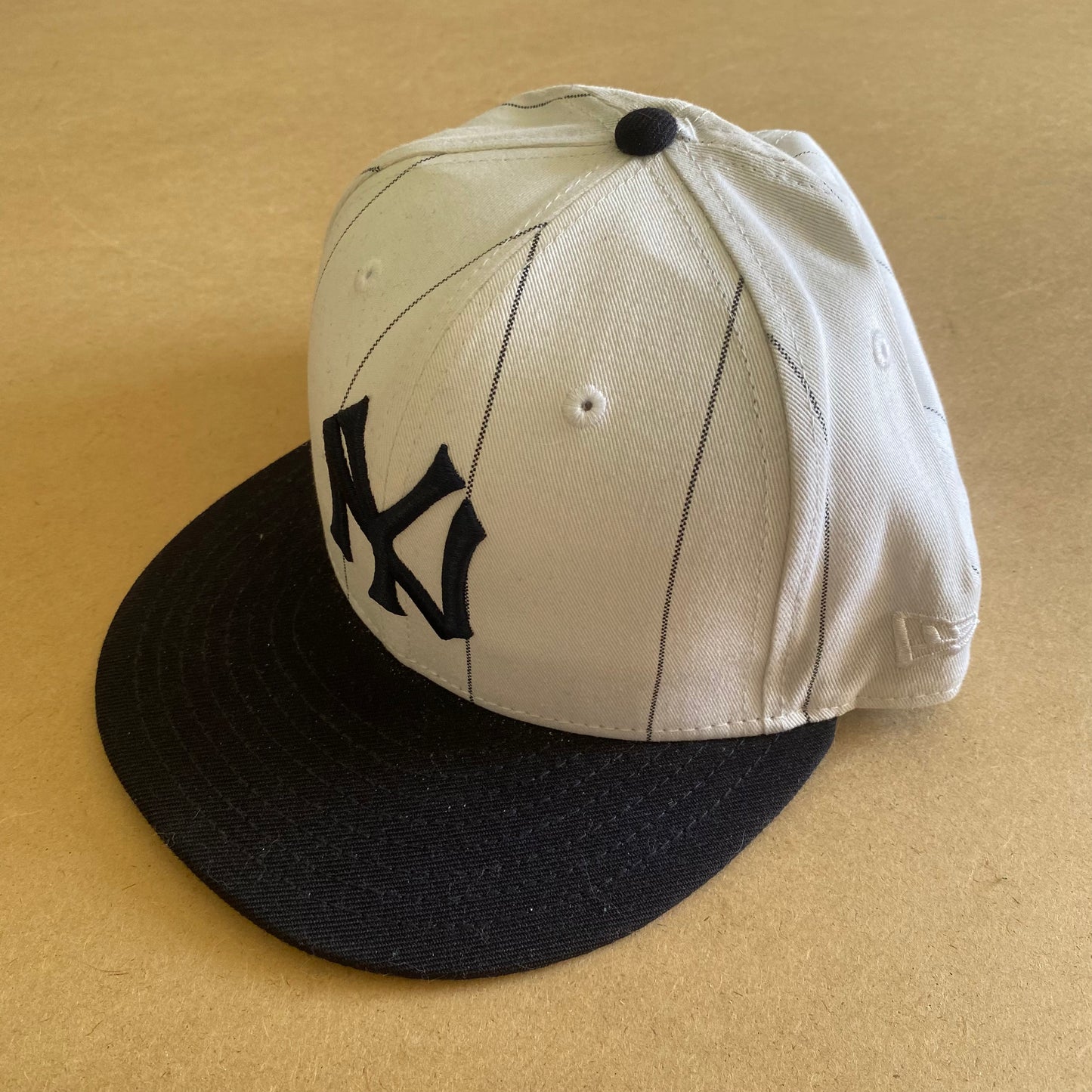 Fitted men’s hat, with a flat bill and a patch logo. White and black hat with embroidered NY on the front for the Baseball team New York Yankees.