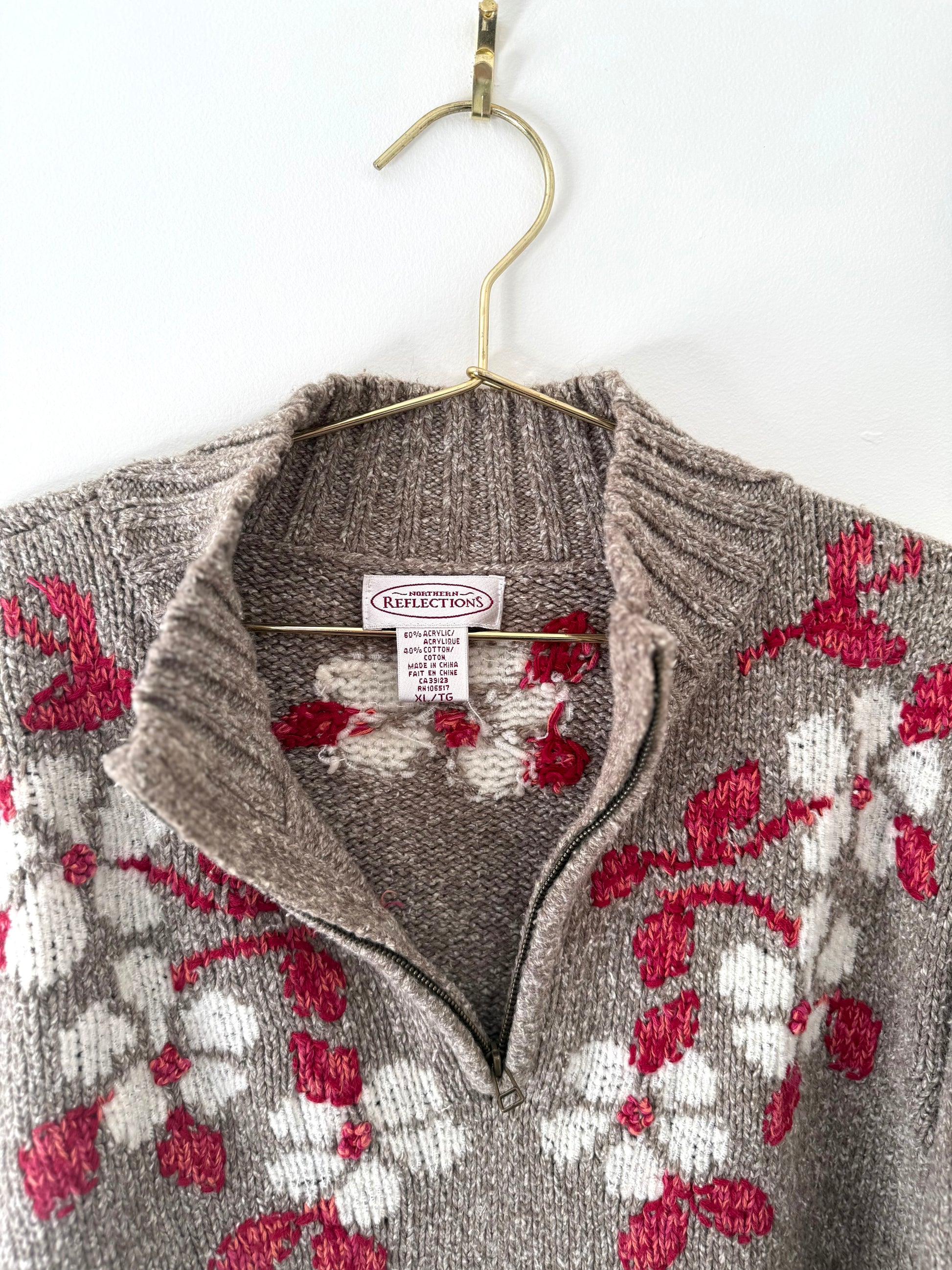 Secondhand beige quarter-zip sweater with white and red florals around the neck.