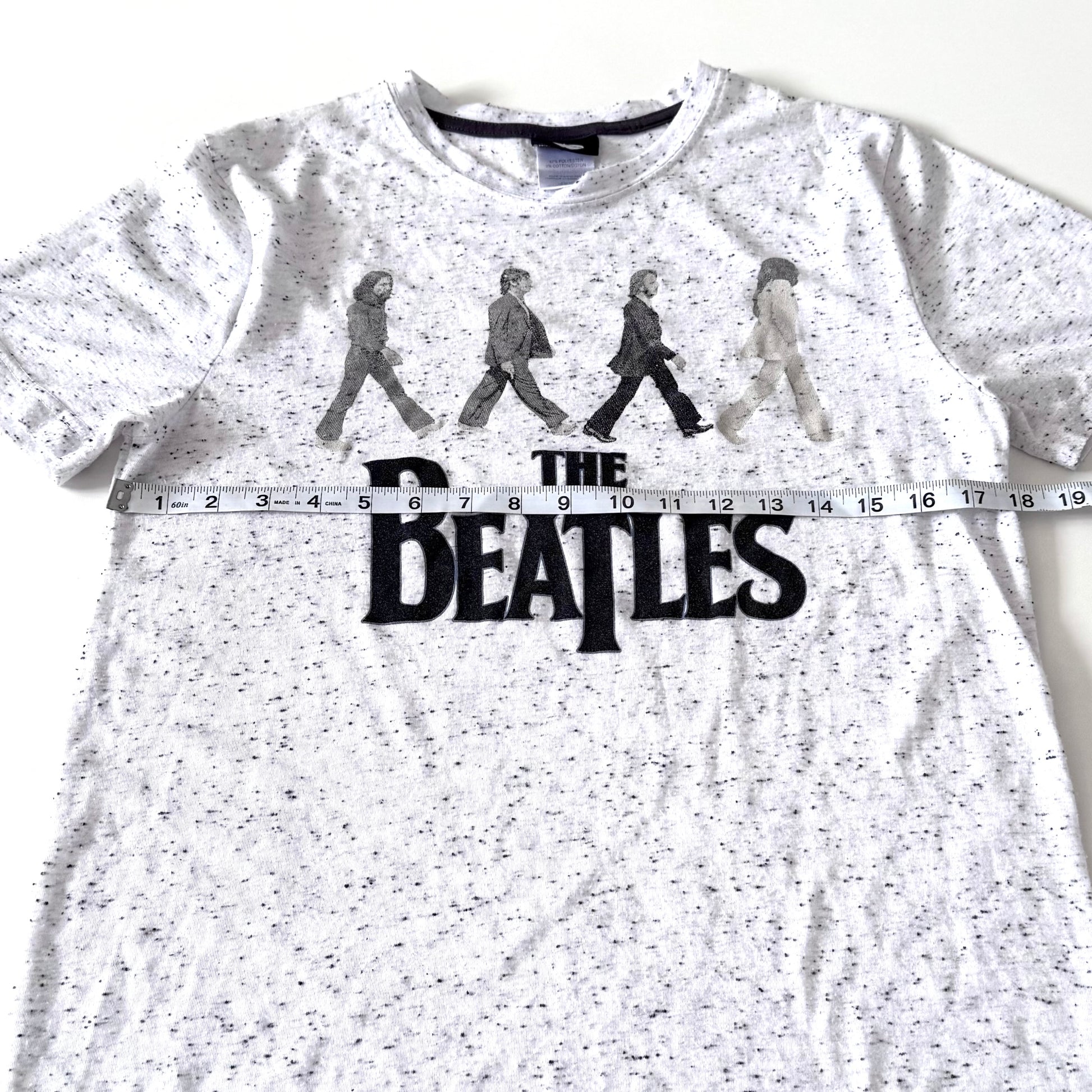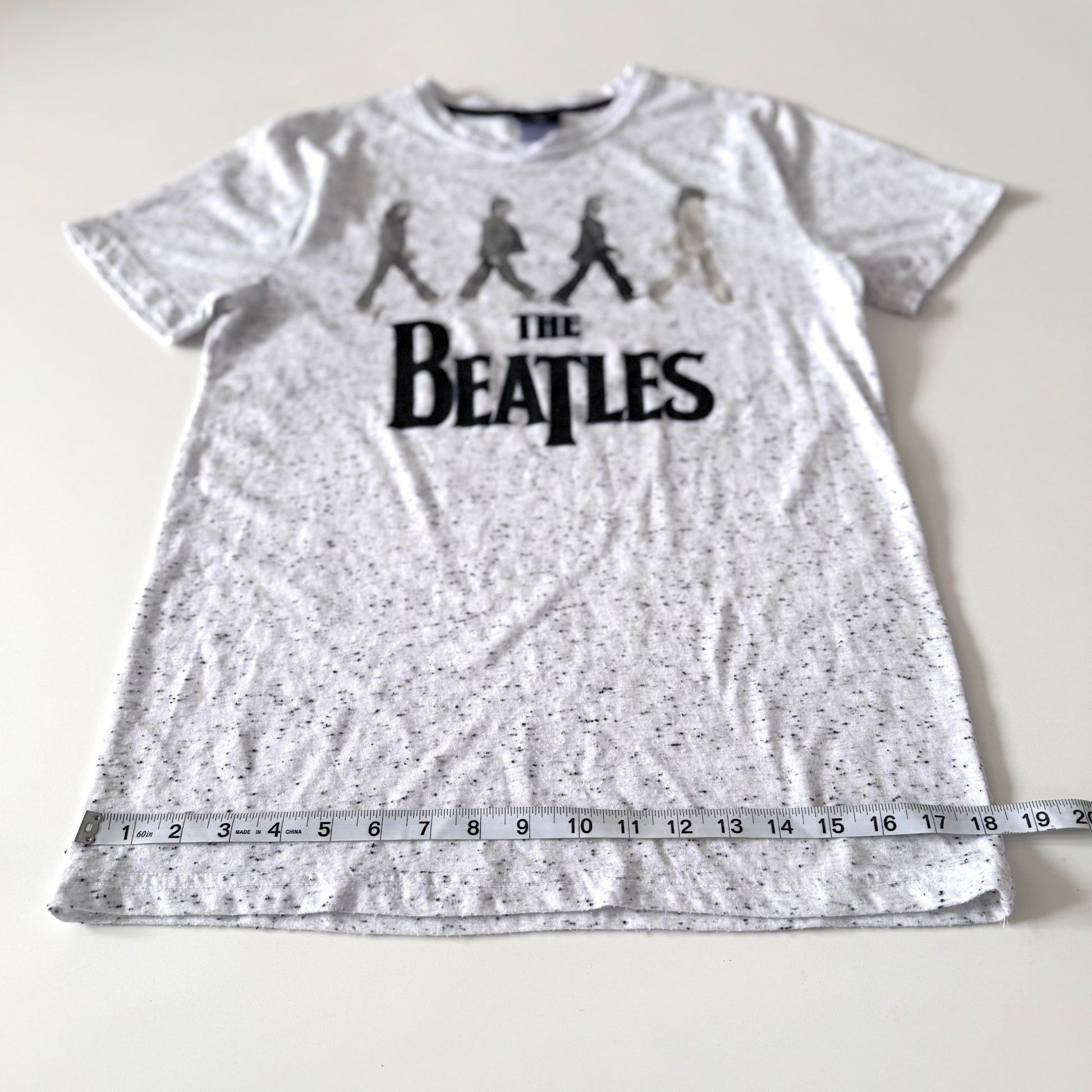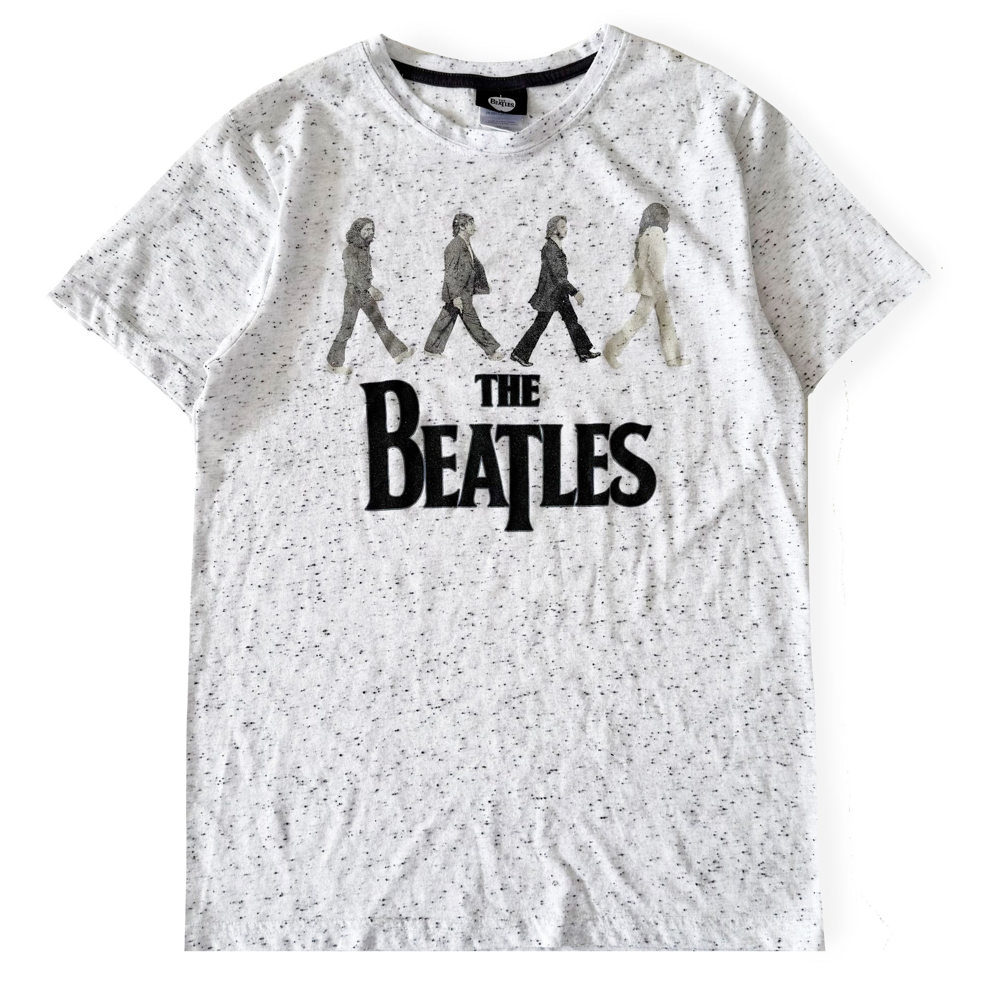 Secondhand light weight band t-shirt for the Beatles with black textured flecks throughout it.