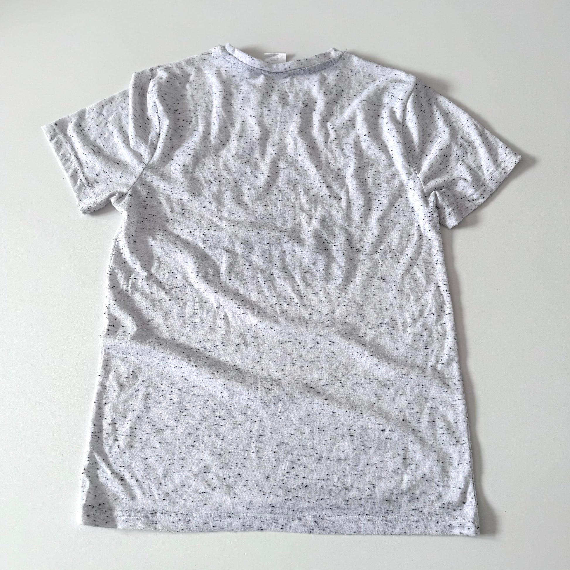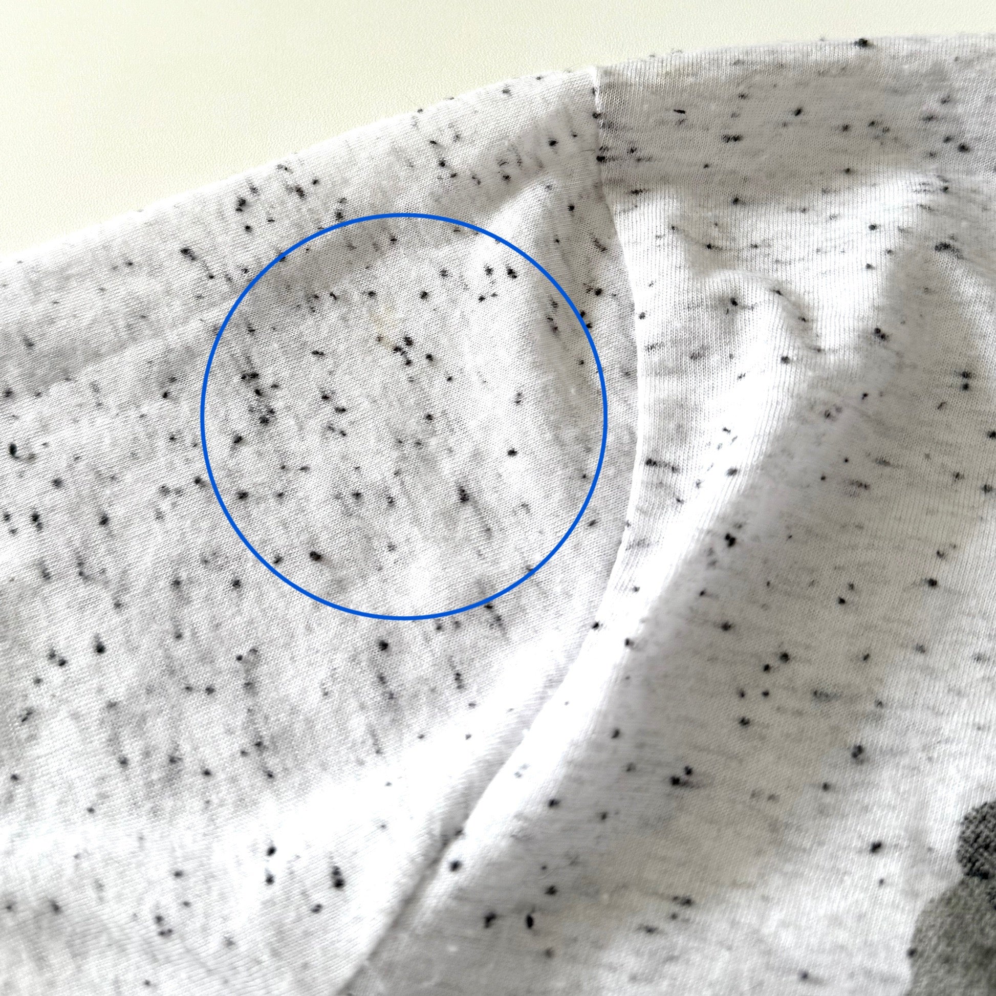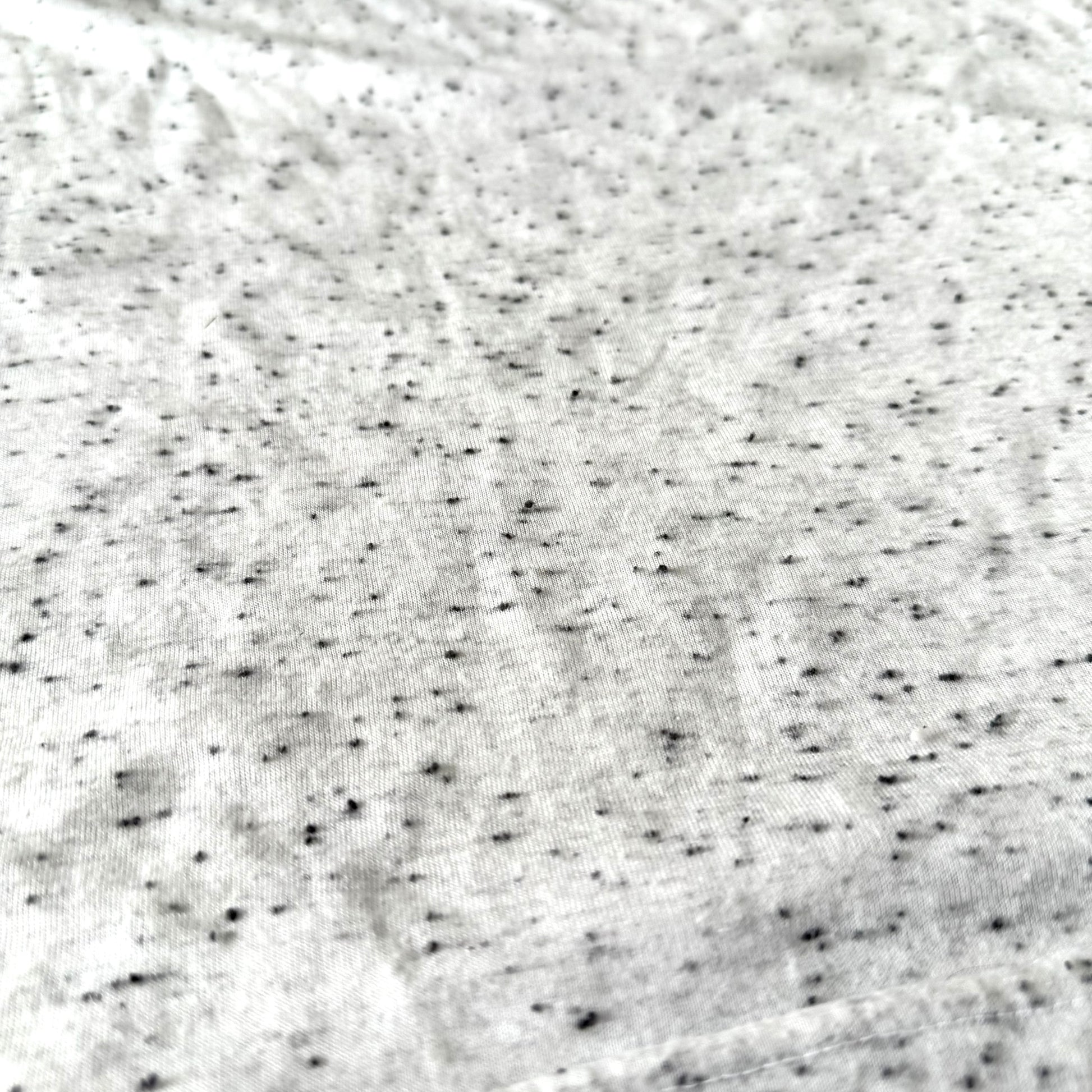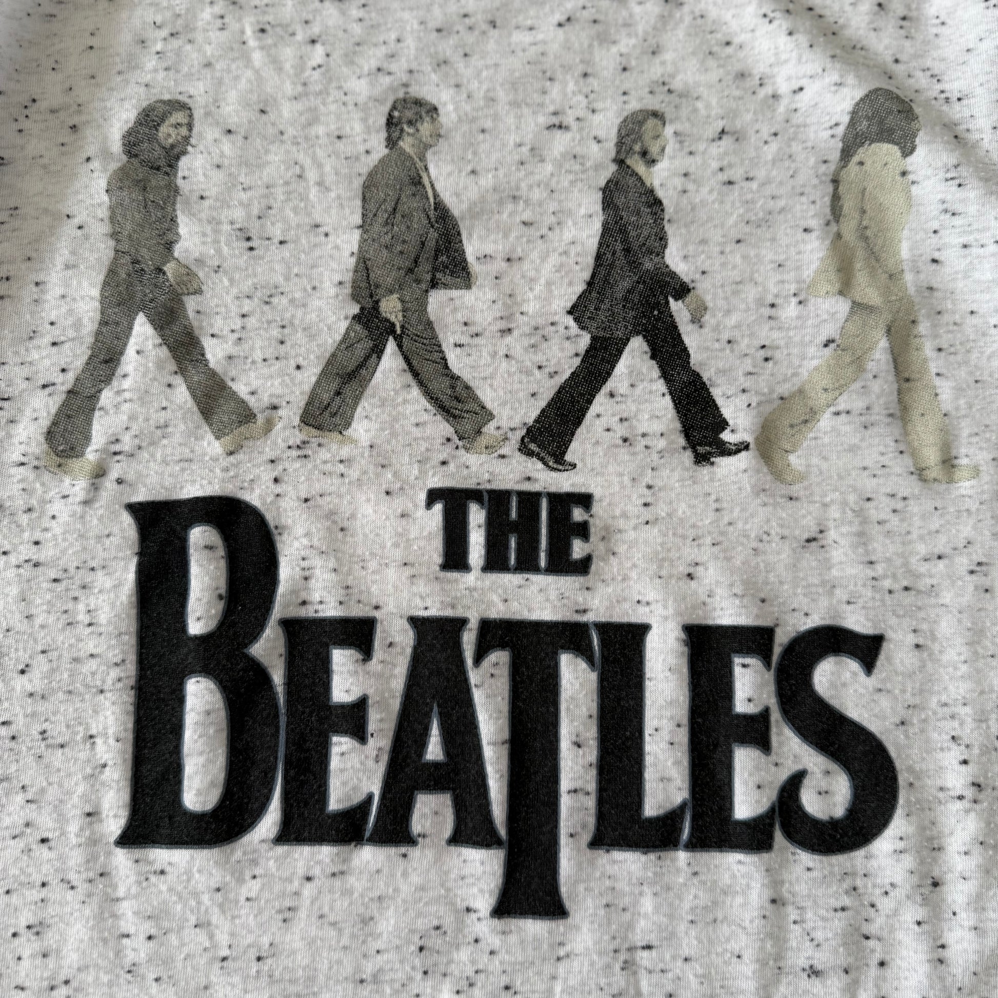 Secondhand light weight band t-shirt for the Beatles with black textured flecks throughout it.