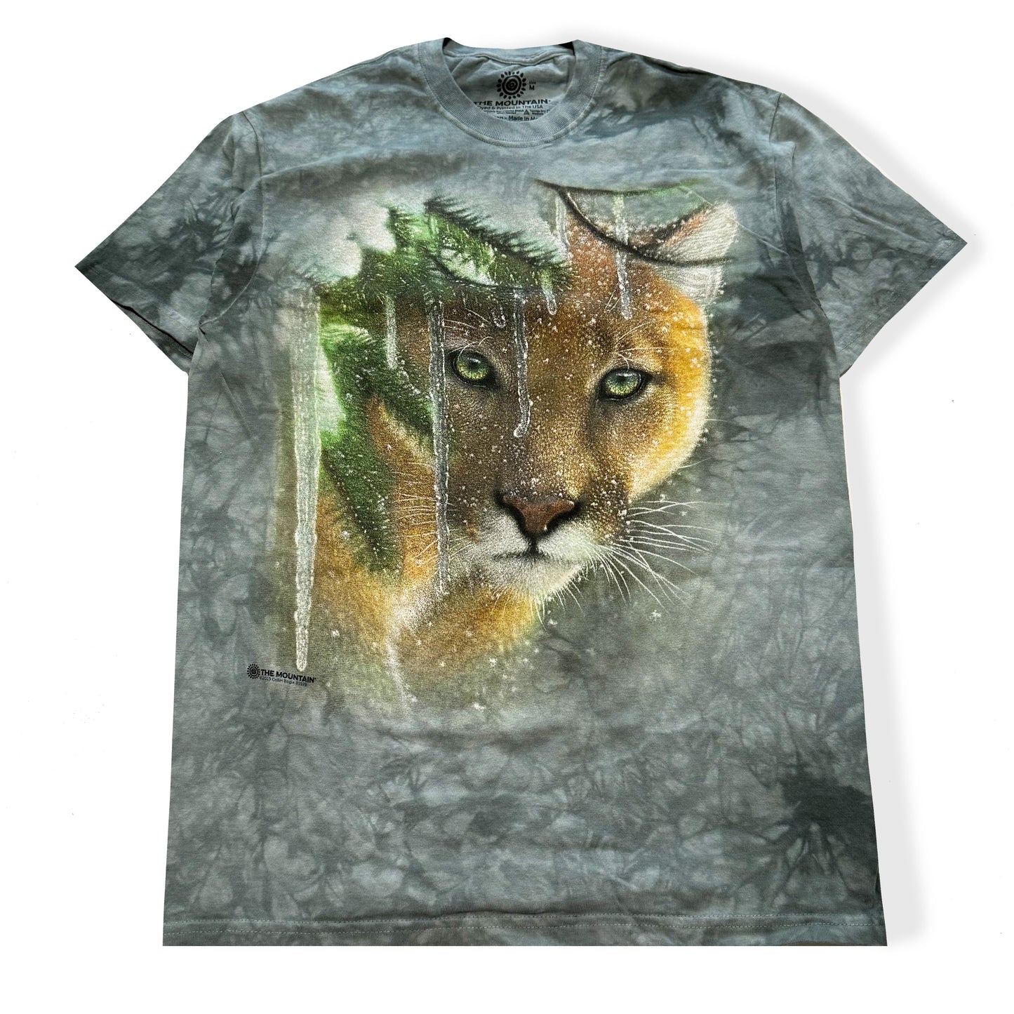 Secondhand tie dye style t-shirt, featuring a cougar / mountain lion peaking through a snowy pine tree.