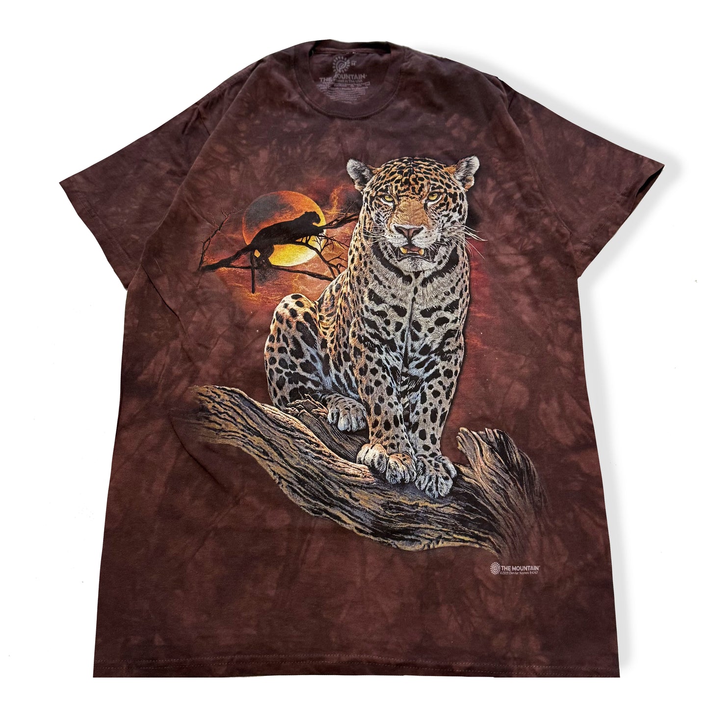Secondhand tie dye style t-shirt, featuring a leopard on a branch