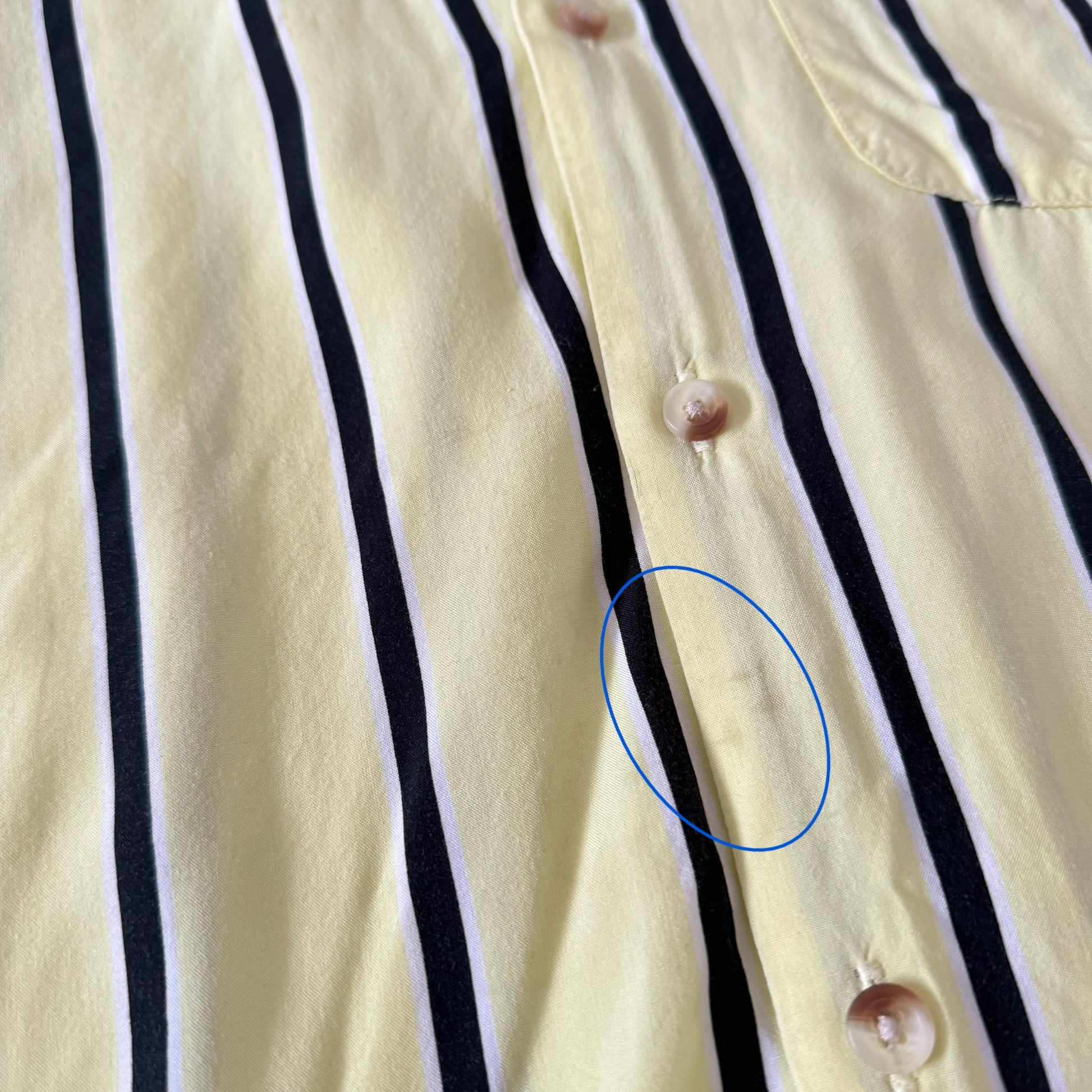 Secondhand button up shirt with a light (almost pastel) neon yellow / green colour with black and white vertical stripes. There is some very light marking on the front of this short sleeve shirt.