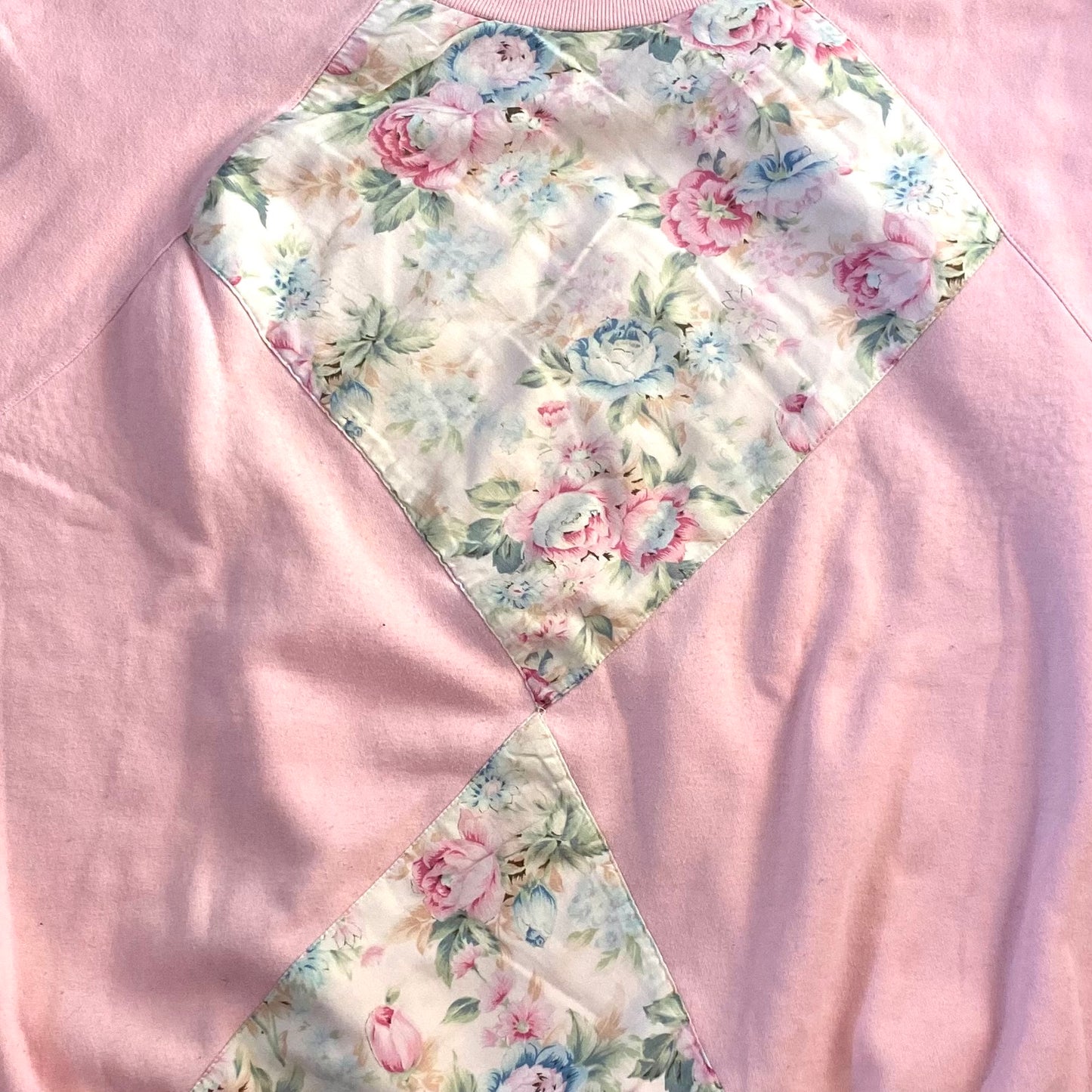 Vintage grandma core style sweatshirt, is a great addition to your spring thrifted wardrobe with floral panel details.