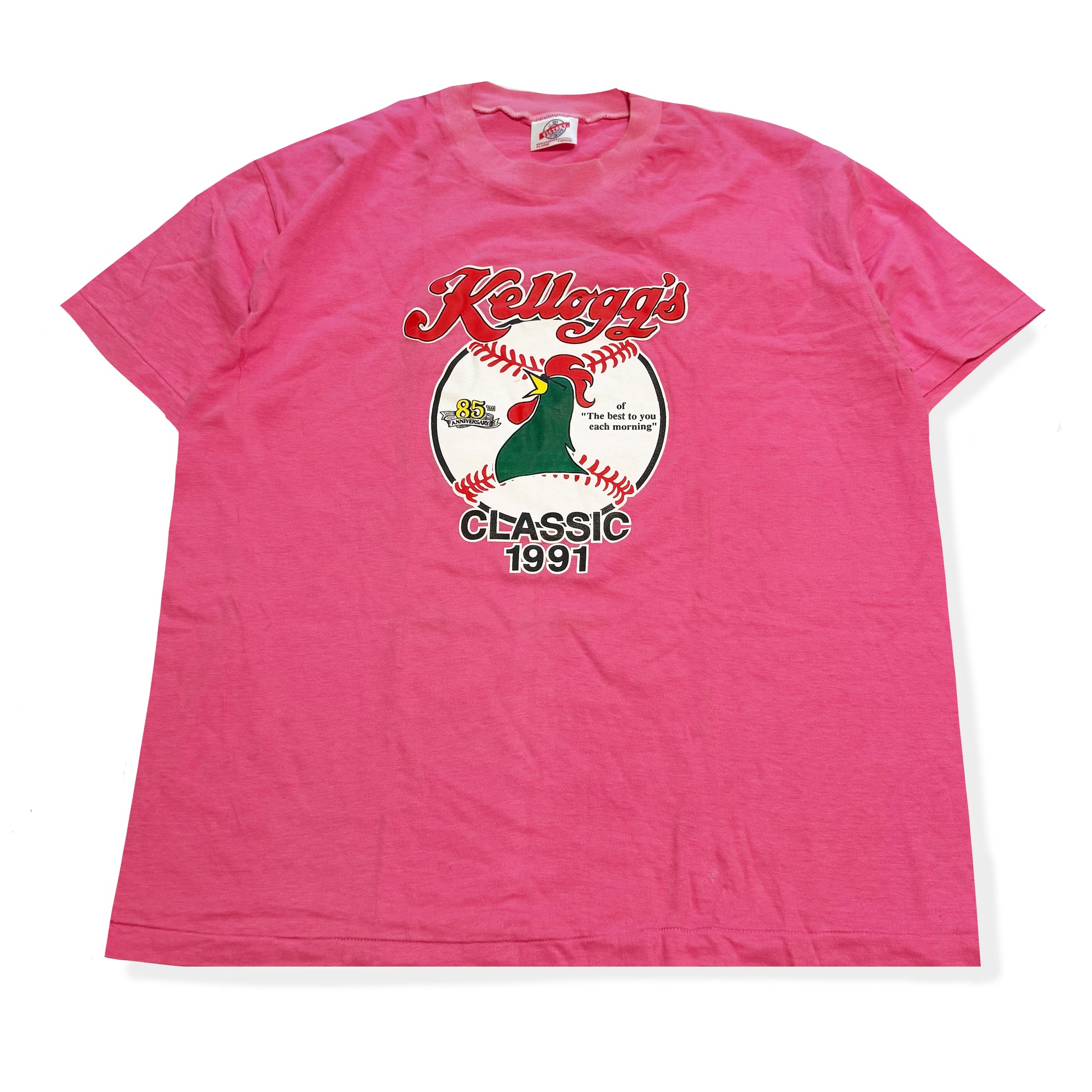 Vintage single stitch oversized fit Kellogg's t-shirt from their 85th anniversary of "The best to you each morning" in 1991. The shirt was likely from the retired Kellogg's factory in London, Ontario. It featured a softball, and their rooster on the front. There is discolouration around the seam around the arm / armpit area.