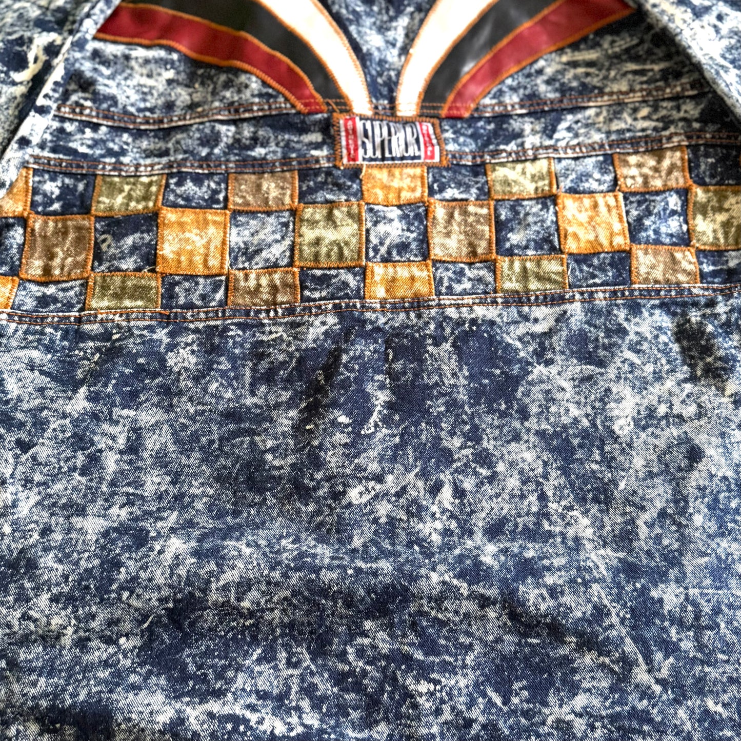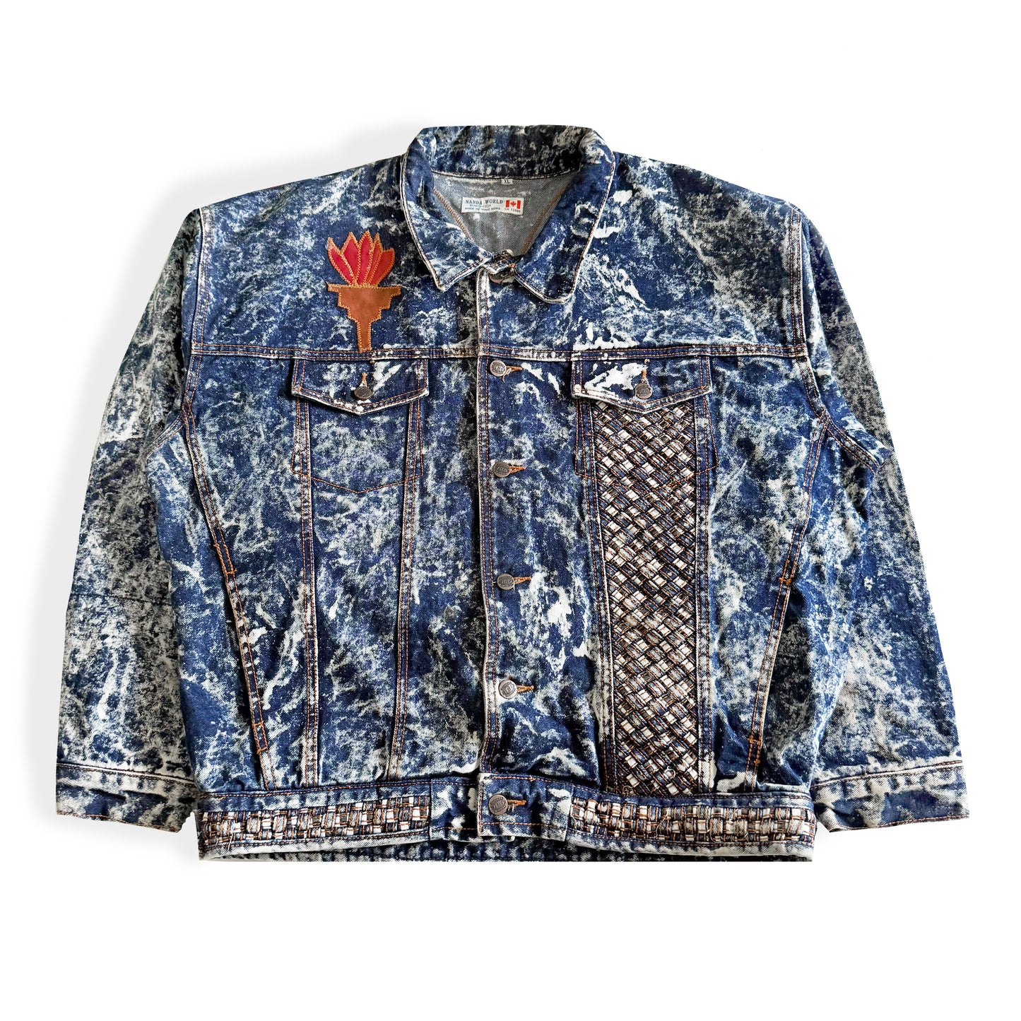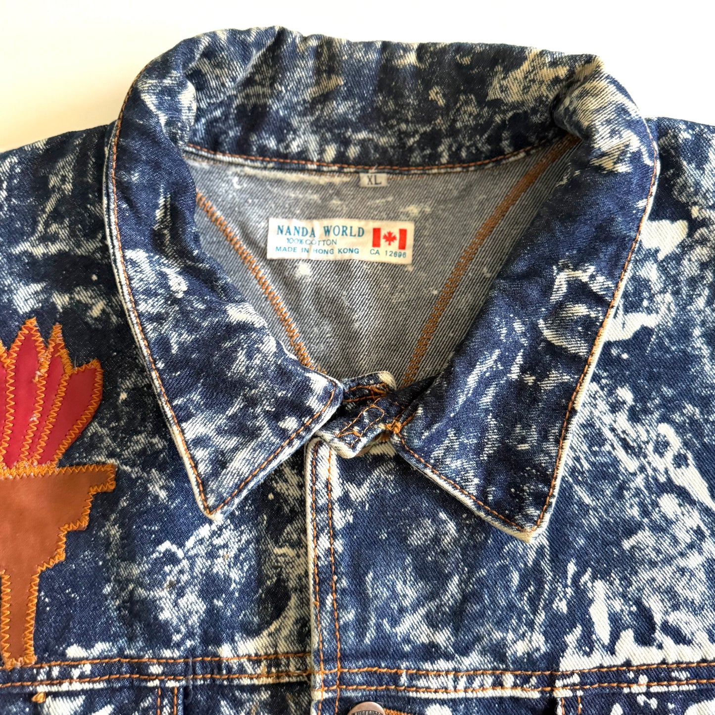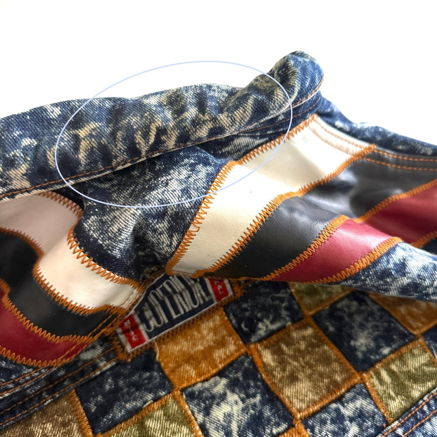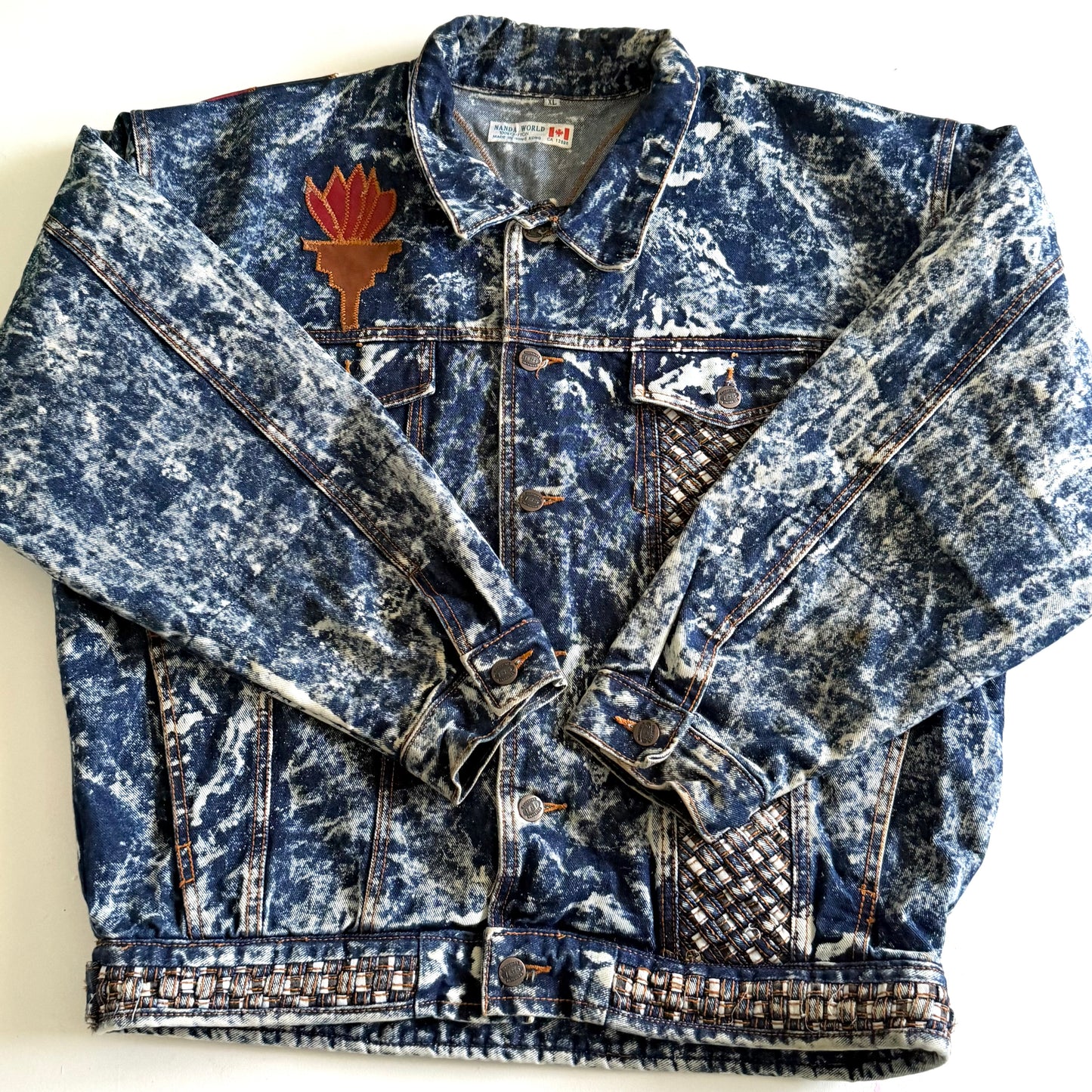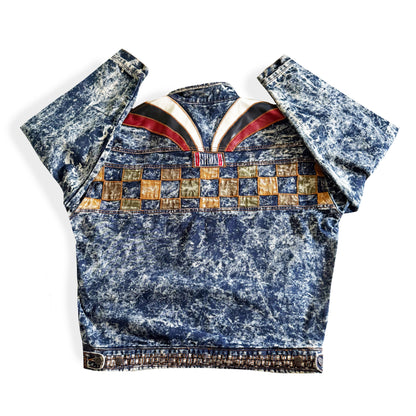 Unique vintage heavy denim jacket with denim woven details, dyed denim patches / checkers, and leather features on the back. Plus an Olympic torch style detail on the front in leather. There are buttons at the bottom for a cinched look. There are some signs of discolouration, but they are fairly camouflaged by the 80's style acid wash look.