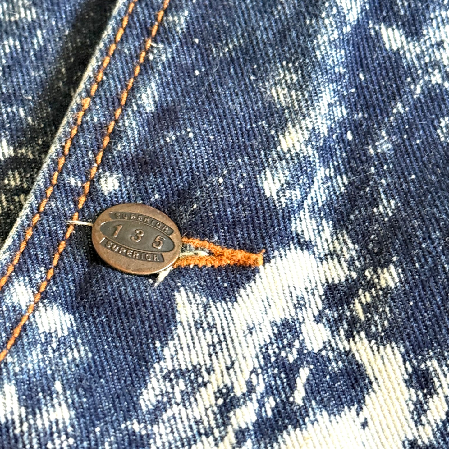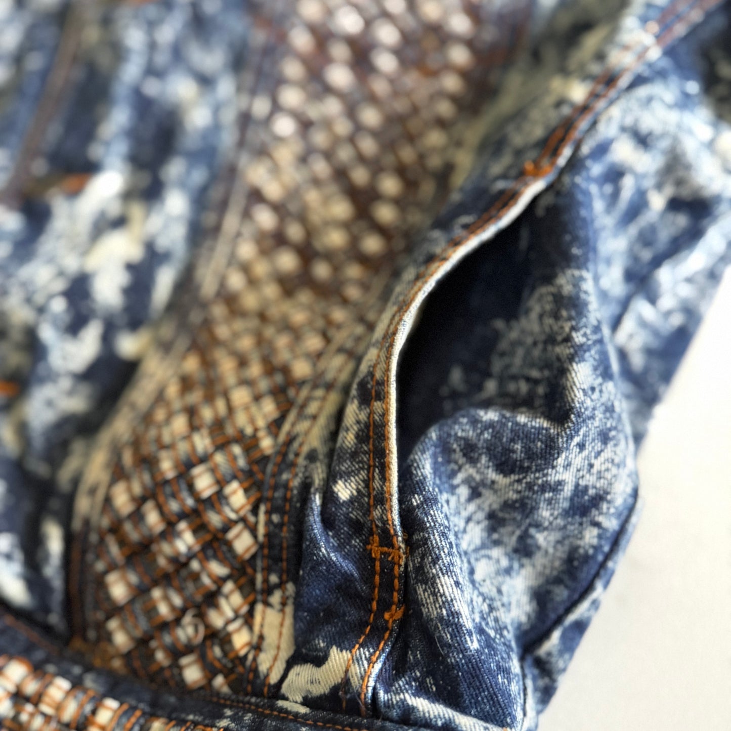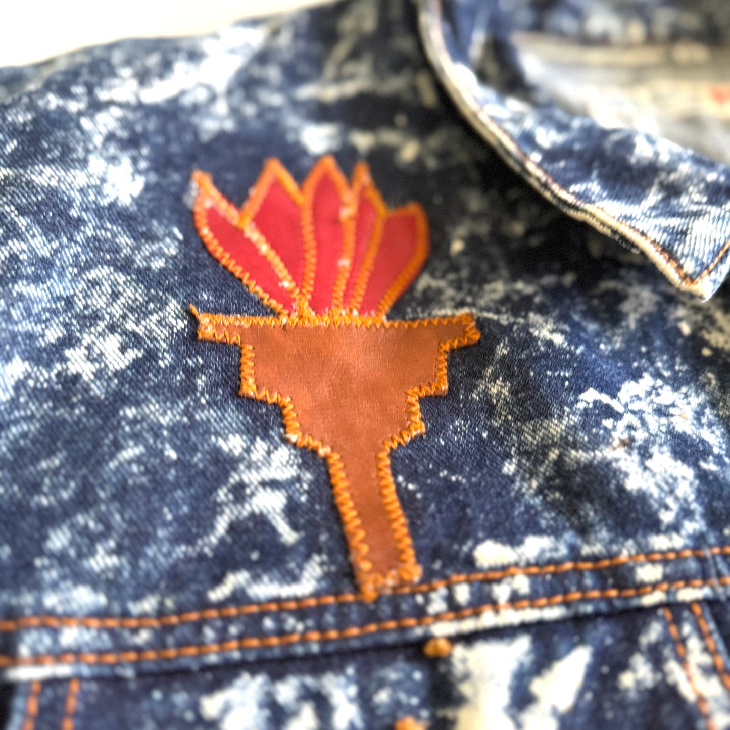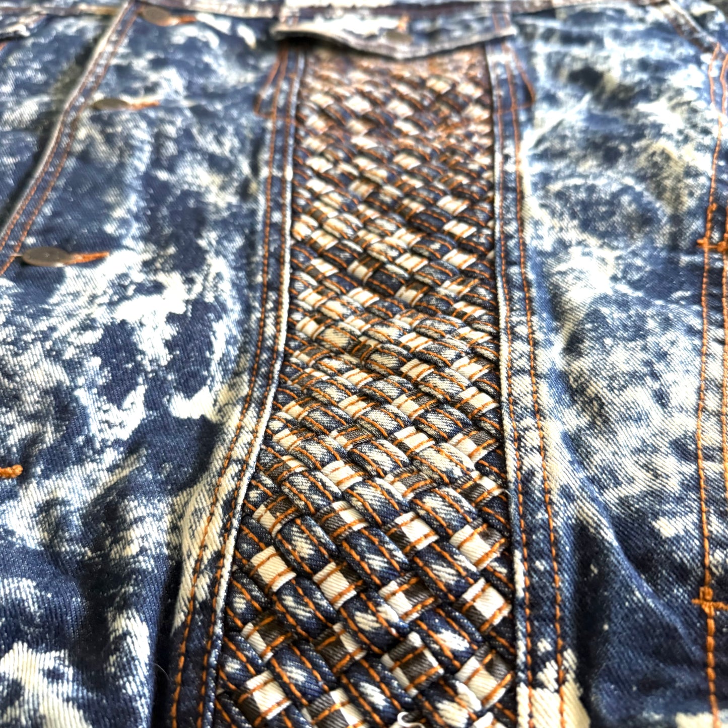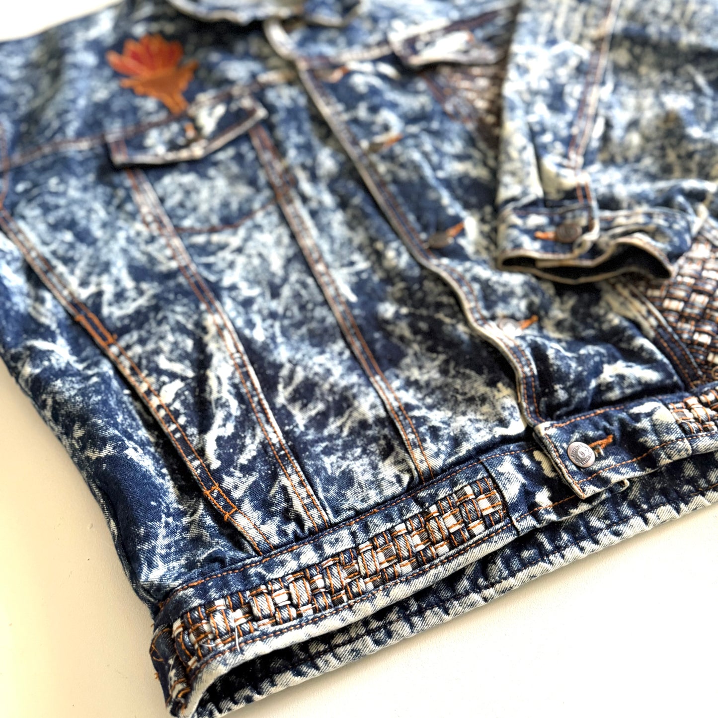 Unique vintage heavy denim jacket with denim woven details, dyed denim patches / checkers, and leather features on the back. Plus an Olympic torch style detail on the front in leather. There are buttons at the bottom for a cinched look. There are some signs of discolouration, but they are fairly camouflaged by the 80's style acid wash look.