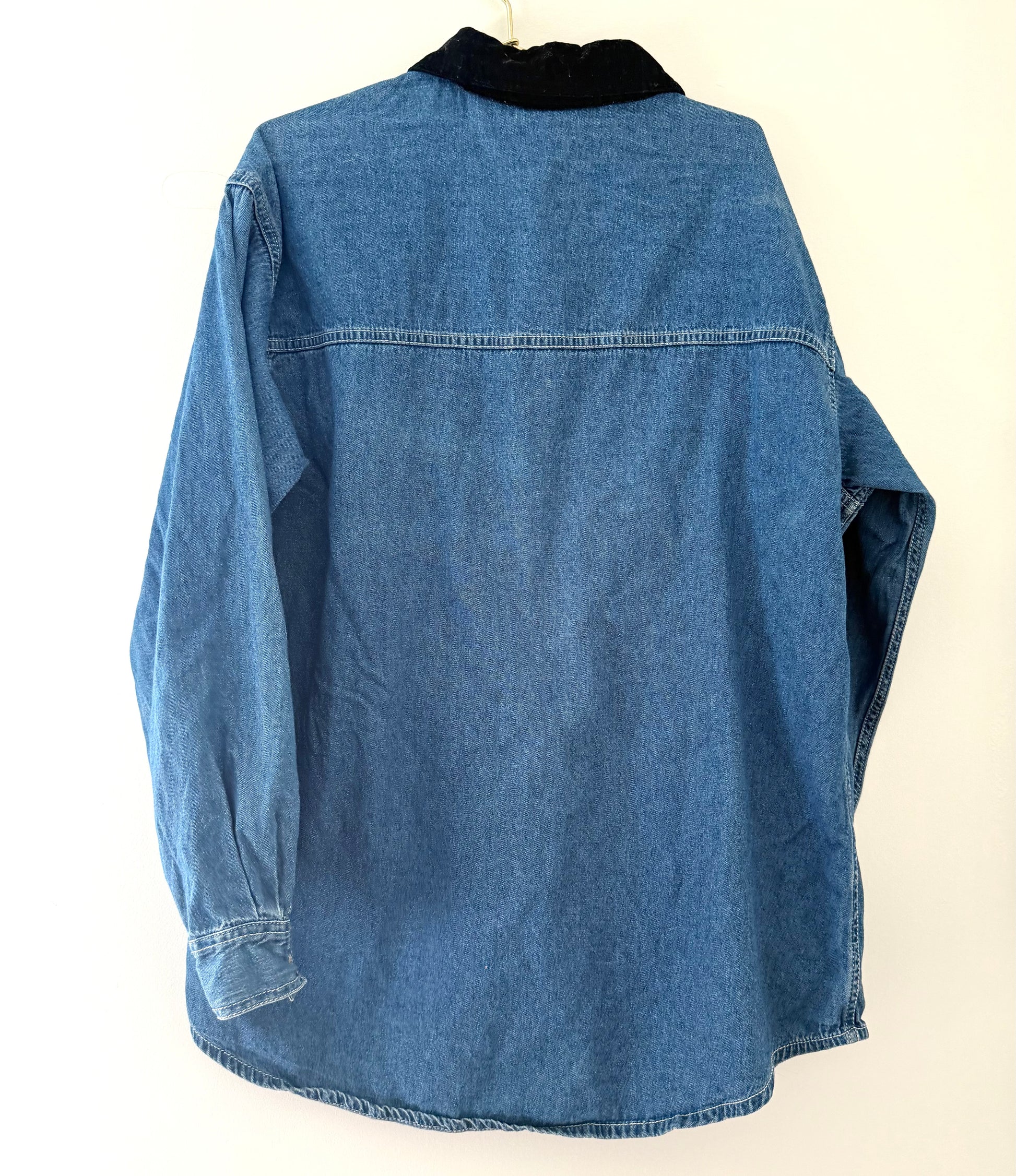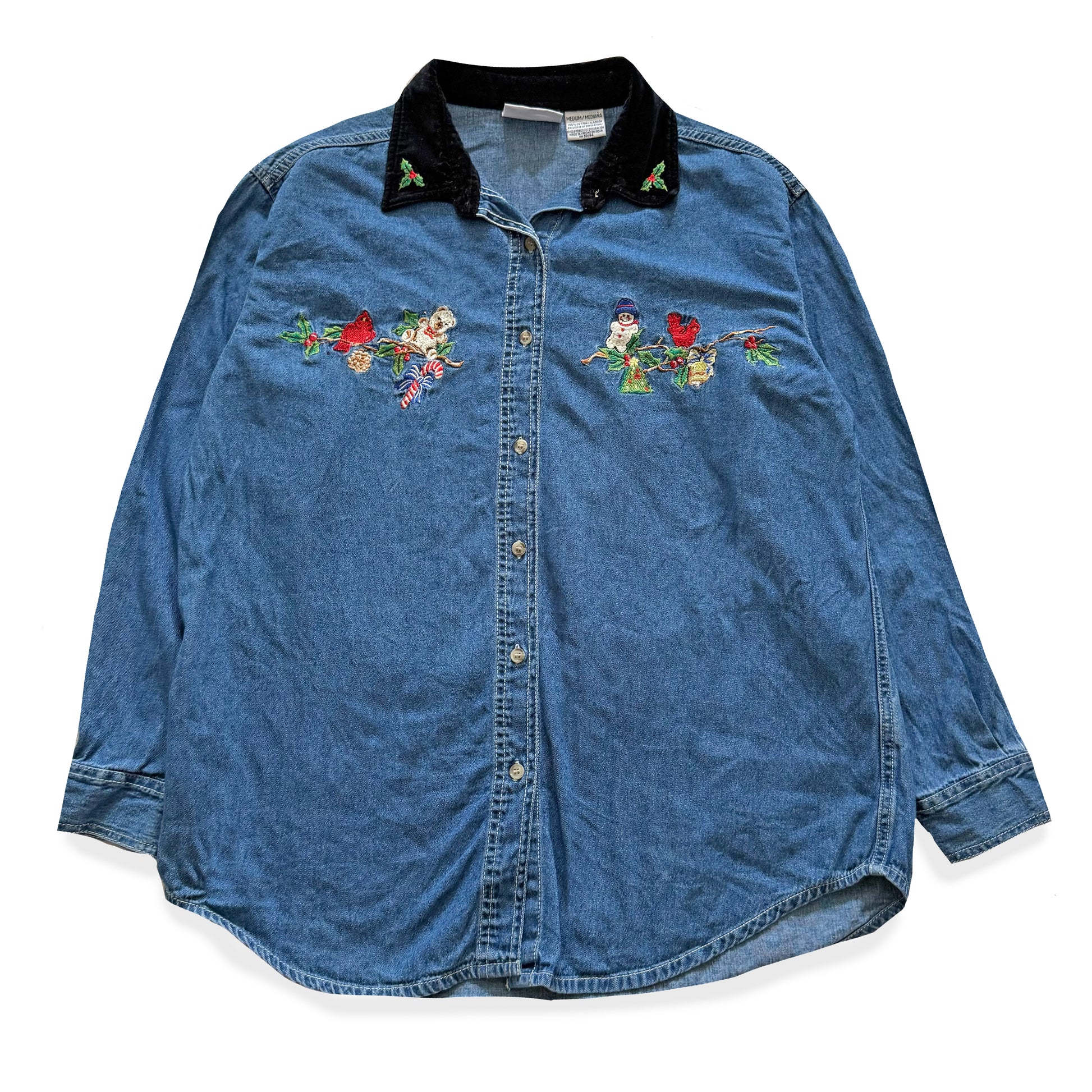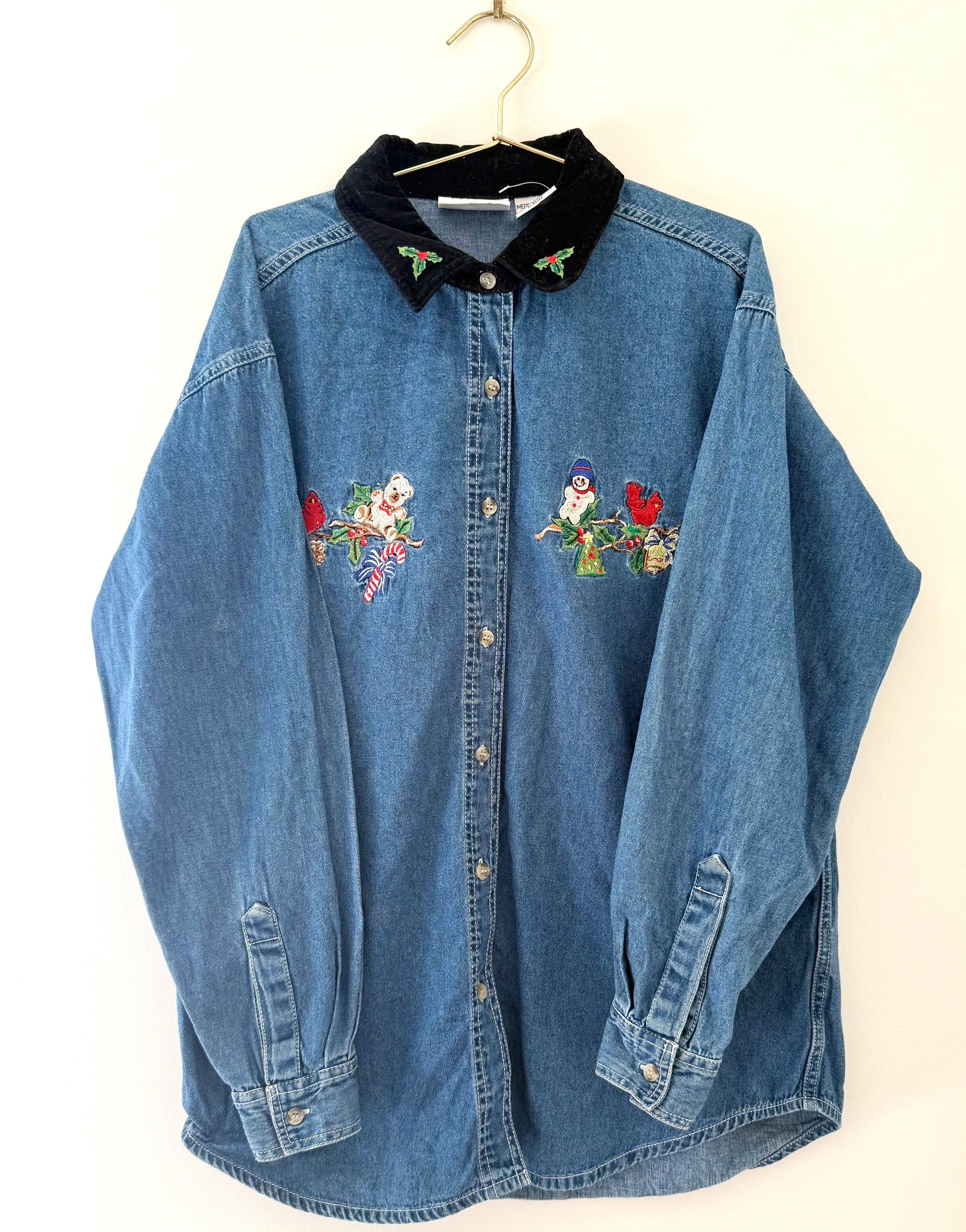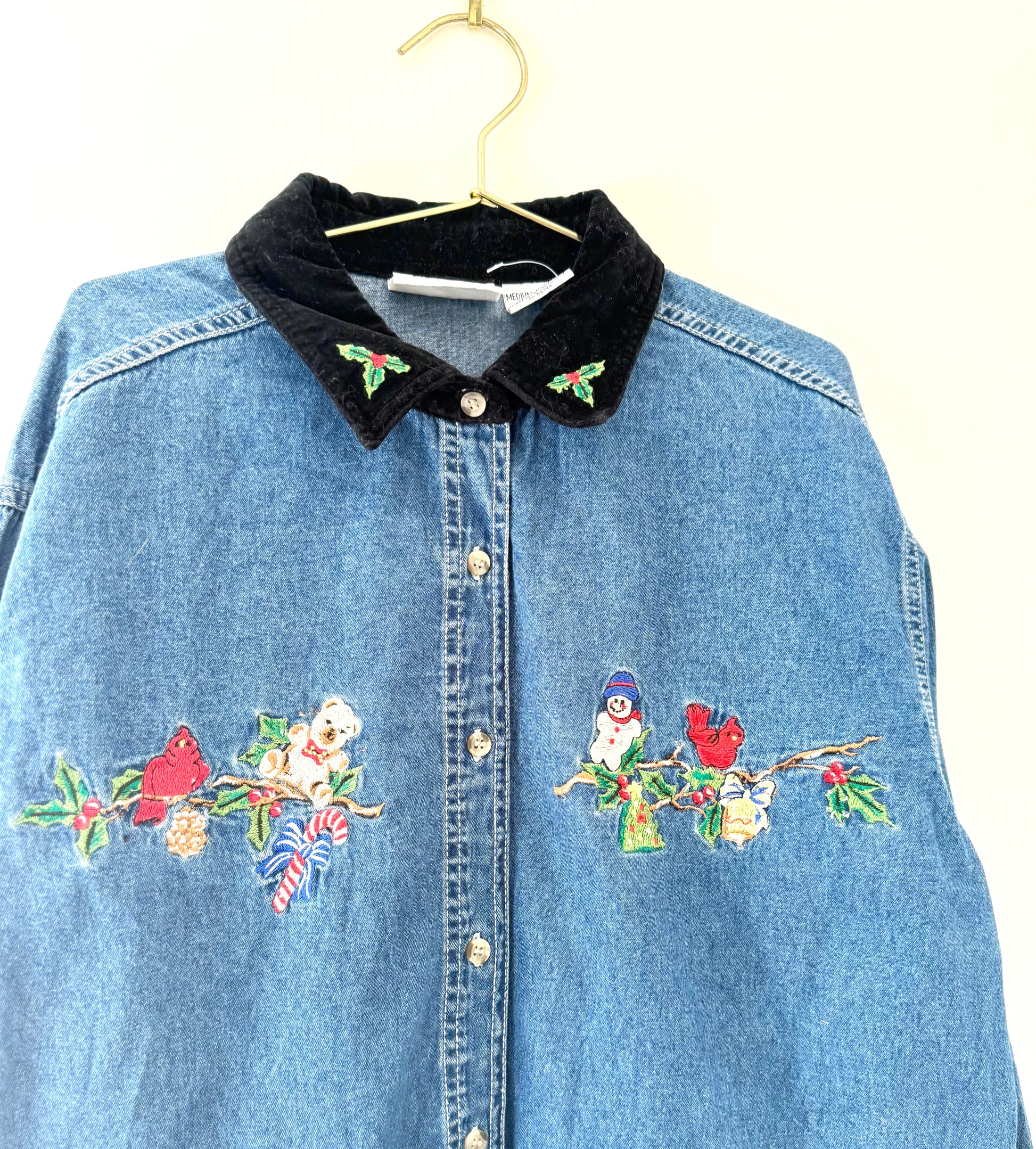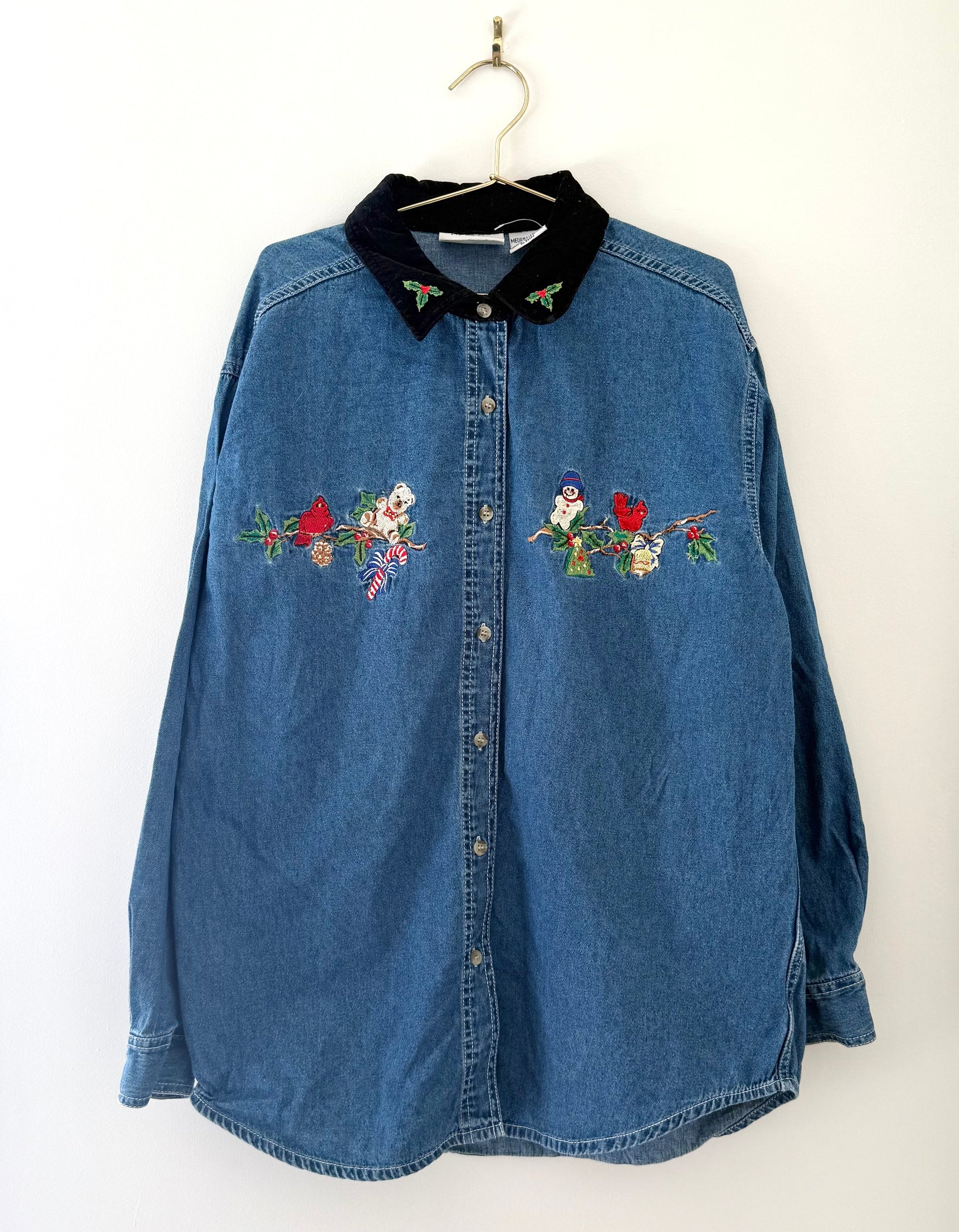 Vintage 90's style denim button down shirt, with a velvet textured collar. There is embroidery on the collar of Christmas Holly, and other embroidered motifs along the top like a holiday bear, candy cane, Cardinal's, snowman, and more.