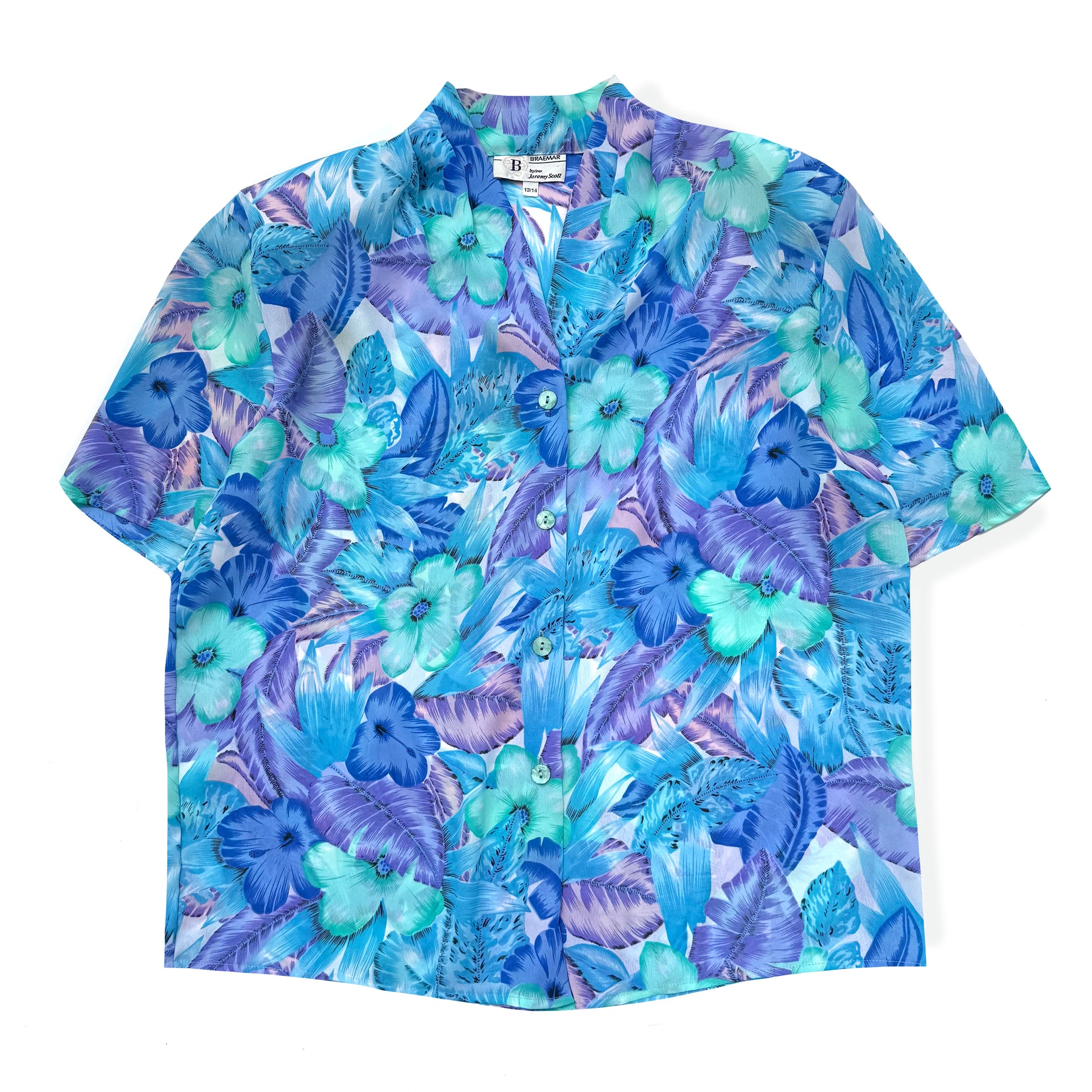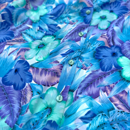 Vintage 90's style tropical floral shirt with an almost neon colour scheme. The button up top has shoulder pads. This apparel could be worn a size up from the "size fits".