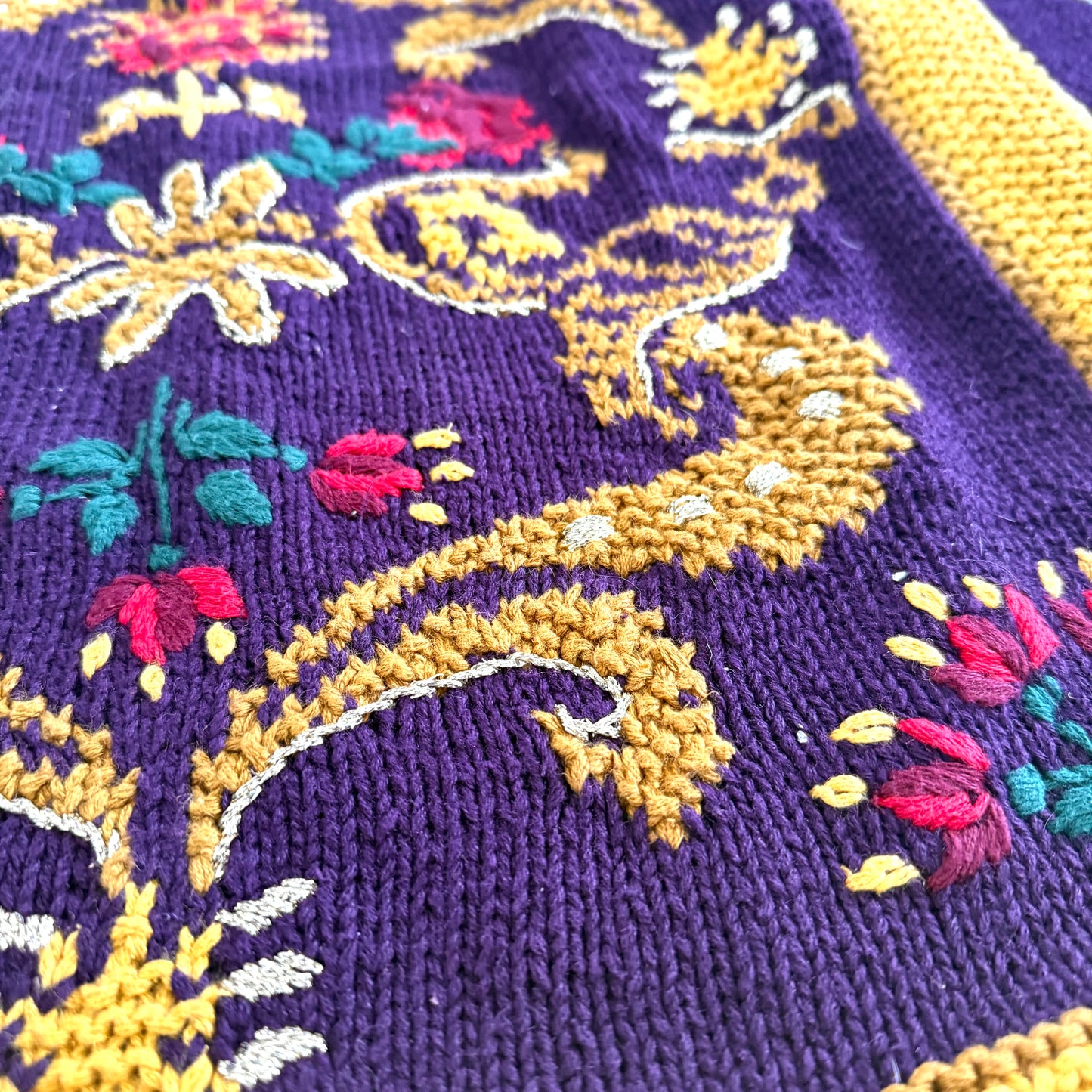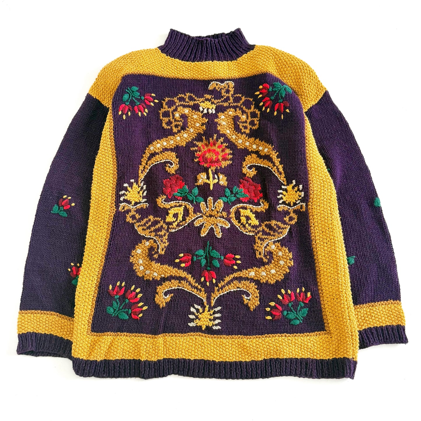 Vintage knitted by hand sweater, with a regal looking floral textured design in a 90's style.