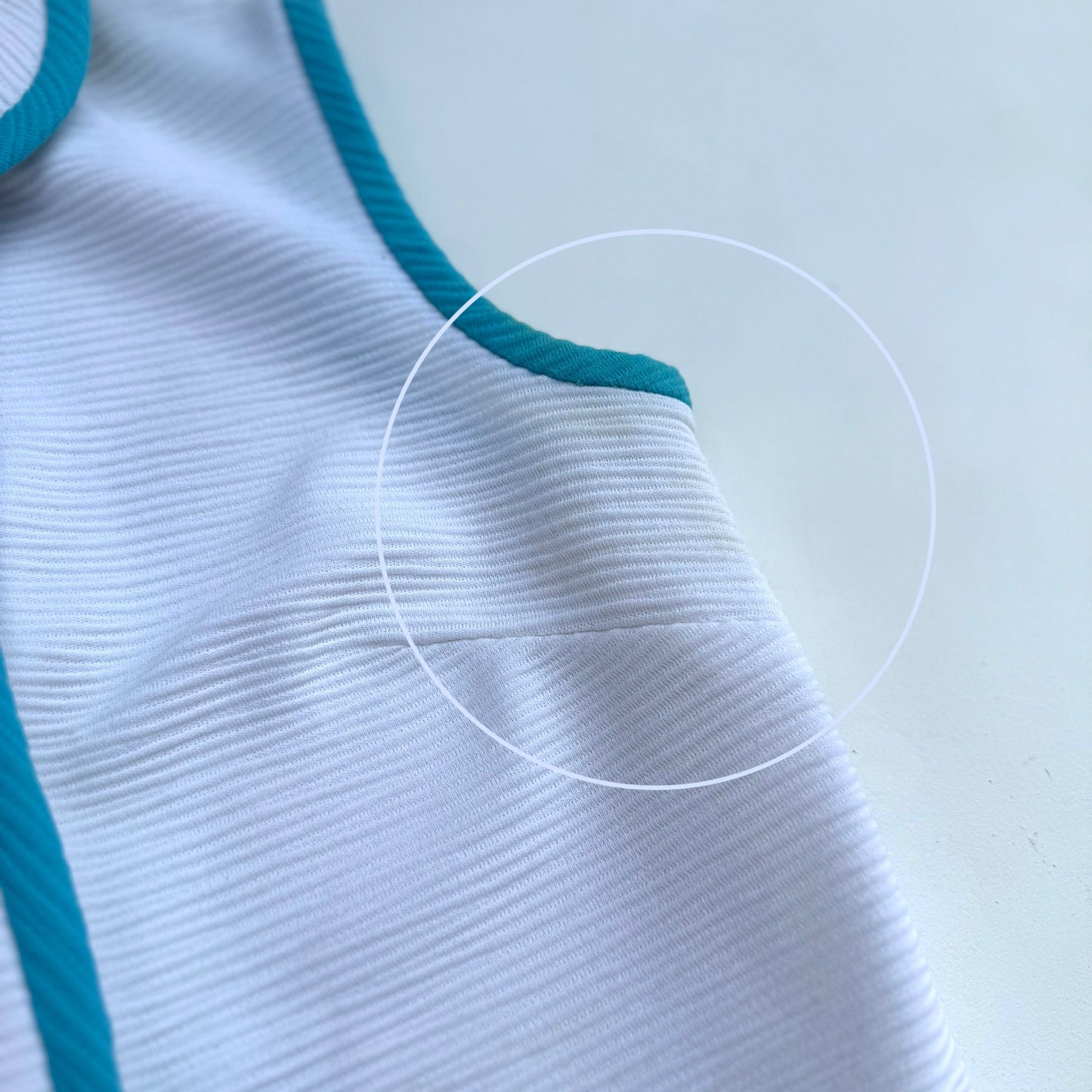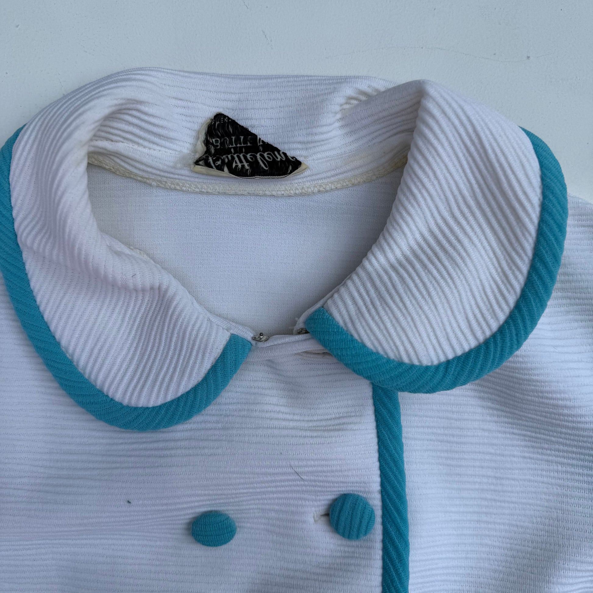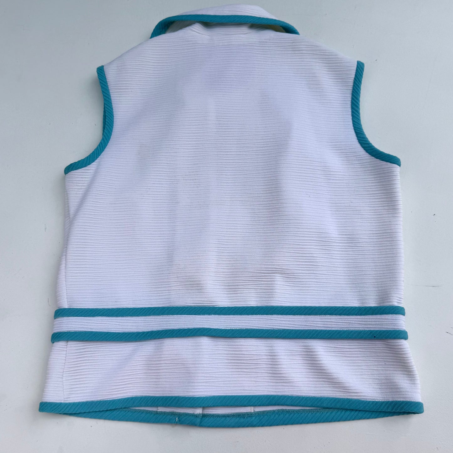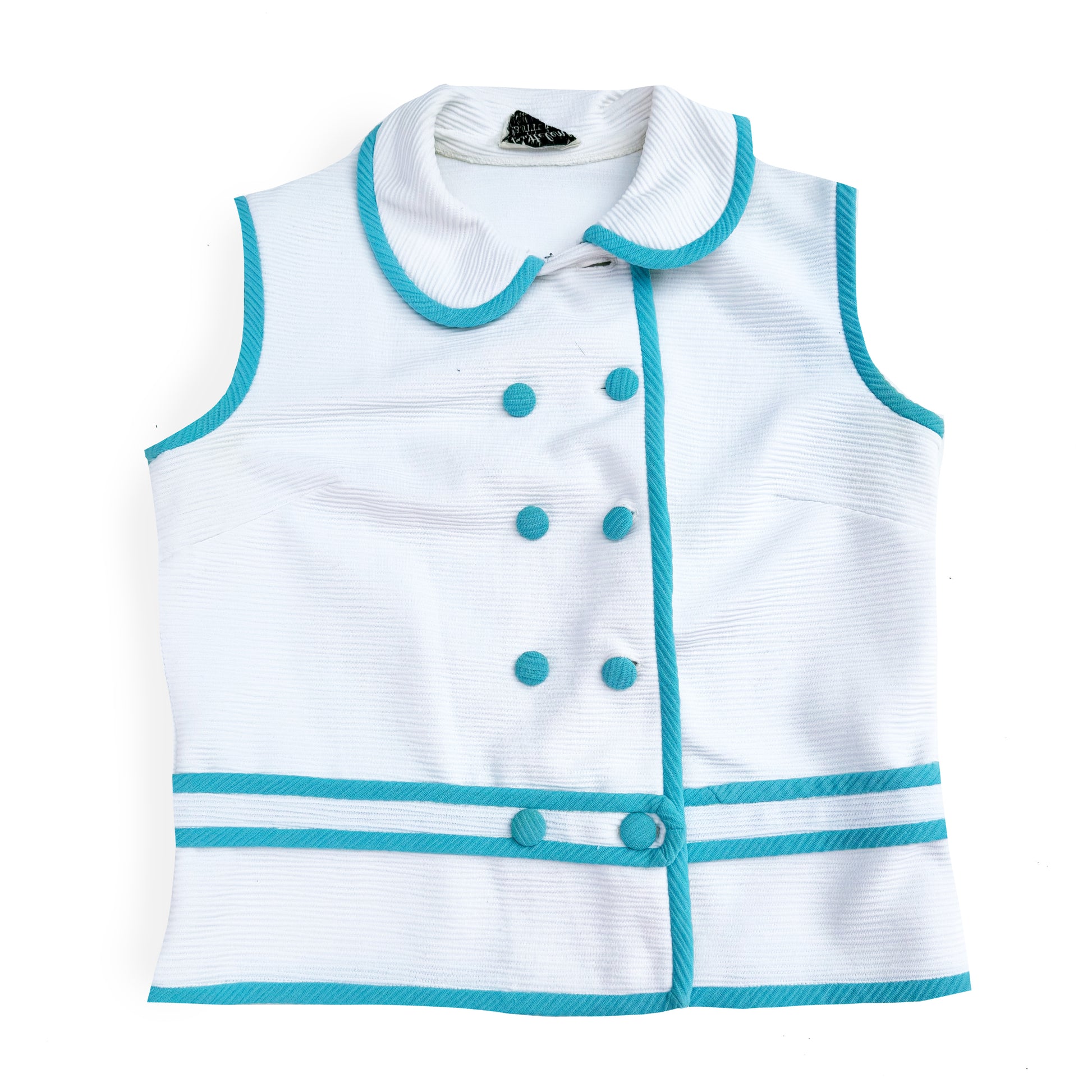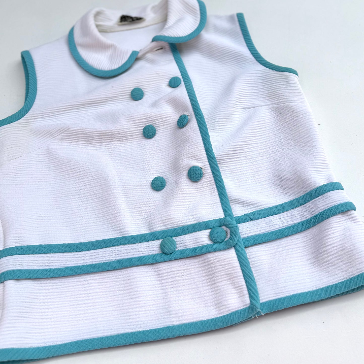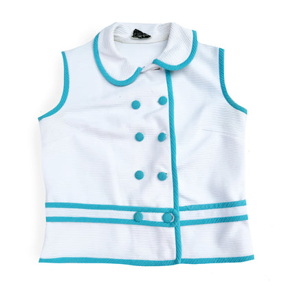 Vintage button up white sleeveless top, with light blue trim details. This 1960's style shirt is thicker, and has some discolouration.