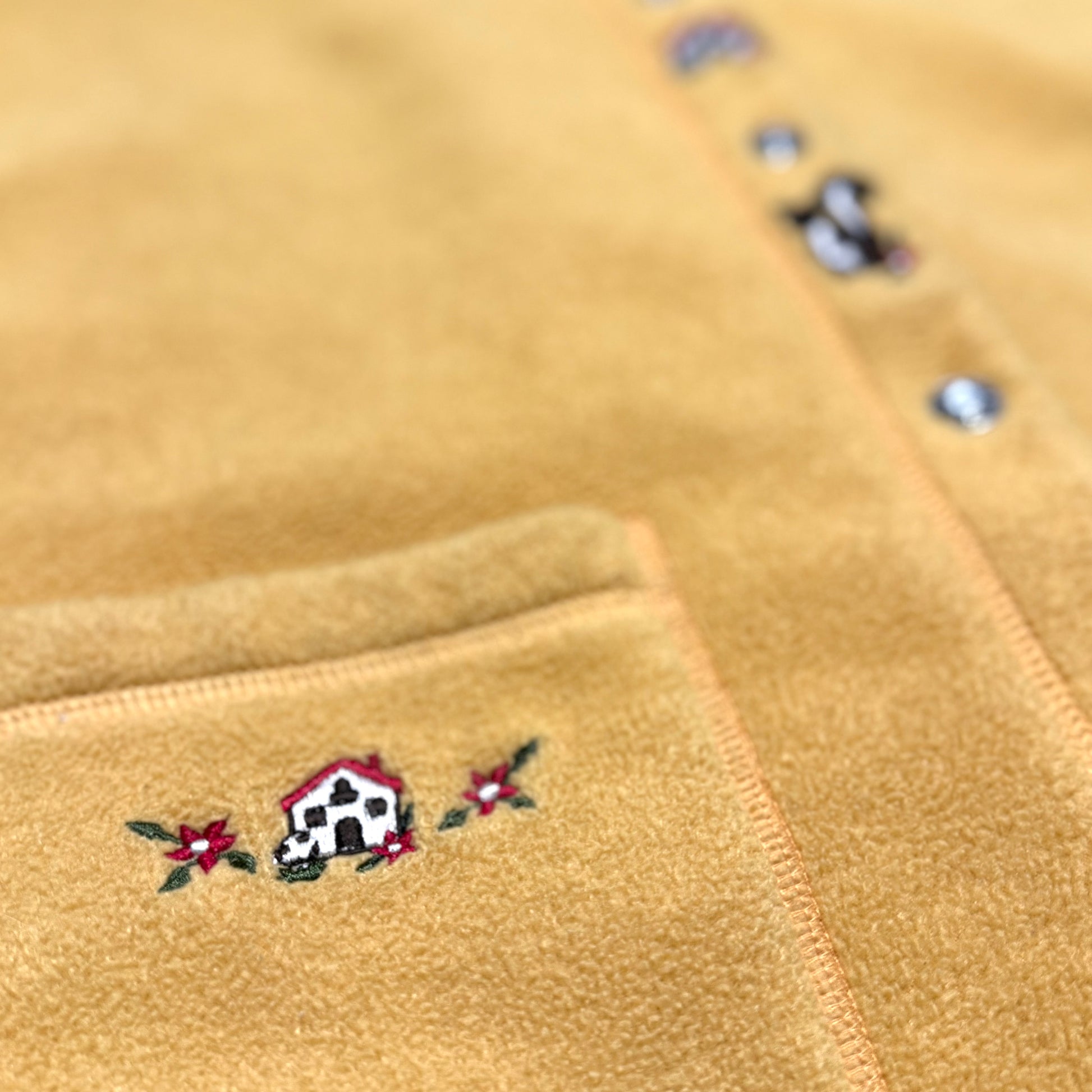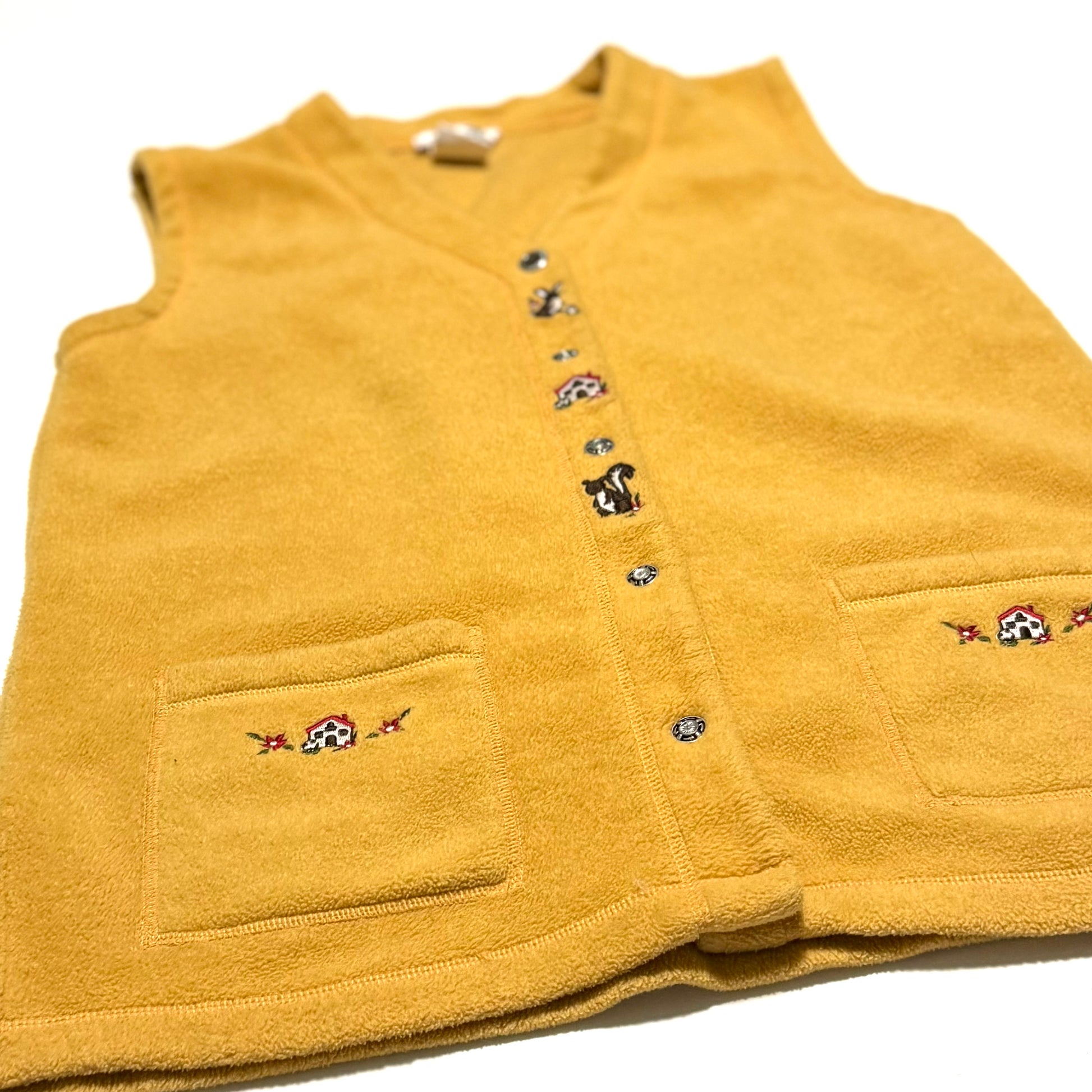 Vintage dark yellow vest, with mushrooms, a bunny, and a squirrel embroidered on it.