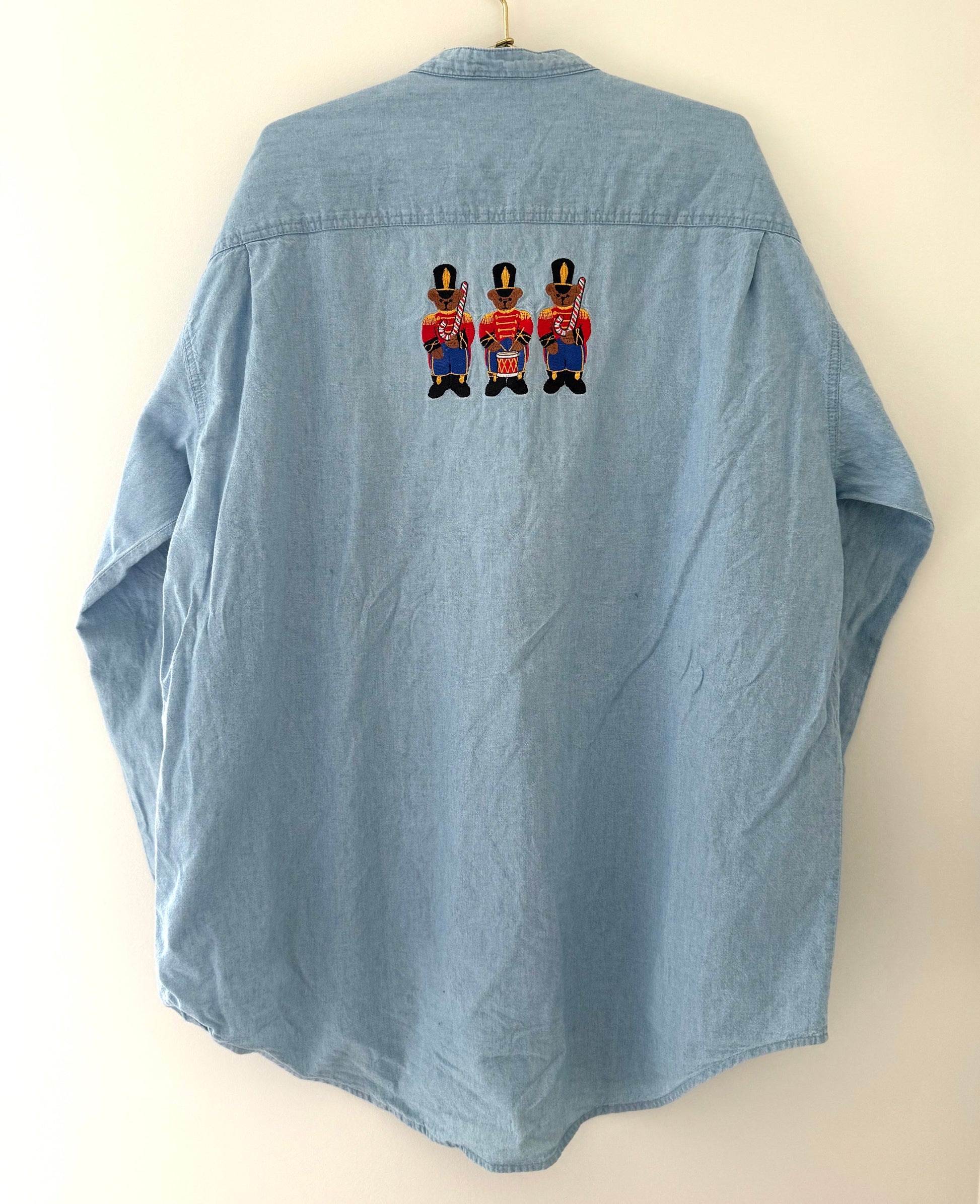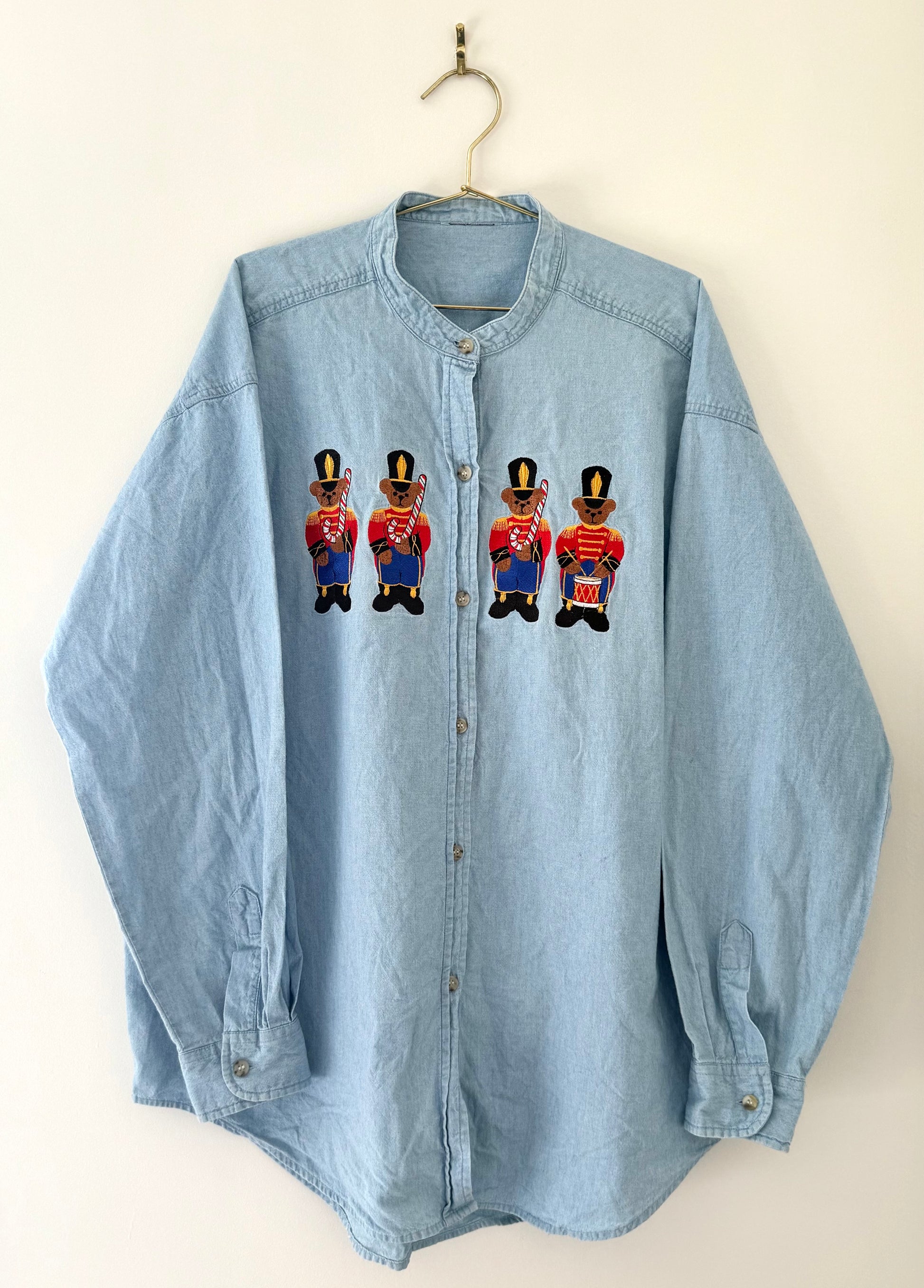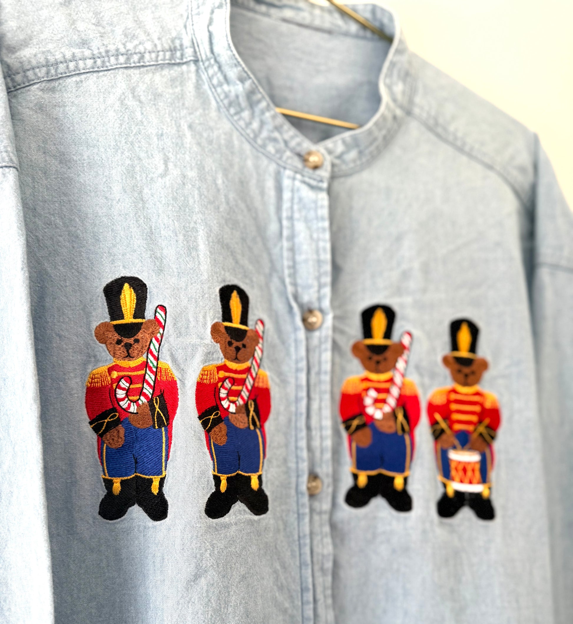 Vintage denim style button down shirt, with 3 embroidered bears wearing nutcracker uniforms and holding candy canes. This 90's style Christmas top does not have a tag. For the best fit please review provided flat measurements.