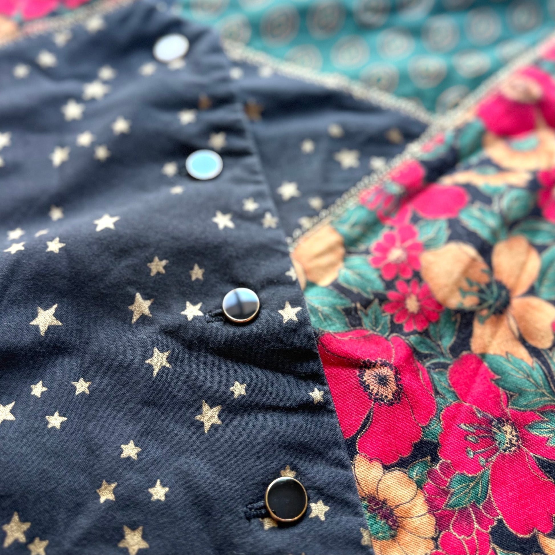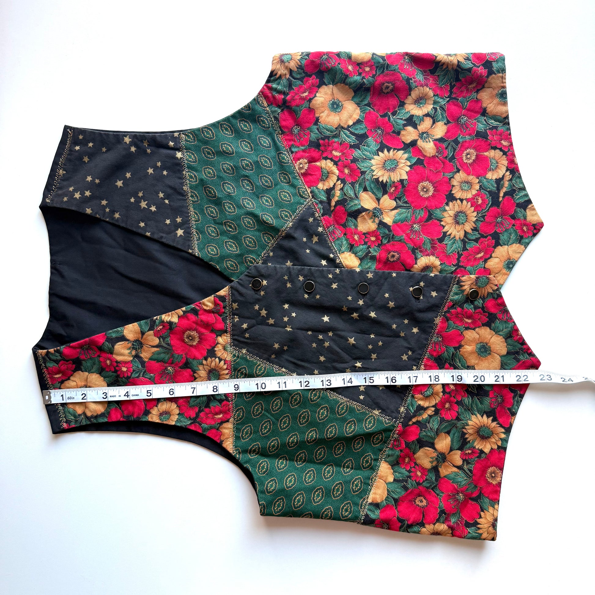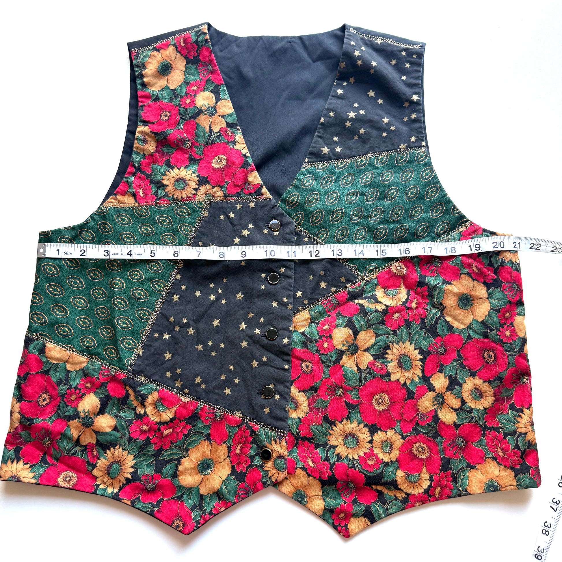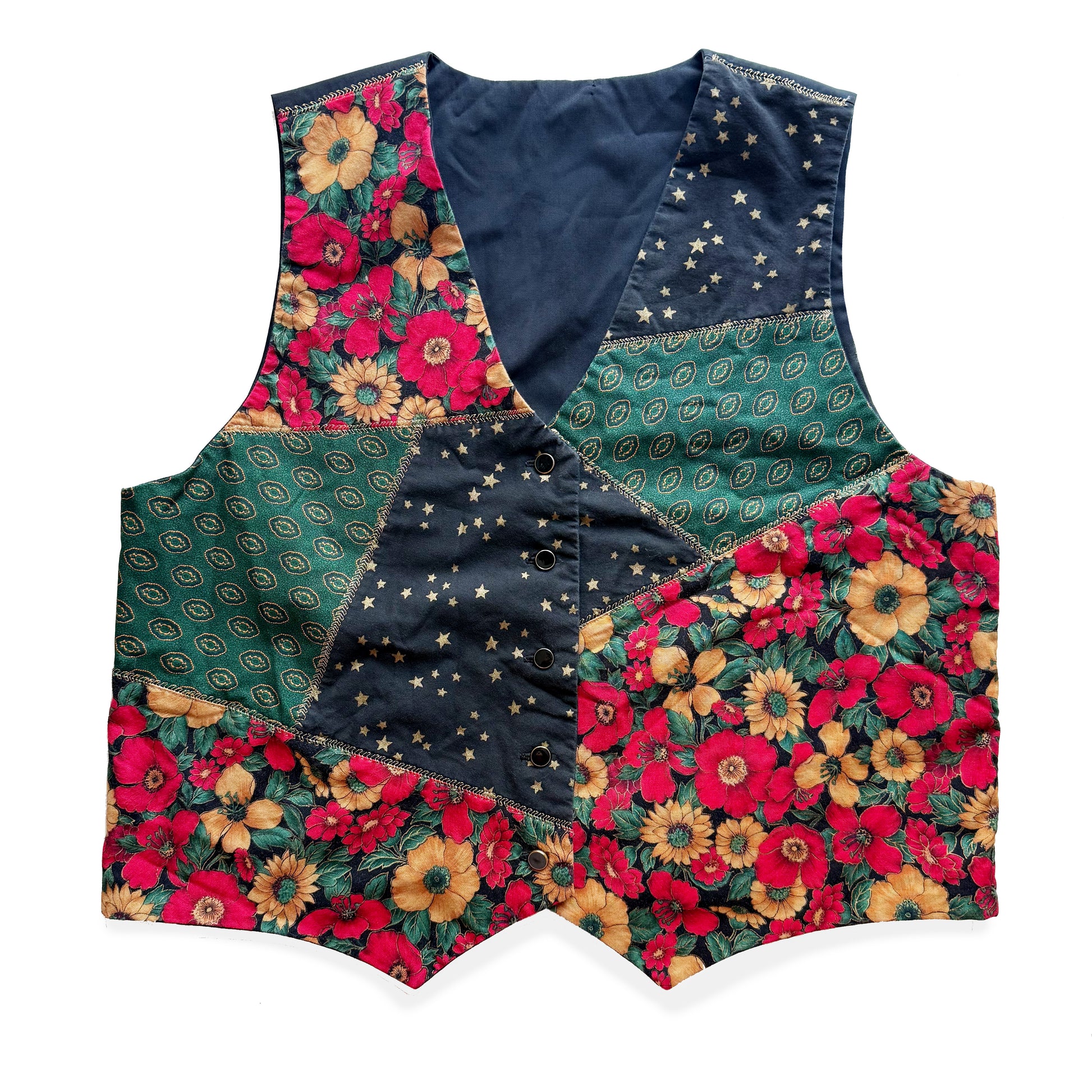 This patchwork style vest with Christmas florals, and New Years stars was likely handmade. The colour scheme is perfect for the winter holiday season.