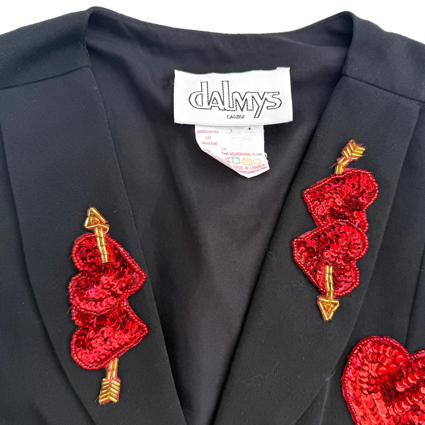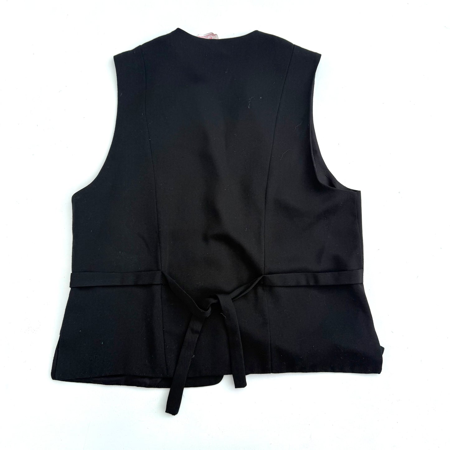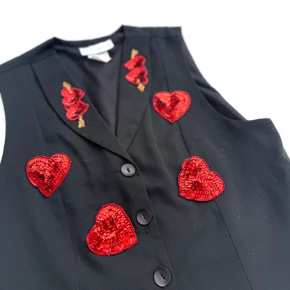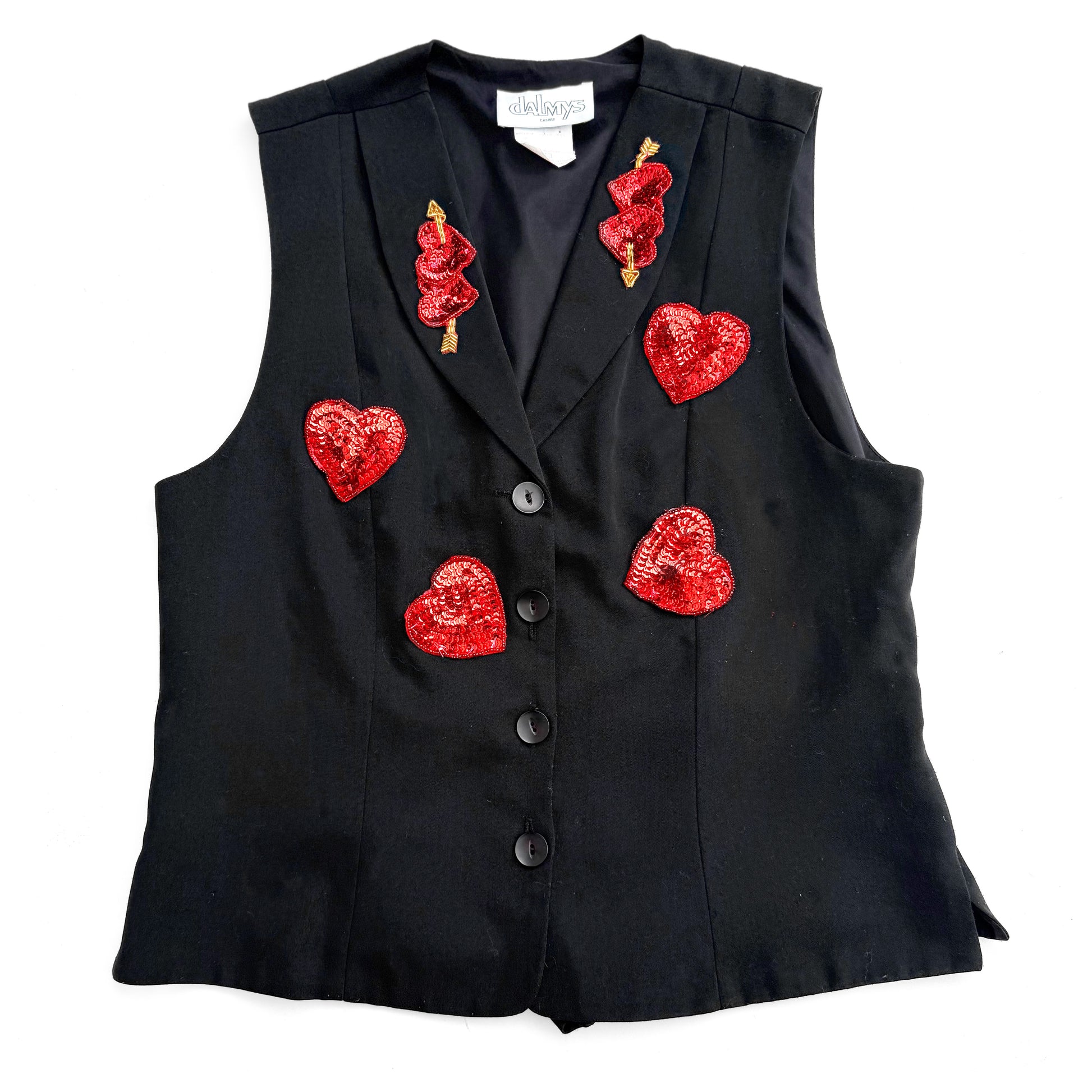 Vintage black vest, with tie at the back. This retro apparel has sequences heart's on it that may have been added by a previous owner or manufacturer. The perfect addition to your anniversary or Valentines Day wardrobe!