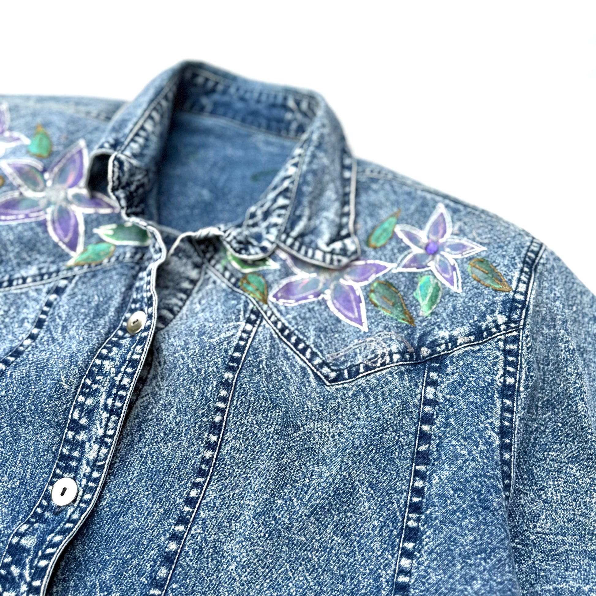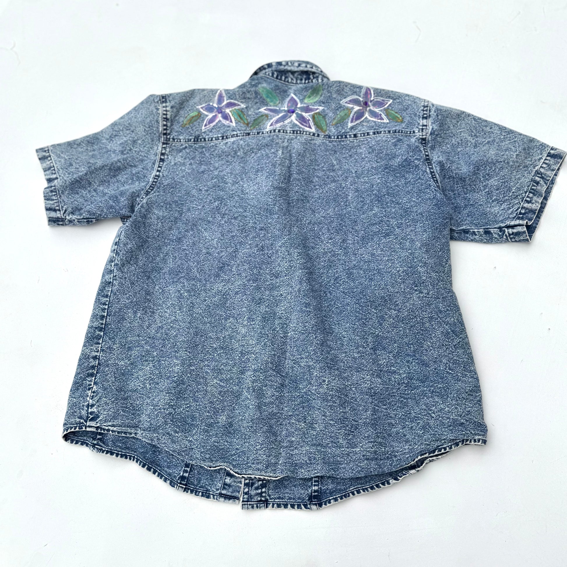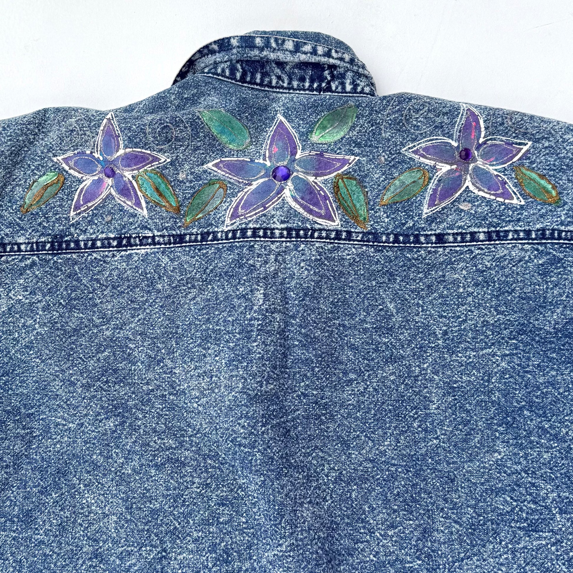 Vintage 90's style denim button up shirt, with floral details. There are rhinestones in the centre of some of the flowers. The apparel has shoulder pads.