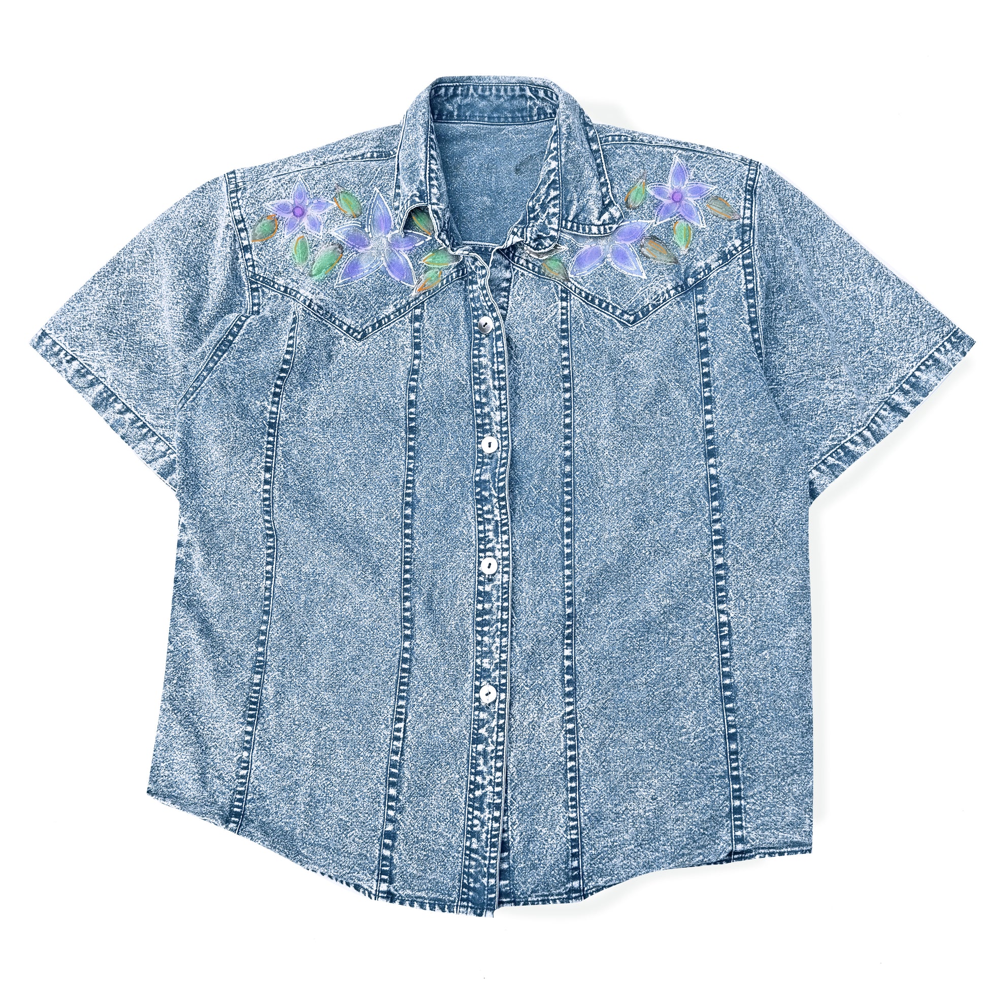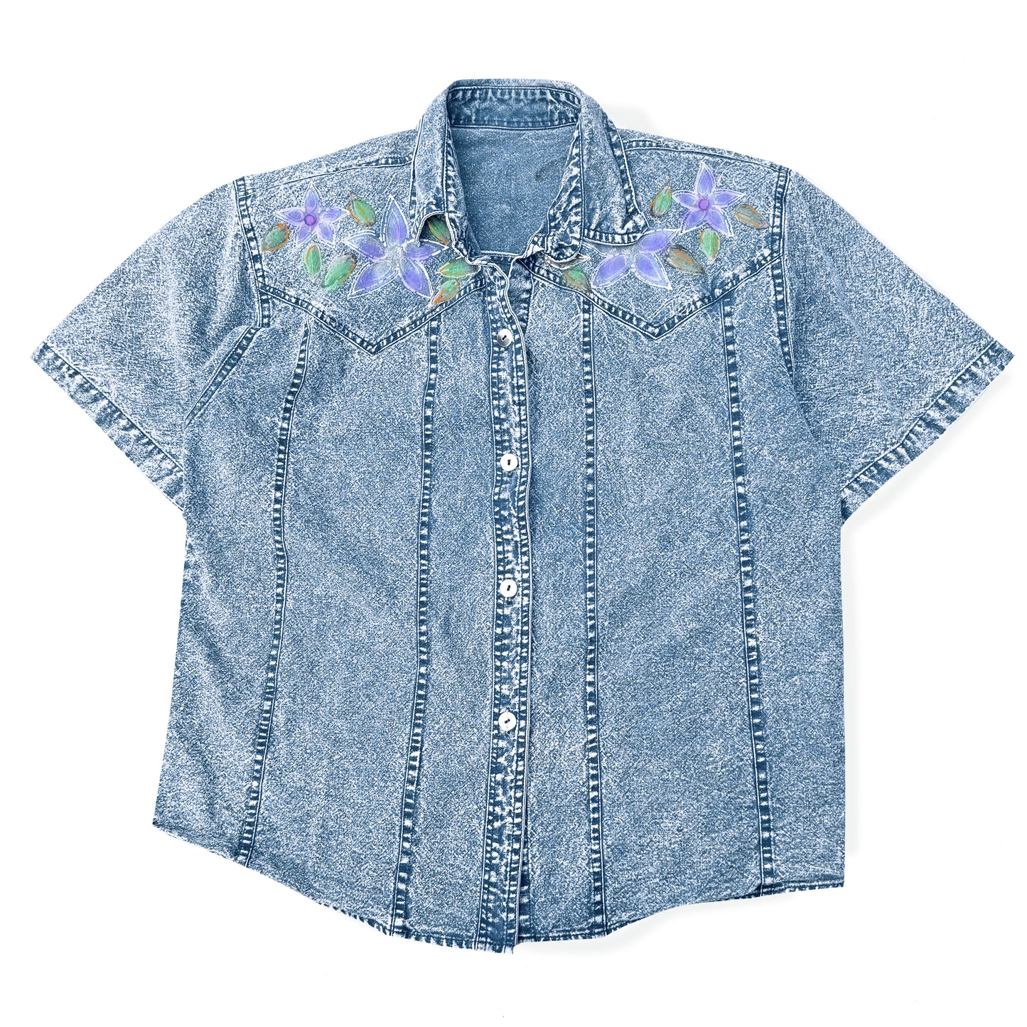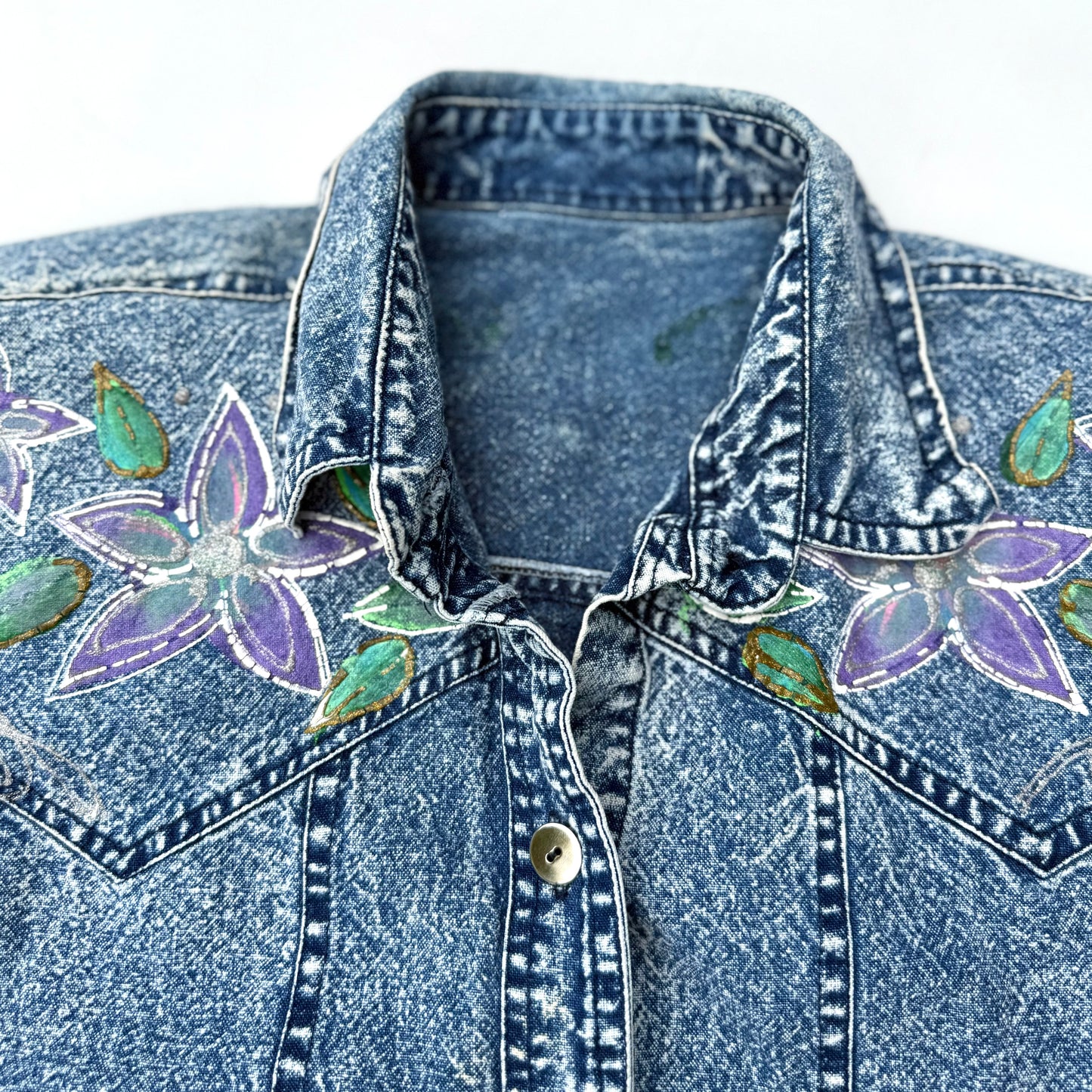 Vintage 90's style denim button up shirt, with floral details. There are rhinestones in the centre of some of the flowers. The apparel has shoulder pads.