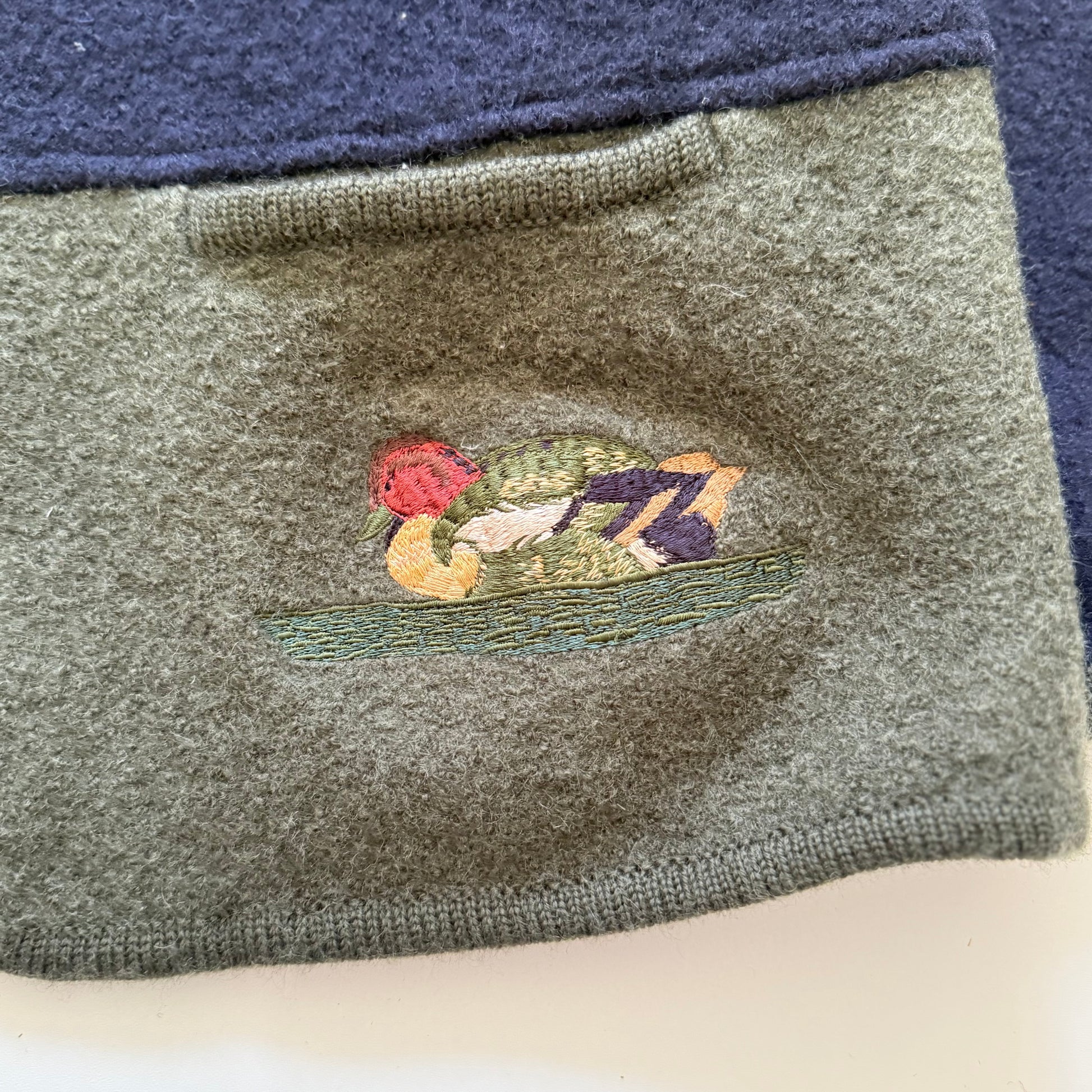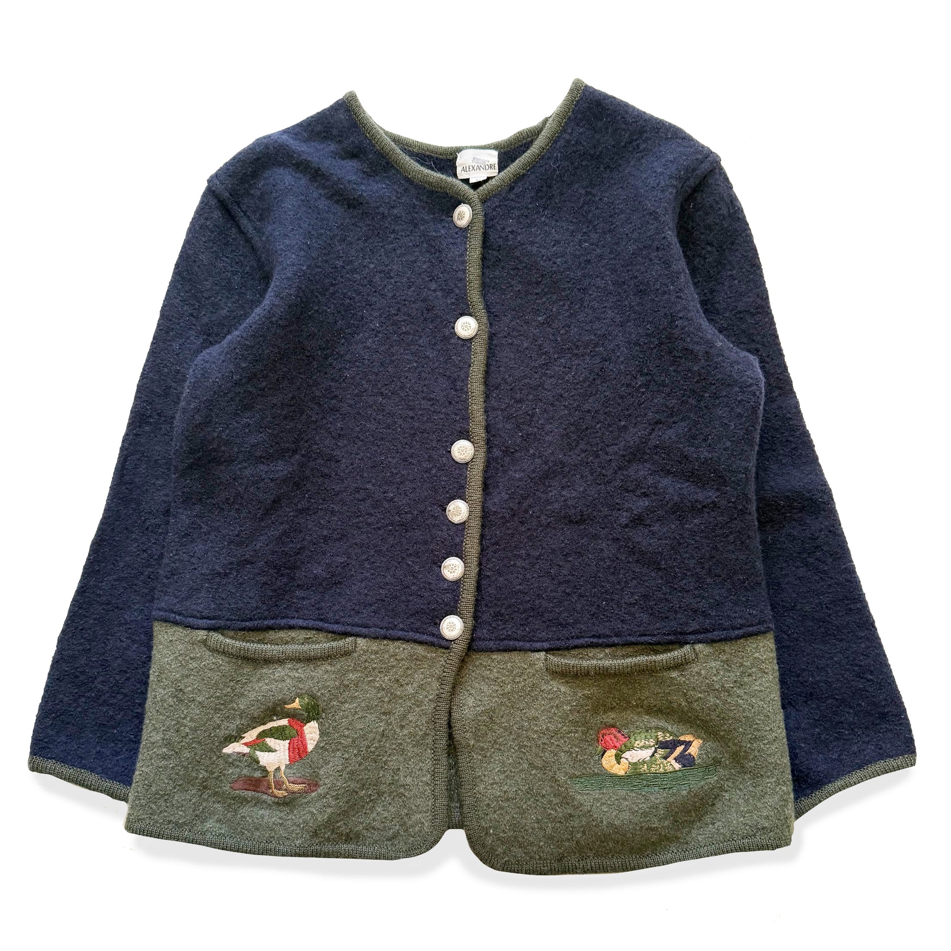 Vintage navy blue and green button down sweater, with ducks embroidered on the pockets.