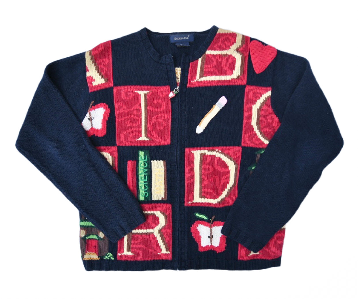 Dark blue knit cardigan with various letters in squares with pencils, books, apples, and other school style objects. The zipper has a ceramic feeling apple.