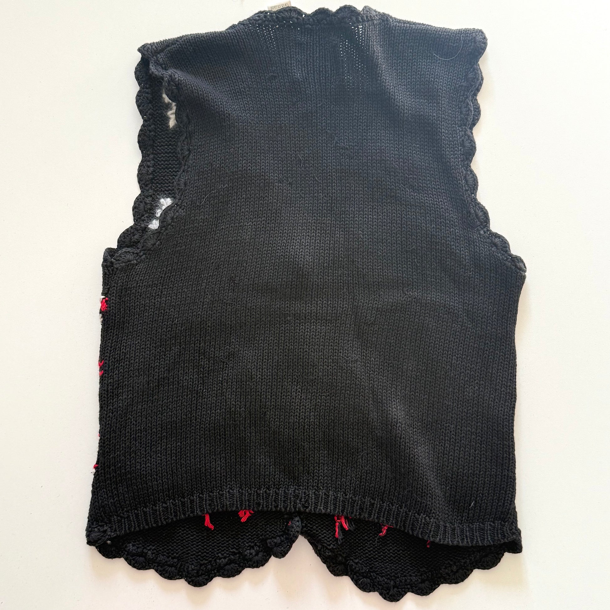 Vintage black holiday vest, wth reindeer, snow flakes, and Christmas trees. This festive top was hand knit.