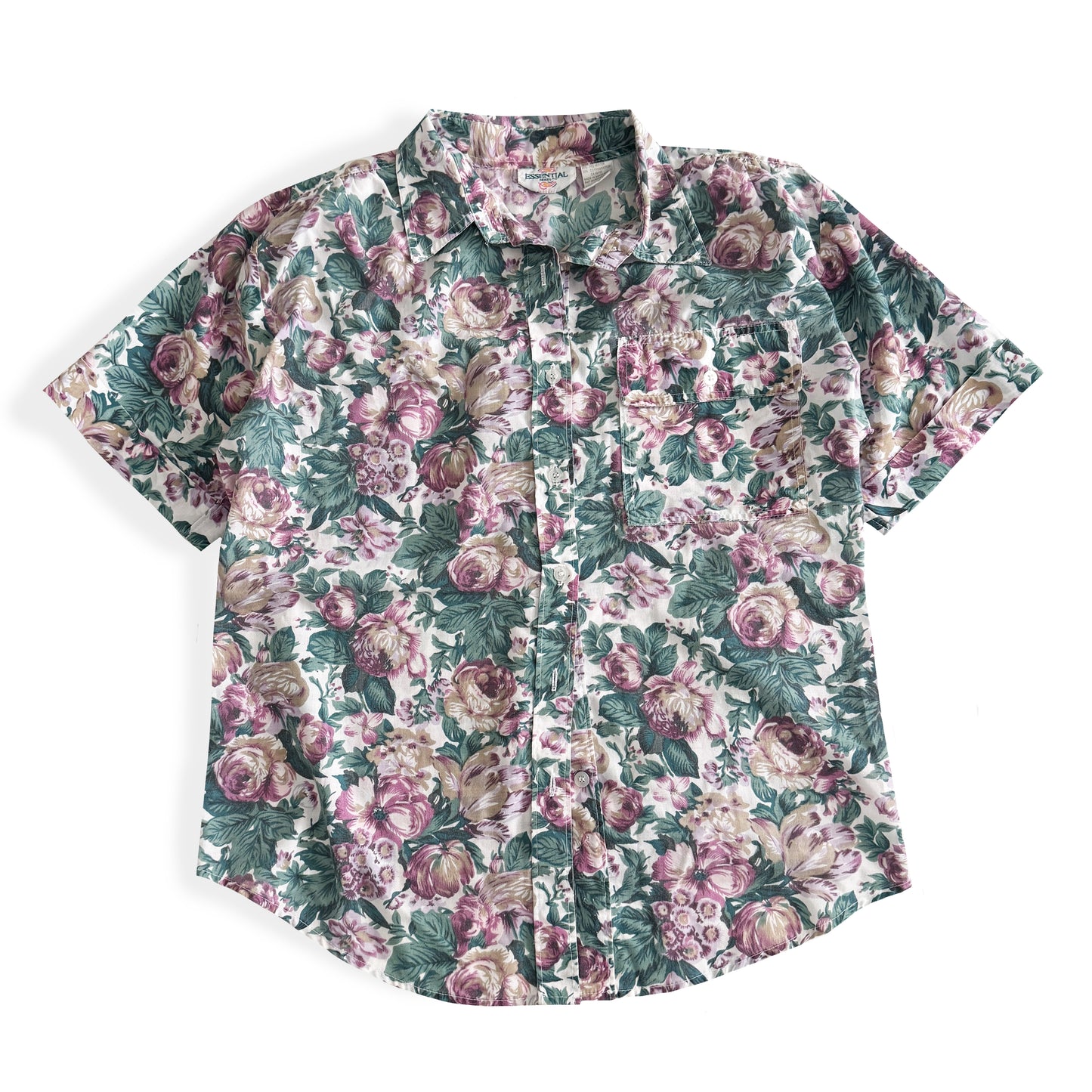 This vintage short sleeve button up shirt has a 1980's retro style. The floral pattern and shoulder pads are a perfect pair for a sustainable spring wardrobe.