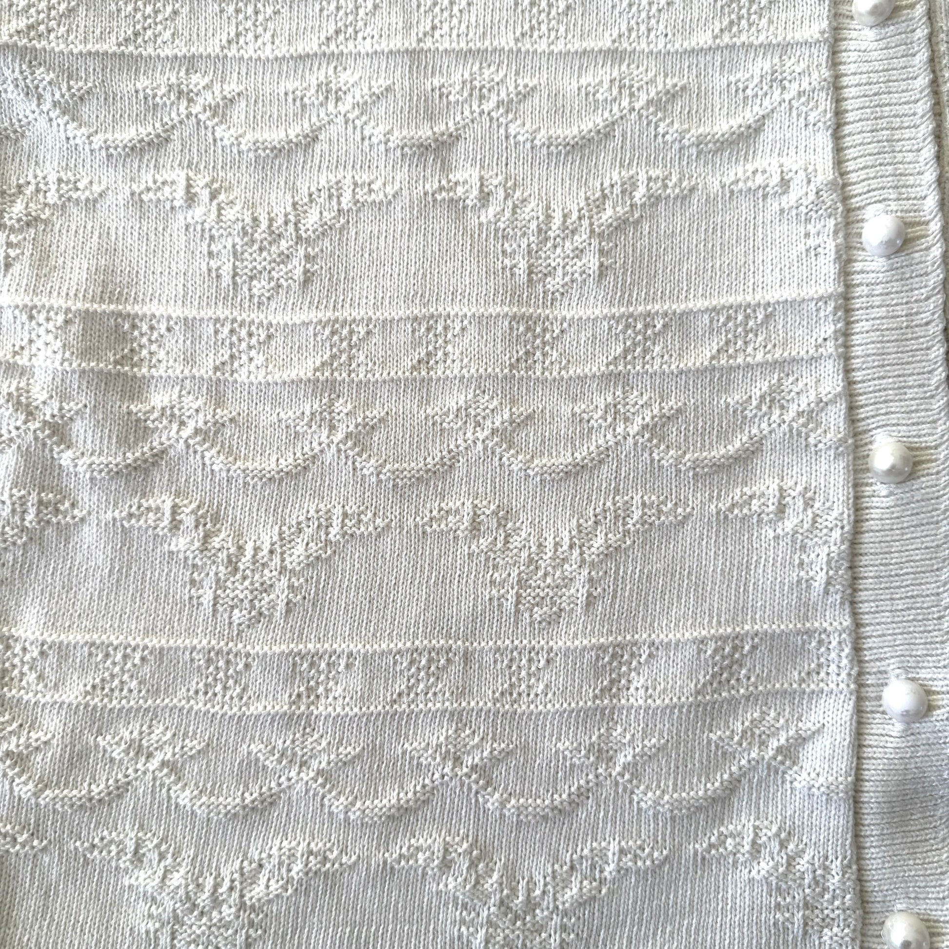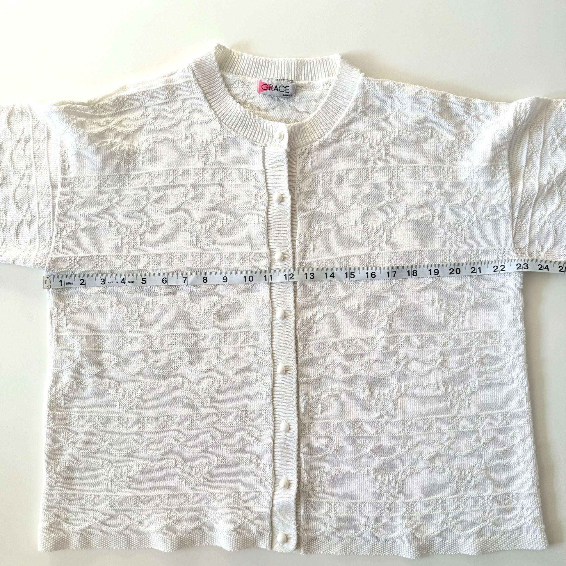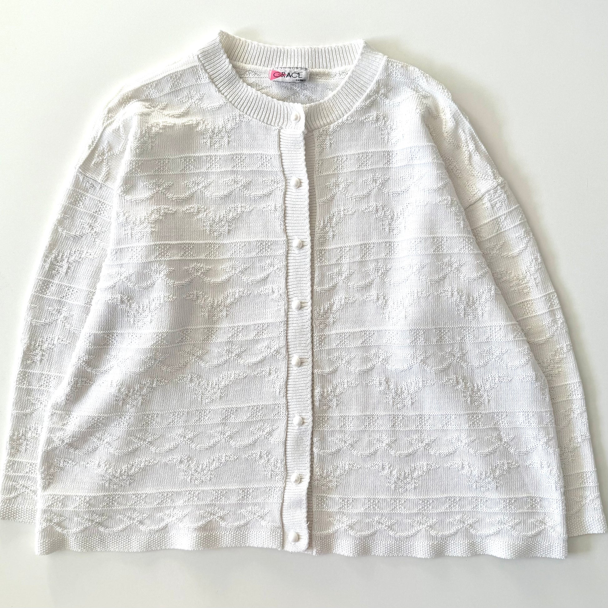 Vintage white button up sweater, with a knit pattern on it. The listed size is based on flat measurements. Please review provided measurements for the best fit for you.