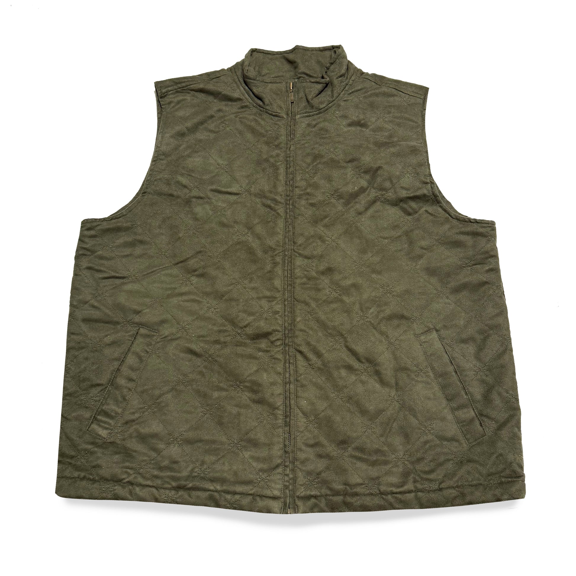 Vintage suede textured green zip up vest, with snowflakes or flower like pattern / quilting stitched detail.