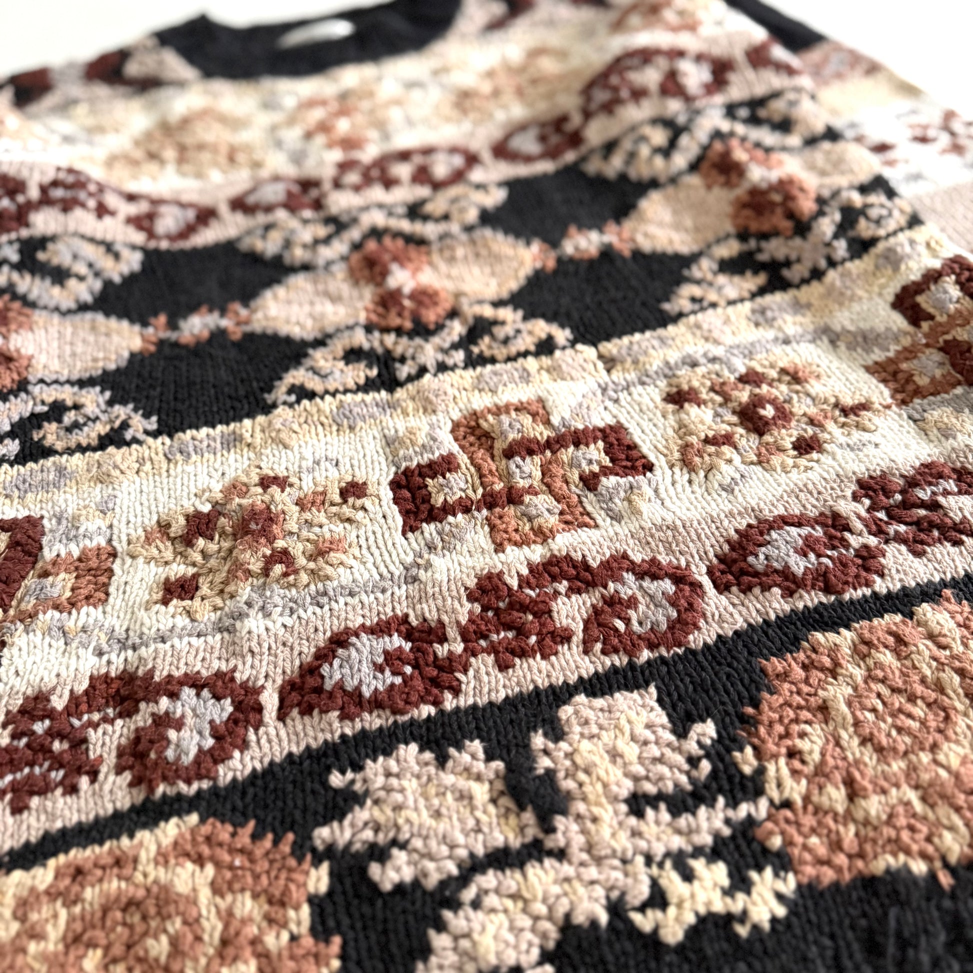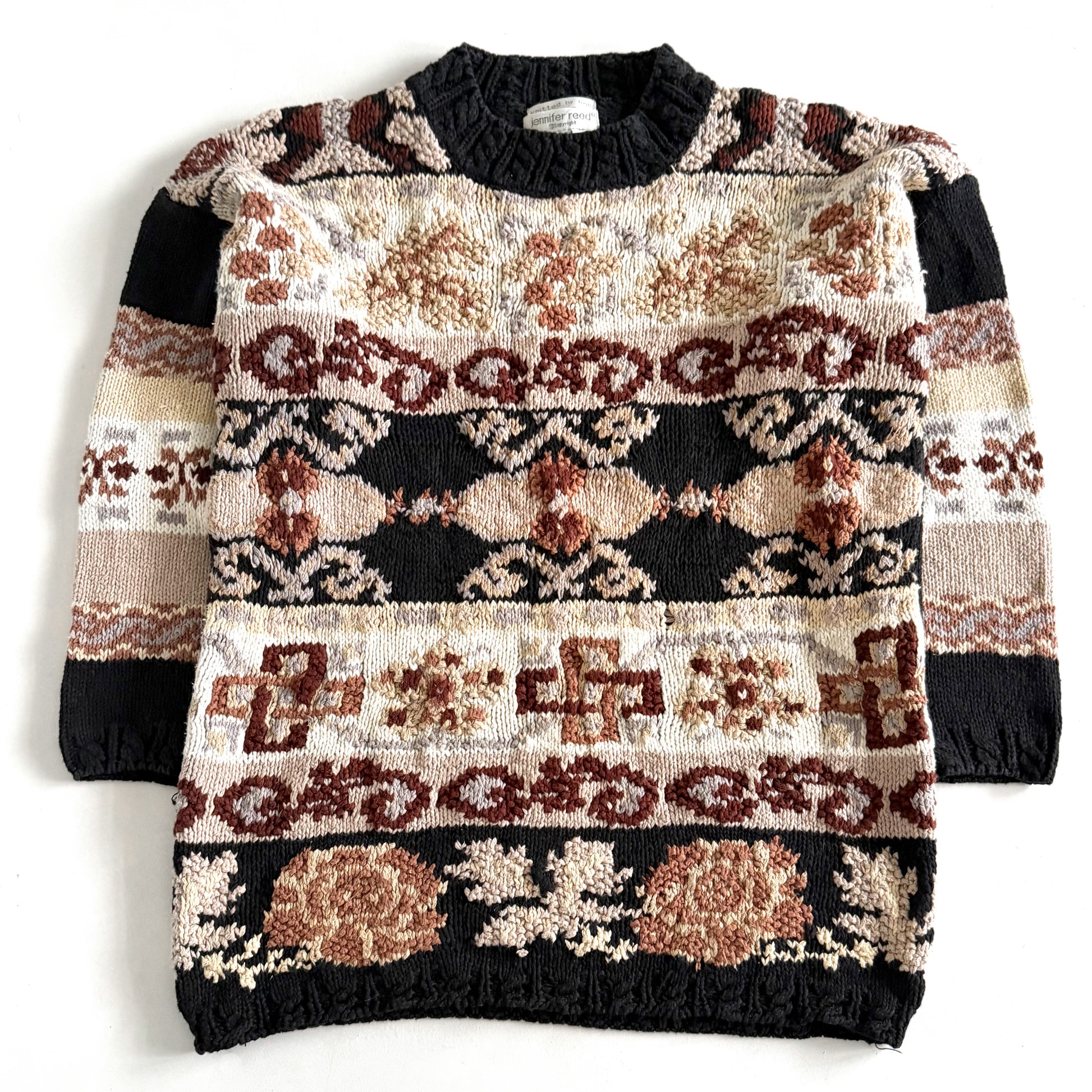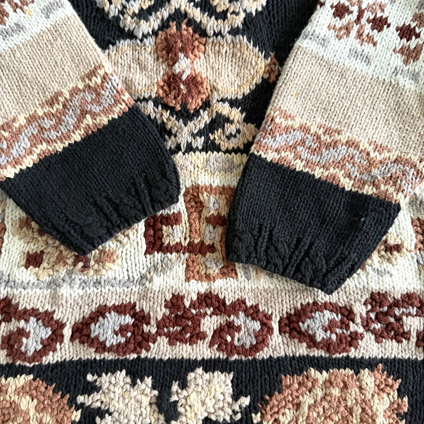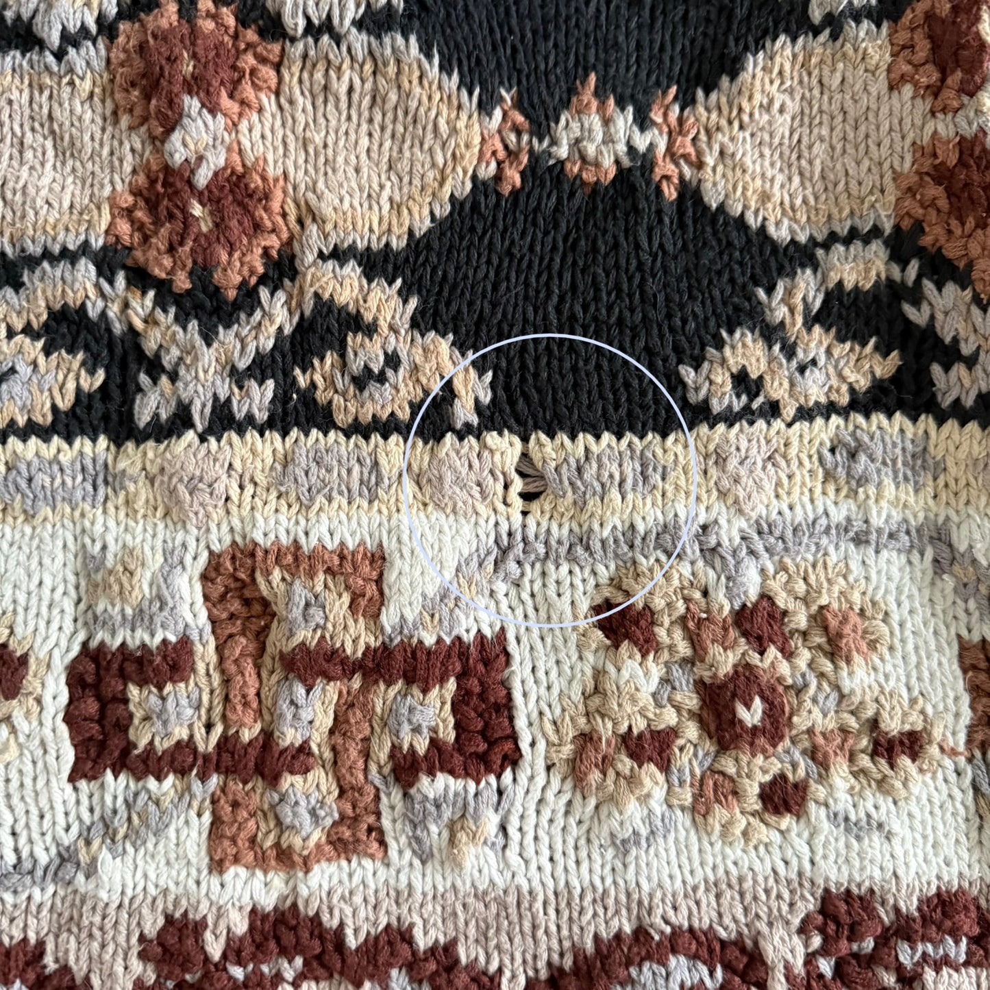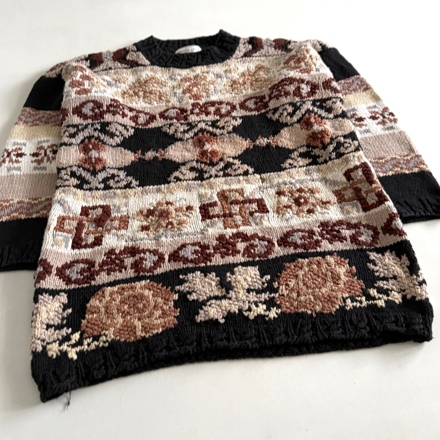 Vintage knit by hand sweater, with a 3D knit quality. there is a small separation of the knit.