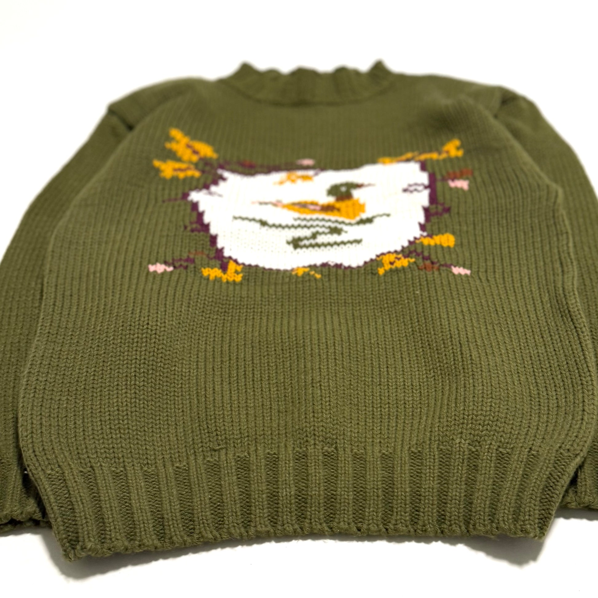 Vintage green mock neck sweater featuring a duck. This apparel has shoulder pads.
