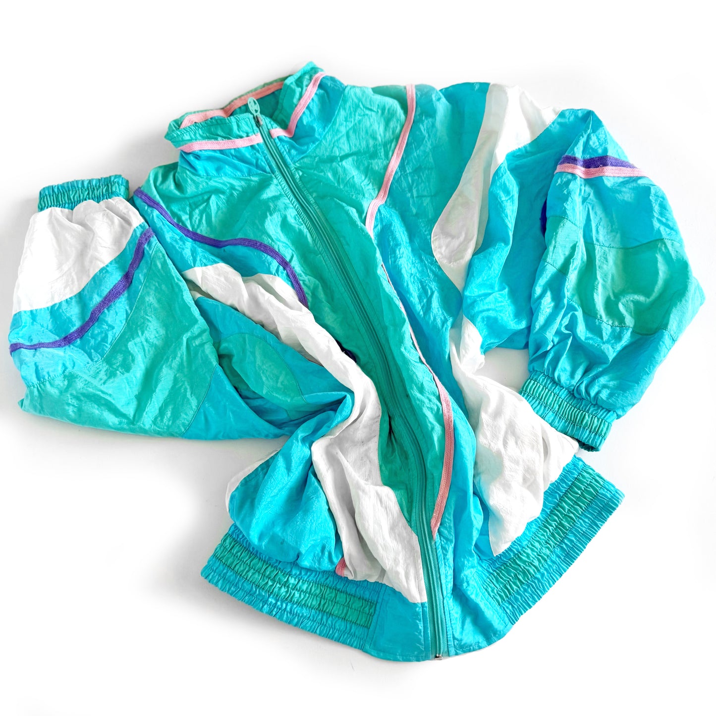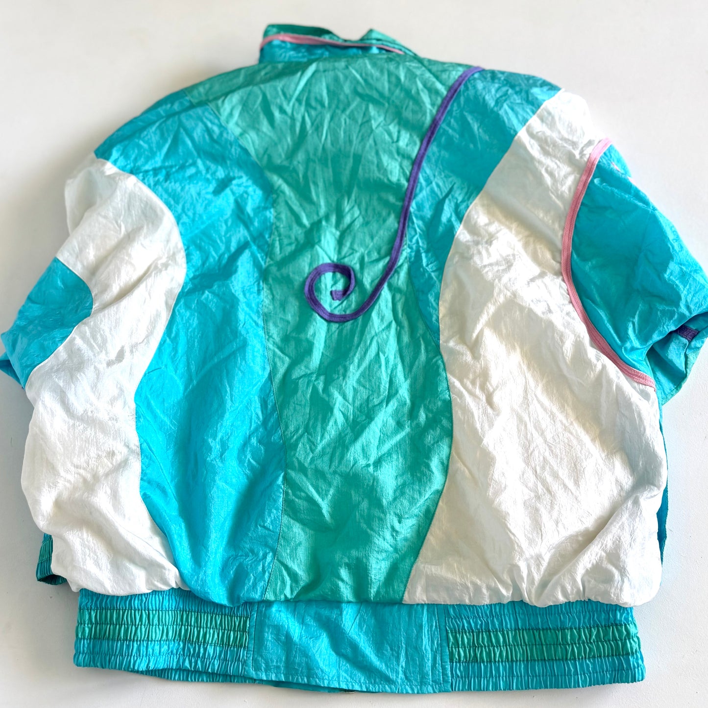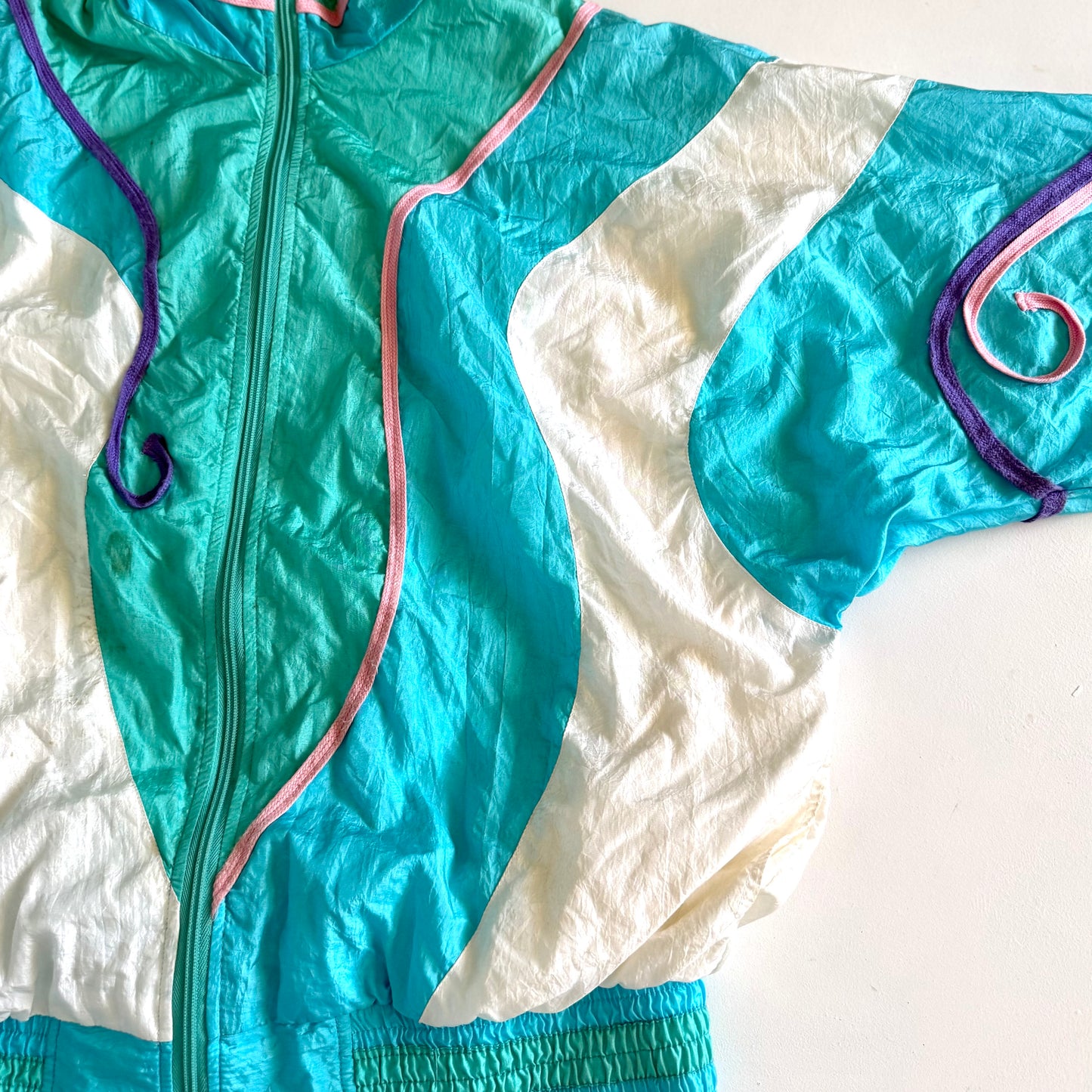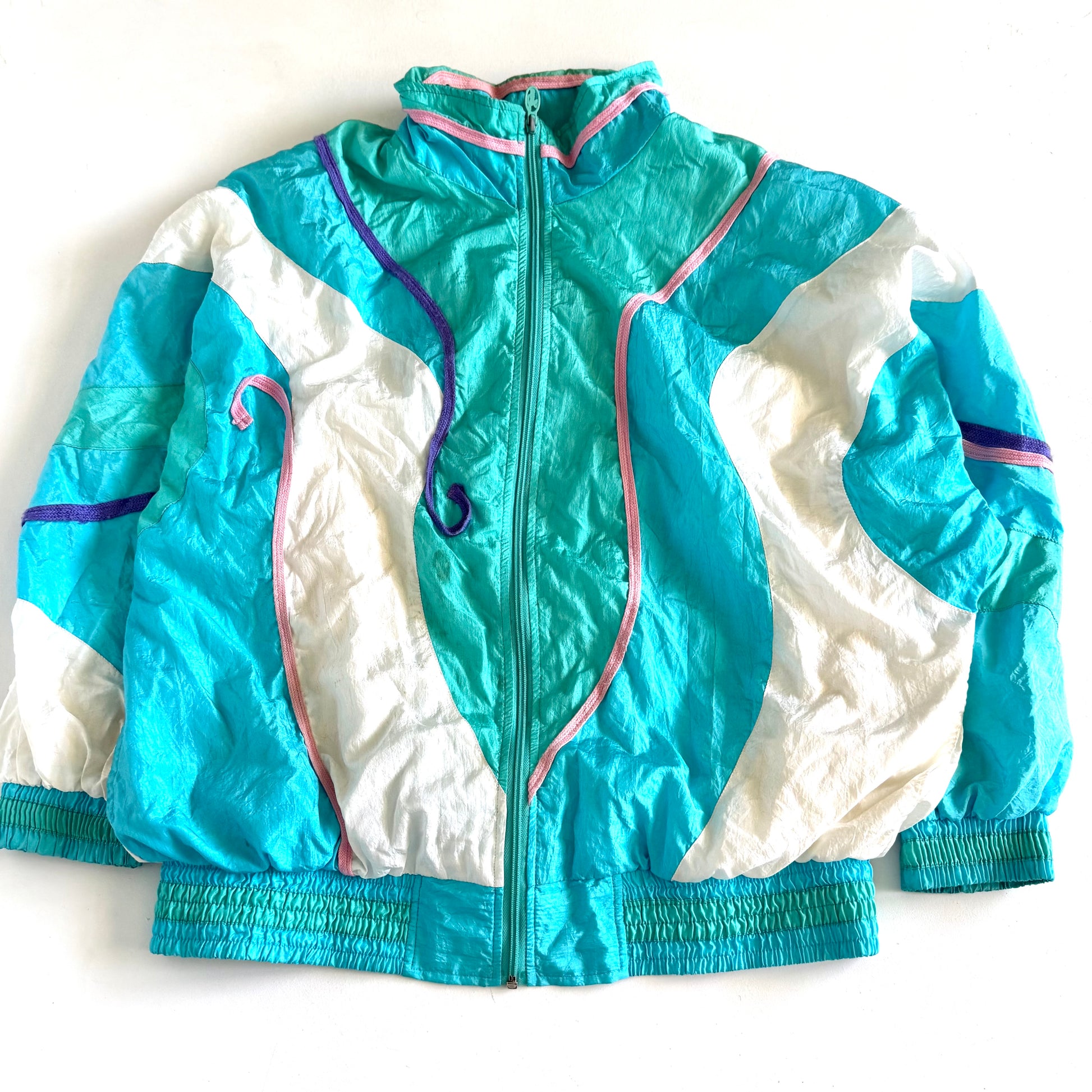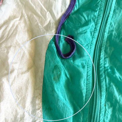 Vintage jacket with a 90's windbreaker style. There is a small stain on the front of the apparel and discolouration around the collar. This could be worn a size up, please review measurements.