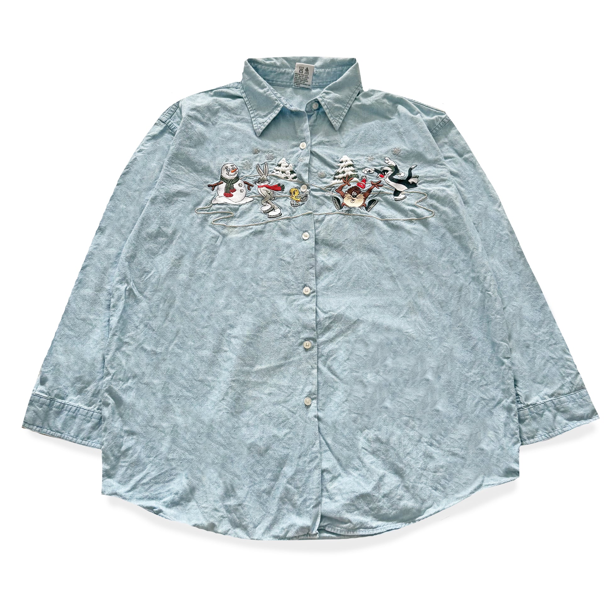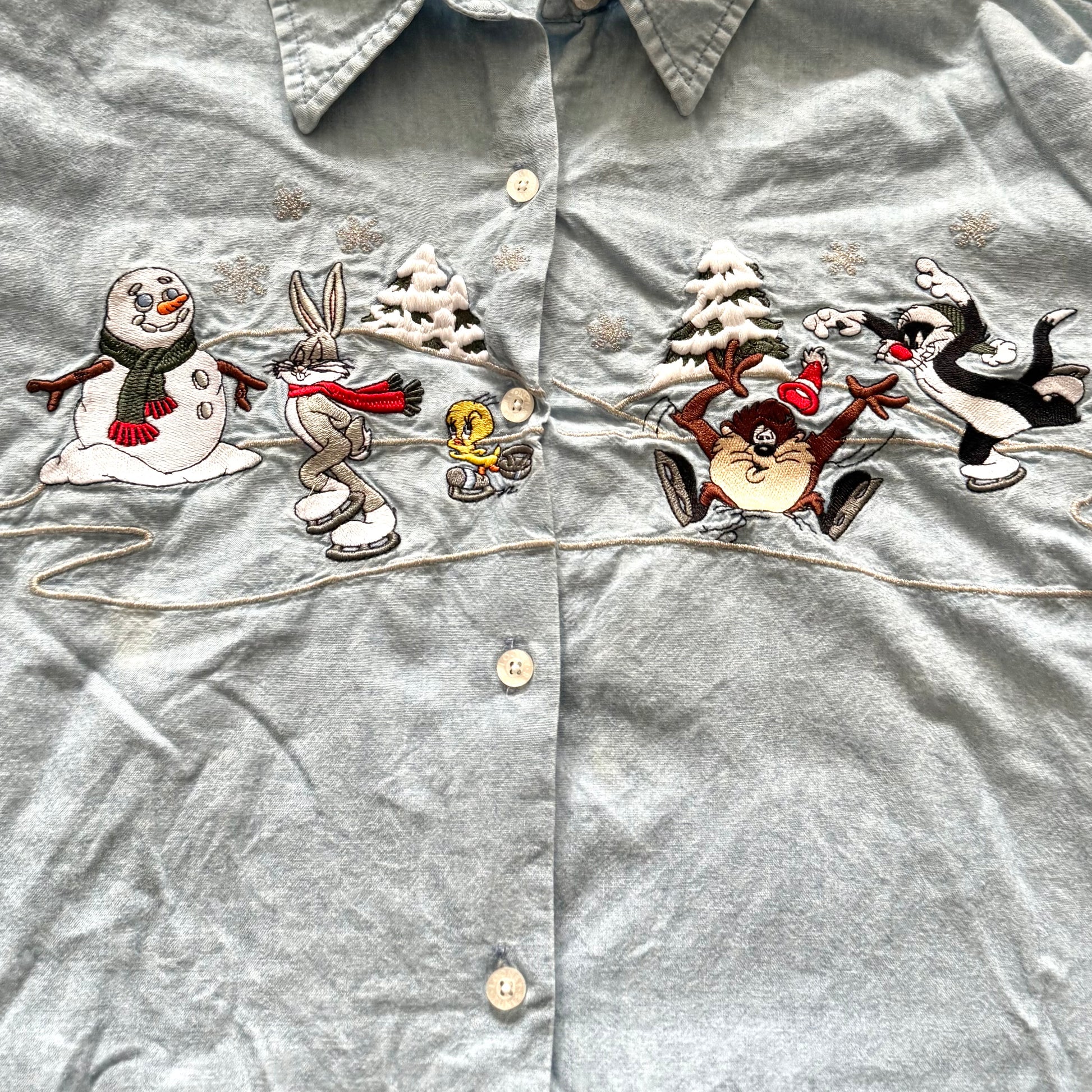Vintage Looney Tunes, Christmas Denim Button Up Shirt