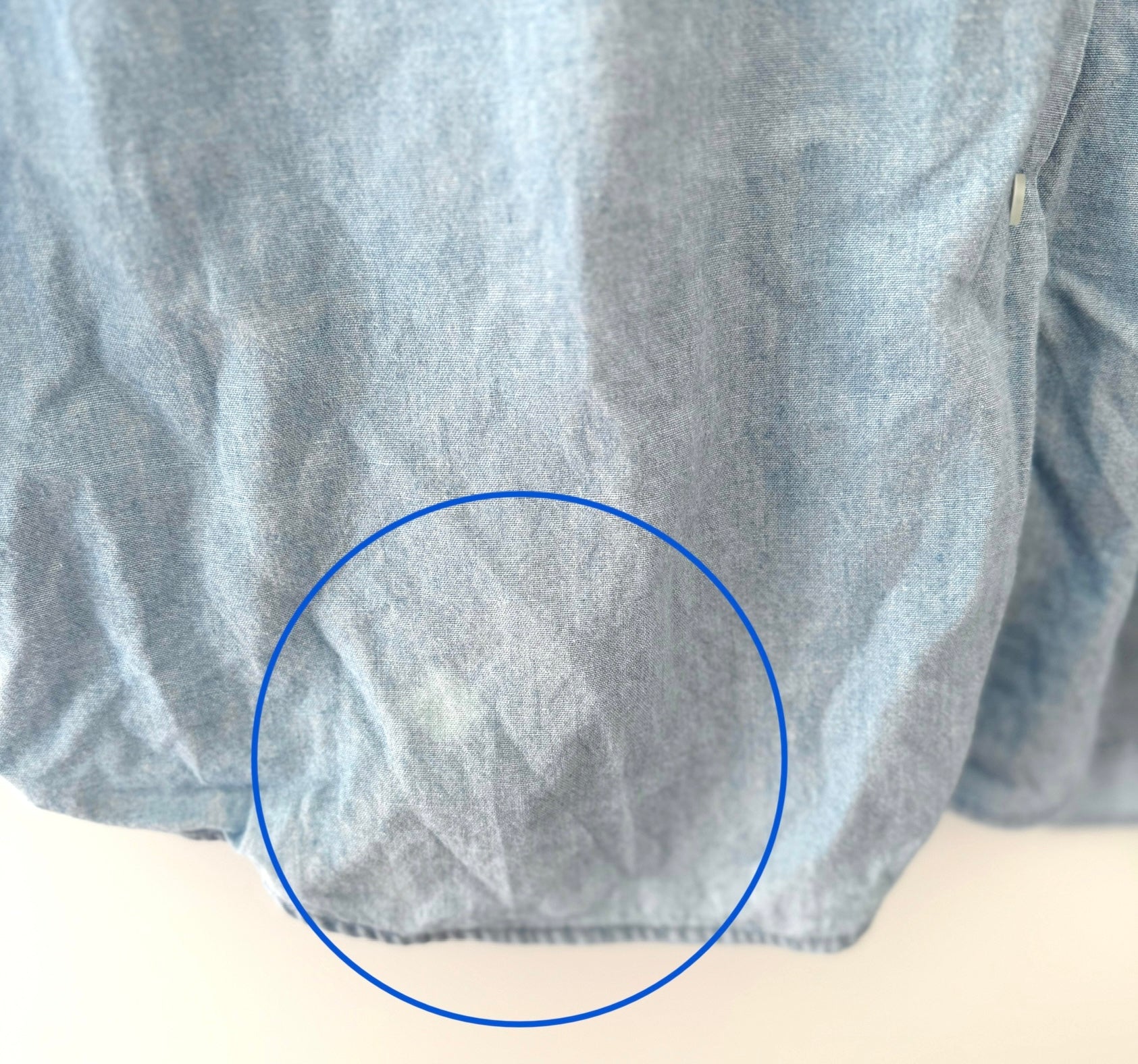 Vintage 1998 denim button down shirt, with Looney Tunes characters ice skating embroidered on. There is a discoloured spot on the back (see circled photo).