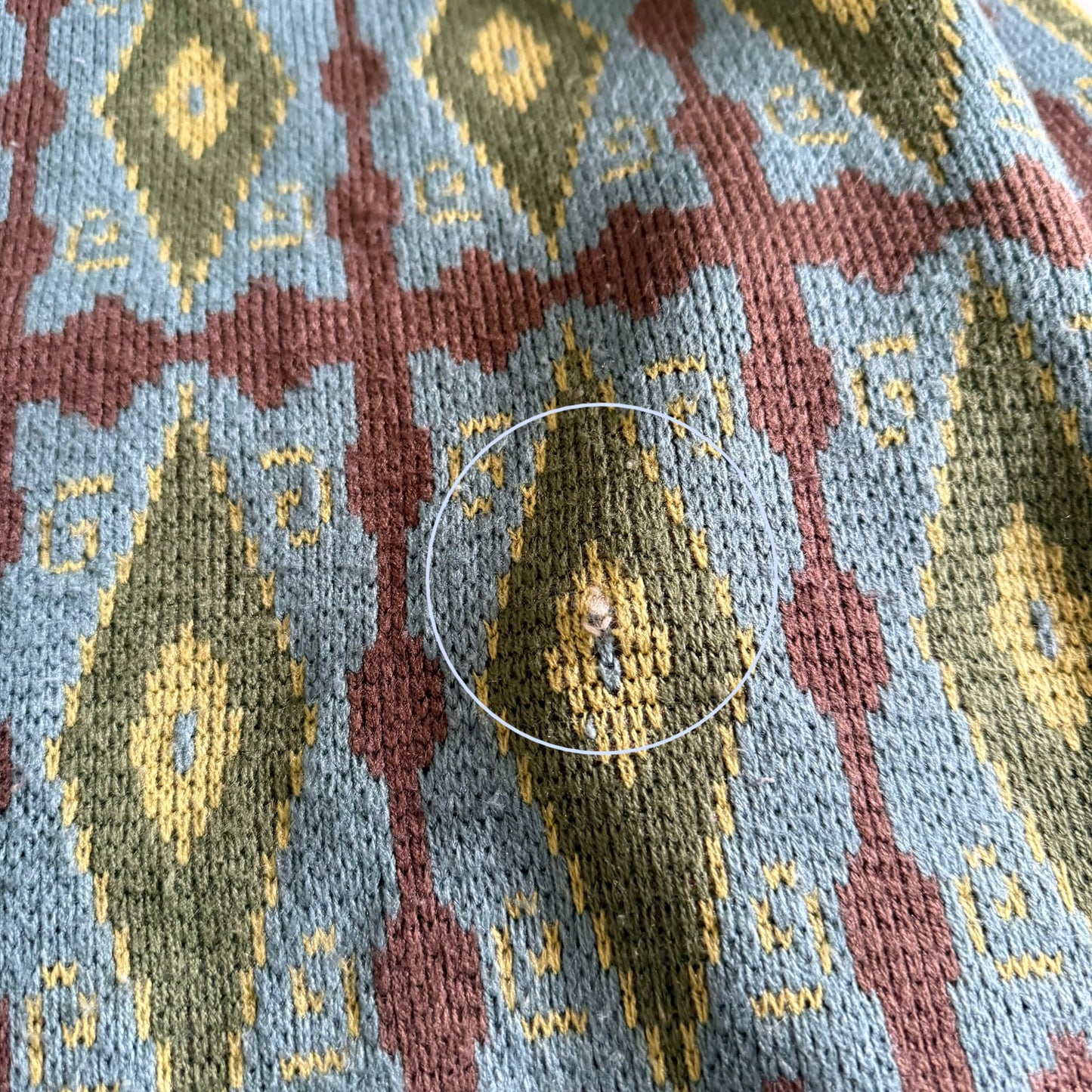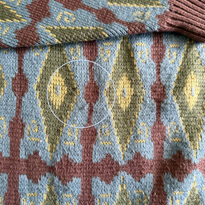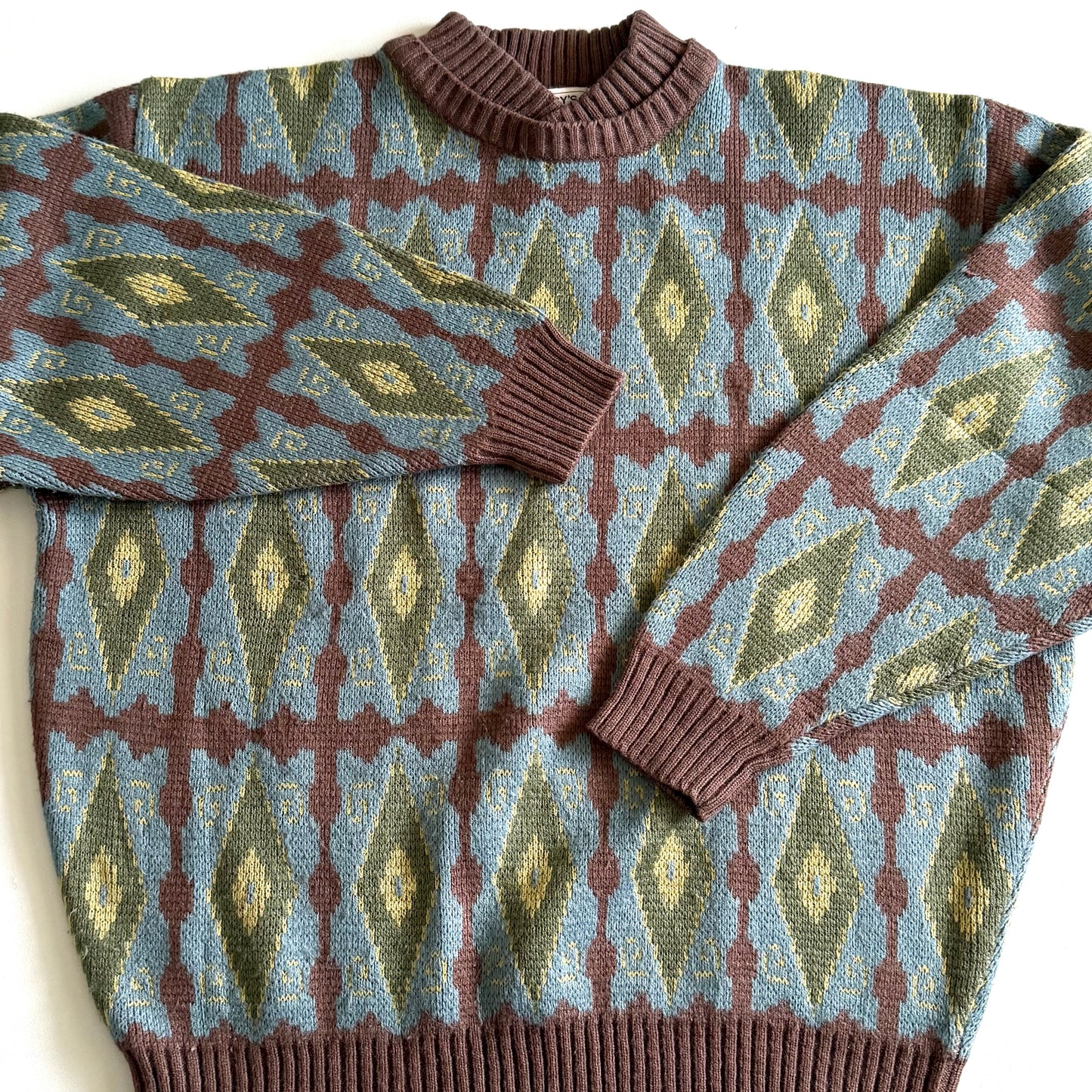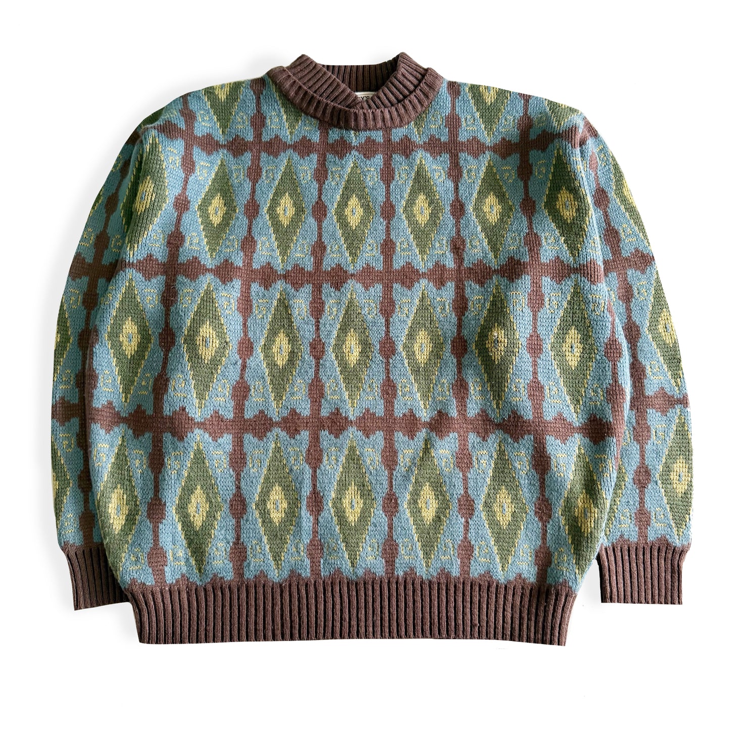 Vintage sweater with a 90's diamond pattern, and a unique collar. There is a small hole and repair on the apparel.