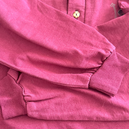 Vintage burgundy shirt, with a faded 90's style cartoon of skiing on it.