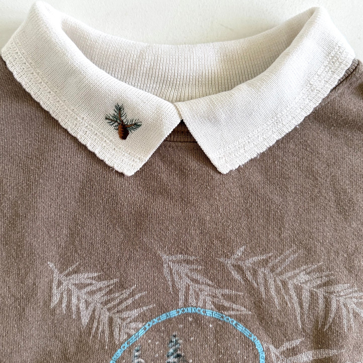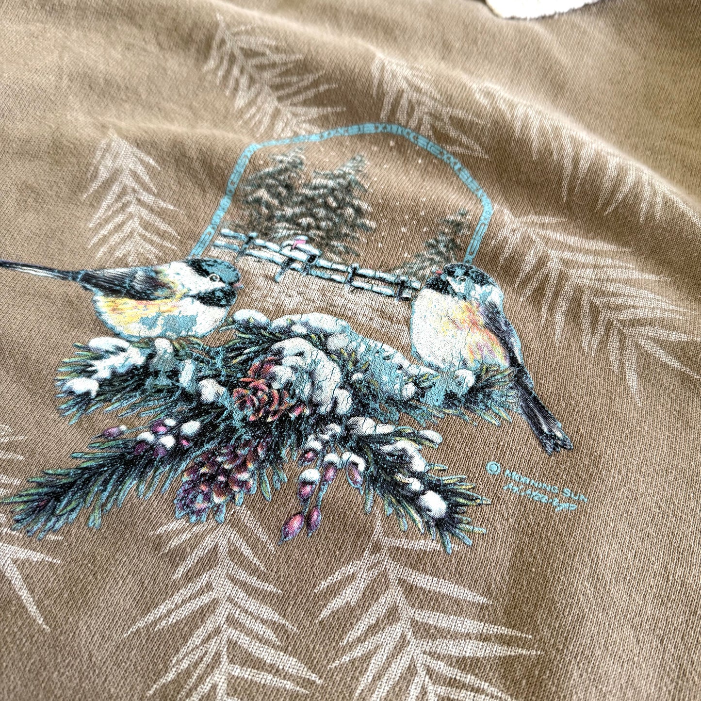 Vintage sweatshirt with two Chickadees on a pine tree with snow, and a collar that has small pinecone image on it. This 90's style sweater has a unique cottagecore vibe.