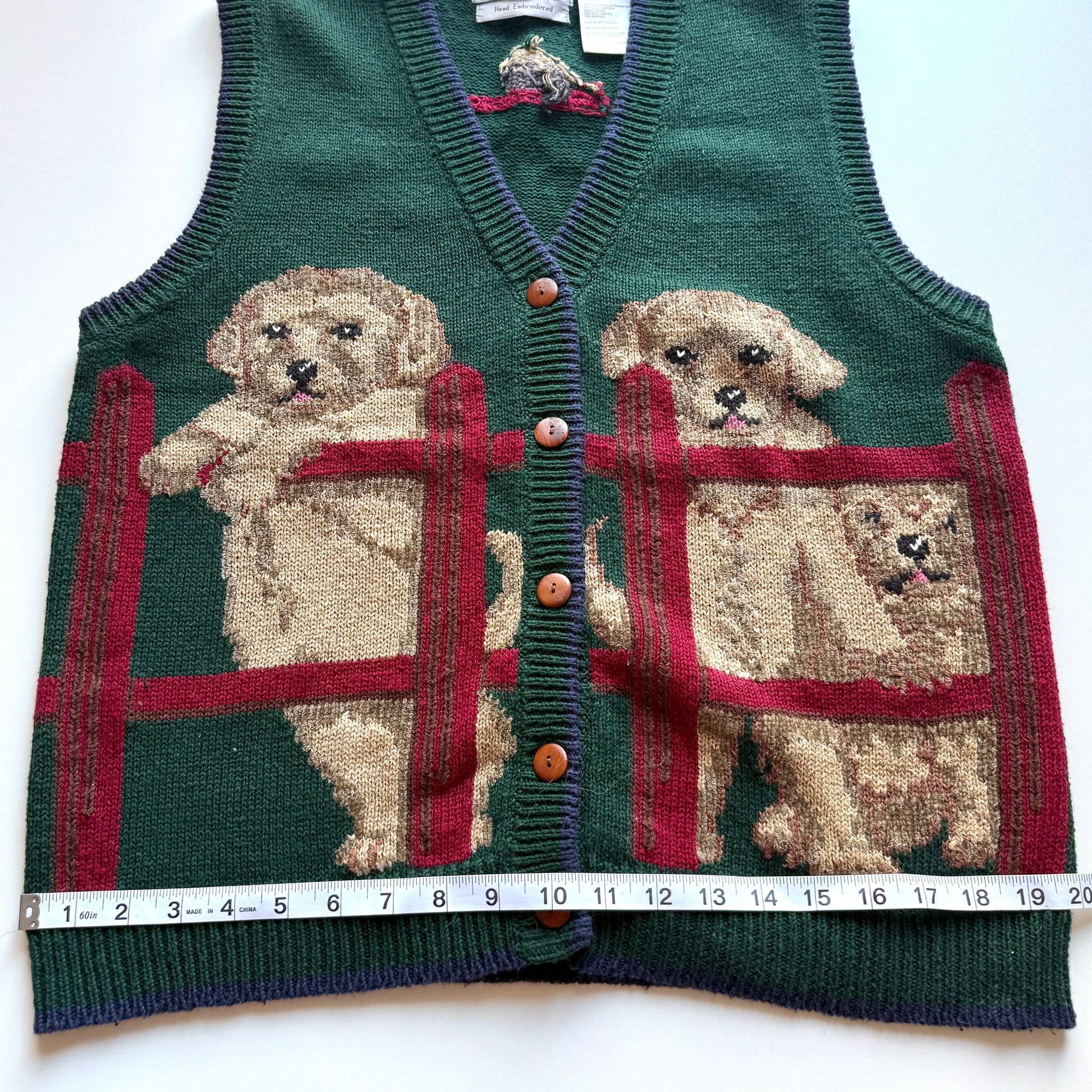 Vintage green vest with blue trim. This 1990's style vest features puppies at a red fence.
