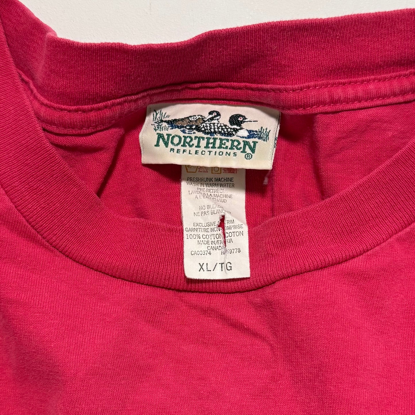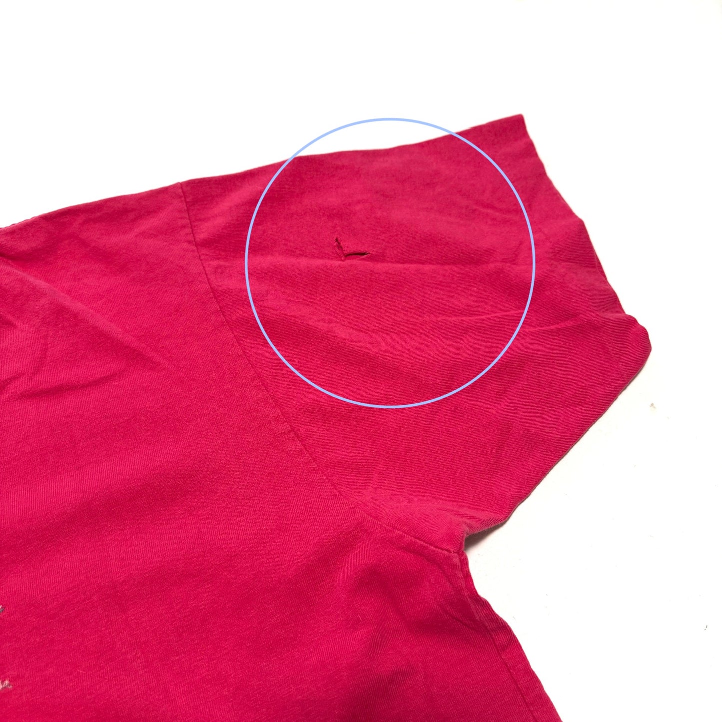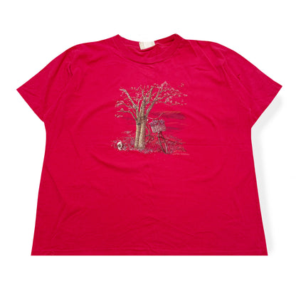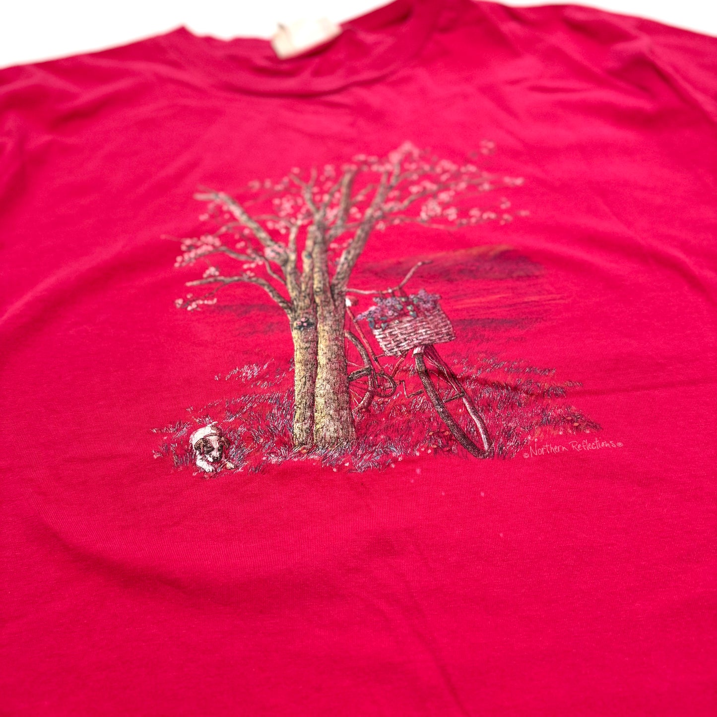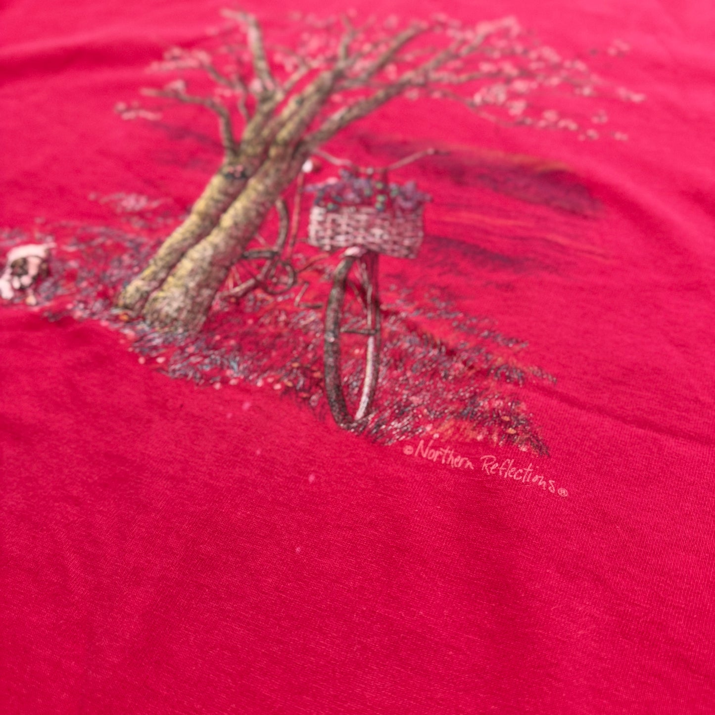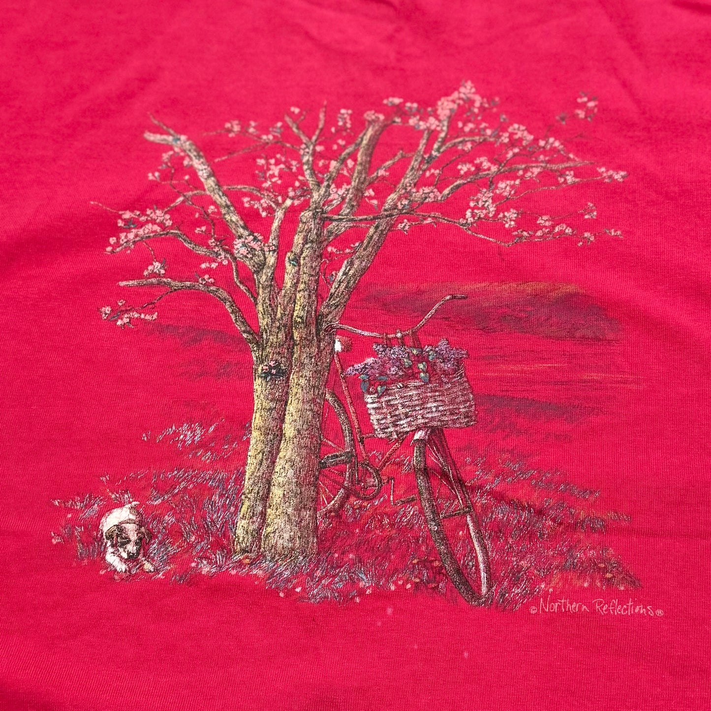 Vintage pink t-shirt, featuring a dog and bike with a basket under a spring tree. There is a defect on the sleeve.