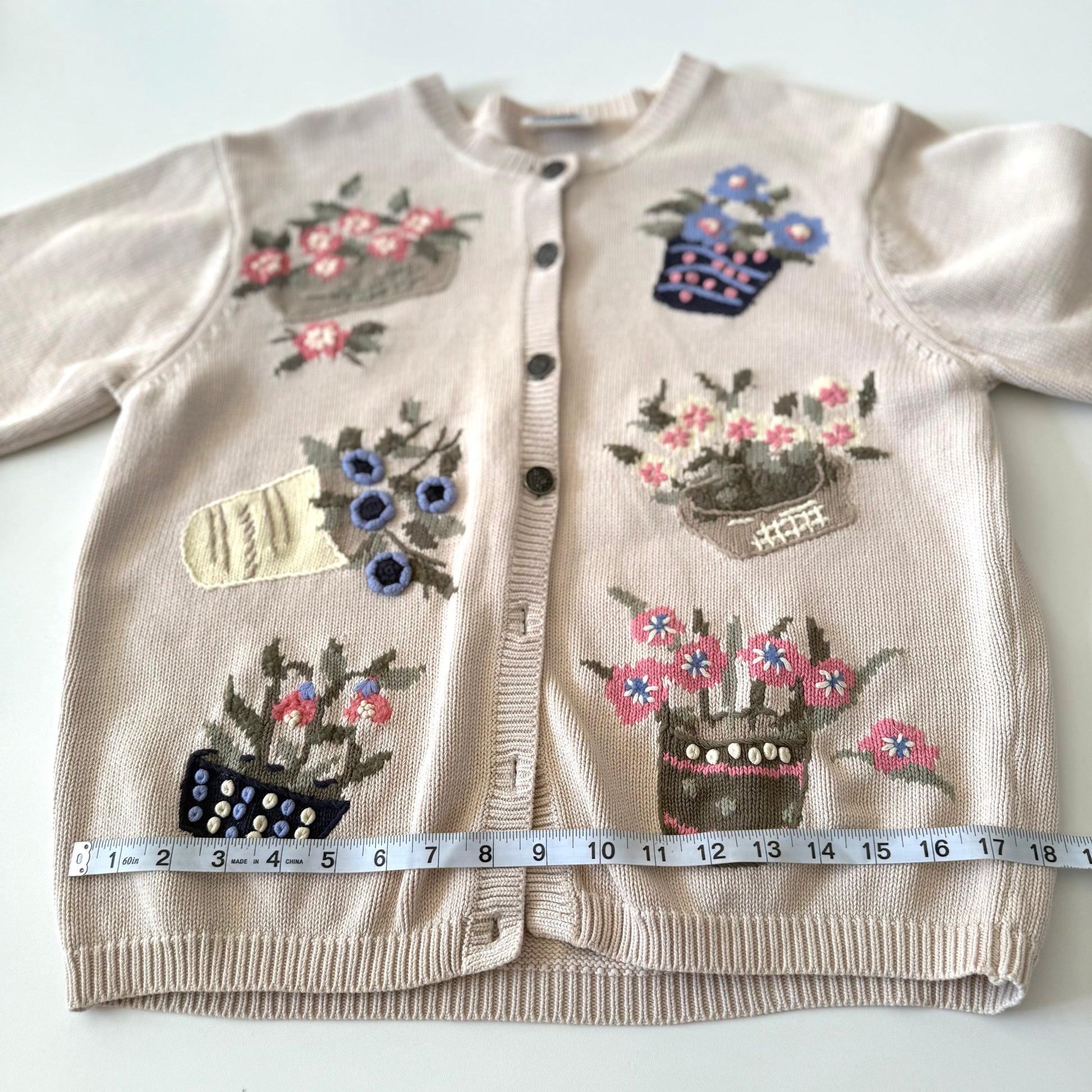 Vintage tan / beige cardigan with various potted flowers on the front with 3D textured details. This sweater is missing the 3 bottom buttons but can still be worn partial buttoned or open. There is some small stains on one sleeve.